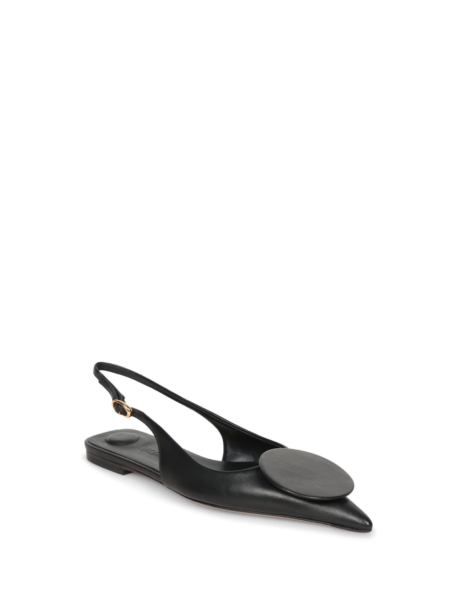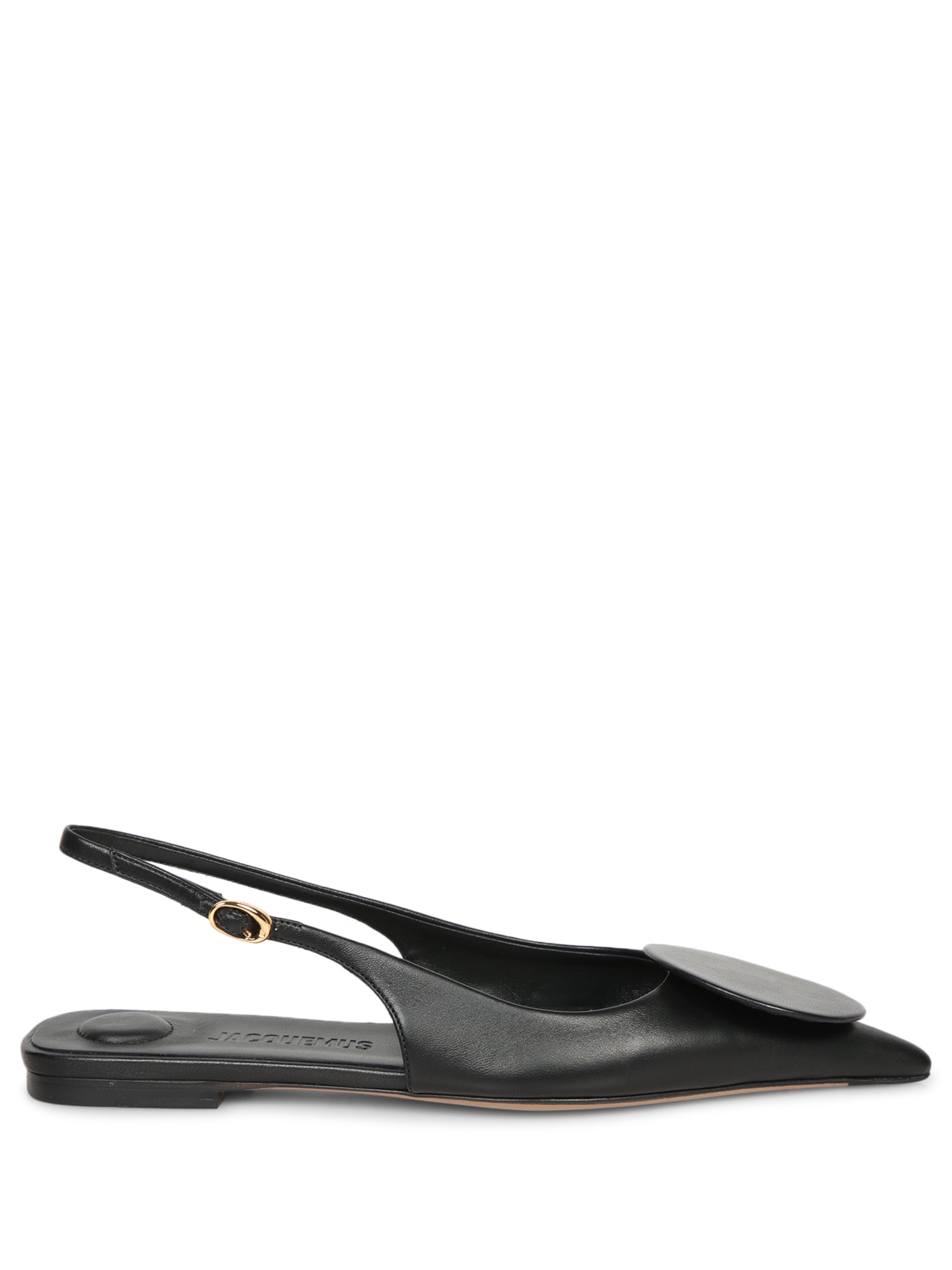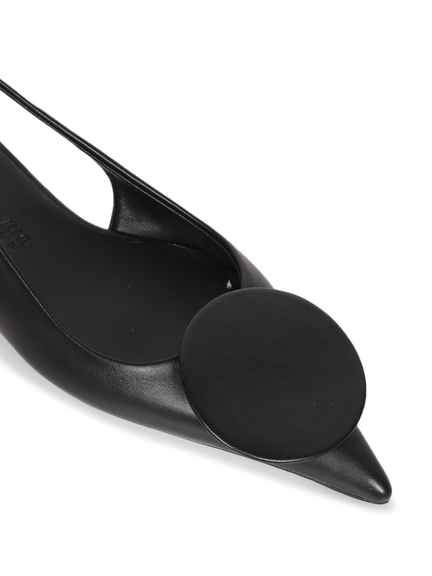Crafted by the avant-garde Jacquemus, this black leather slingback embodies modern elegance with a minimalist flair. It features an innovative asymmetrical design and a custom sole that makes a style statement with every step.
