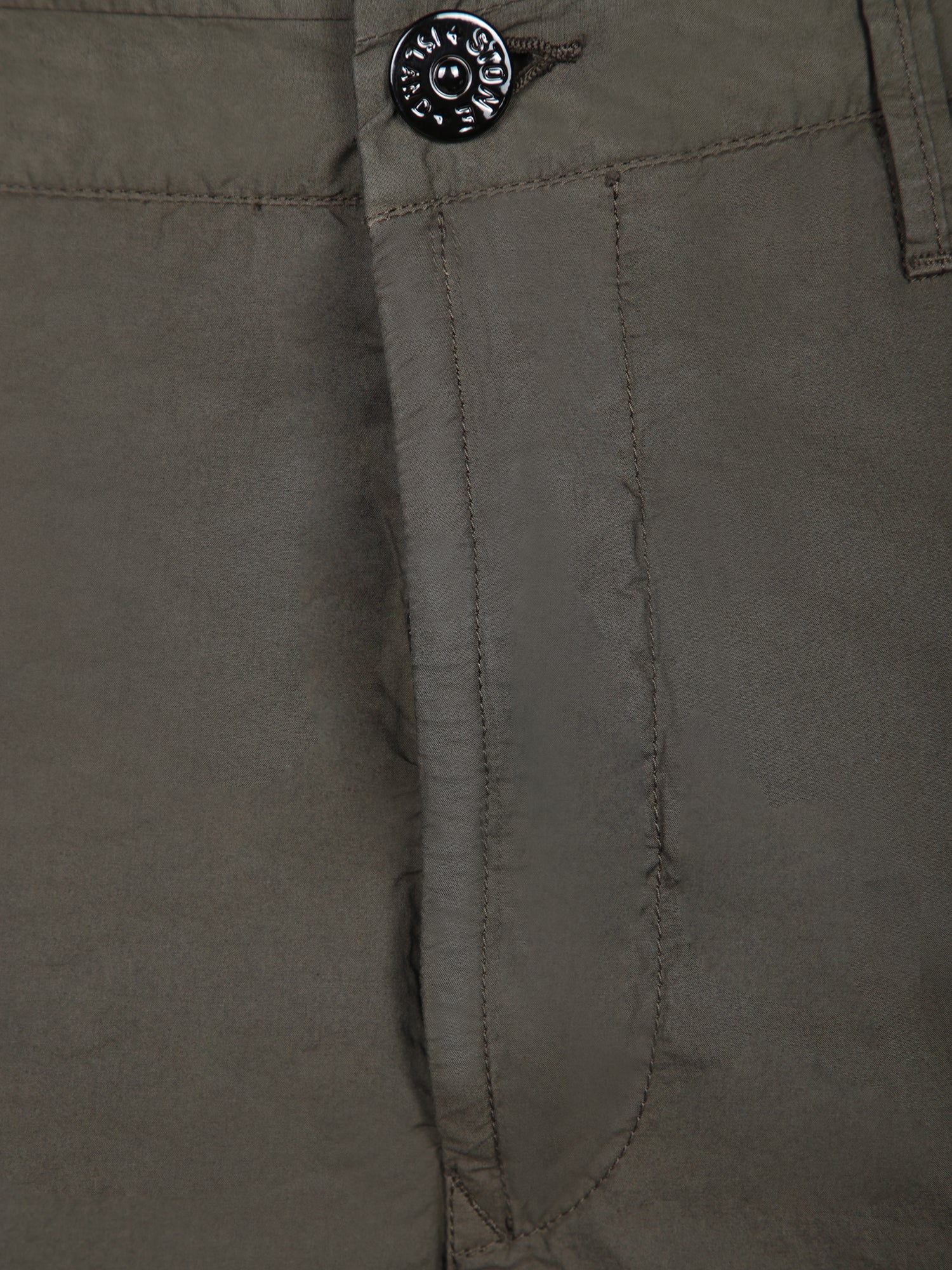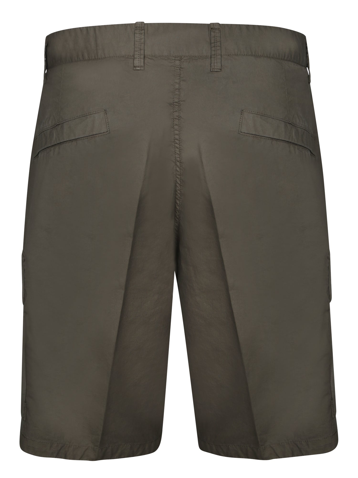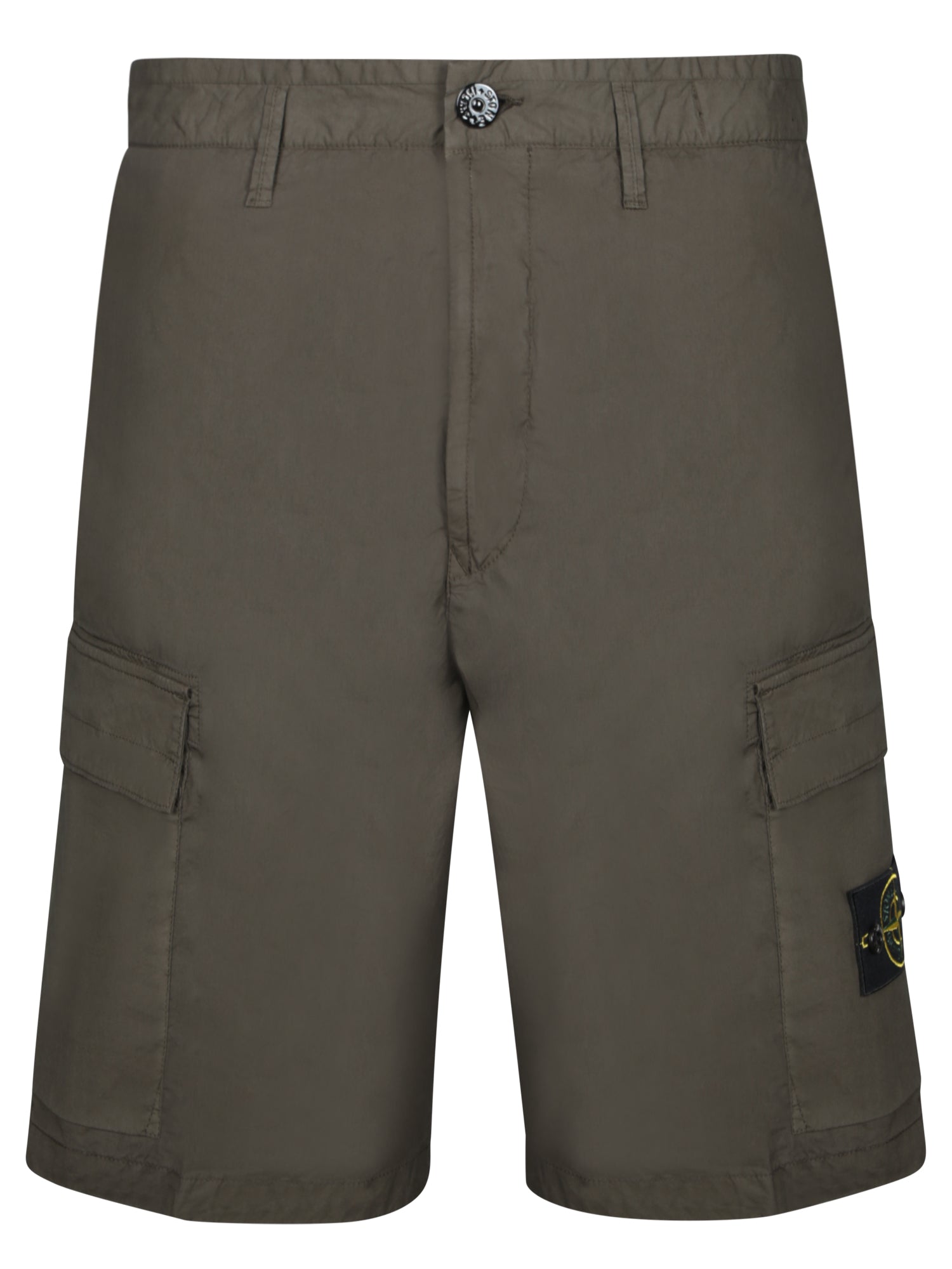 Stone Island parachute fabric Bermuda shorts in military green featuring a functional design with cargo pockets and distinctive brand details, such as the removable badge on the right leg.