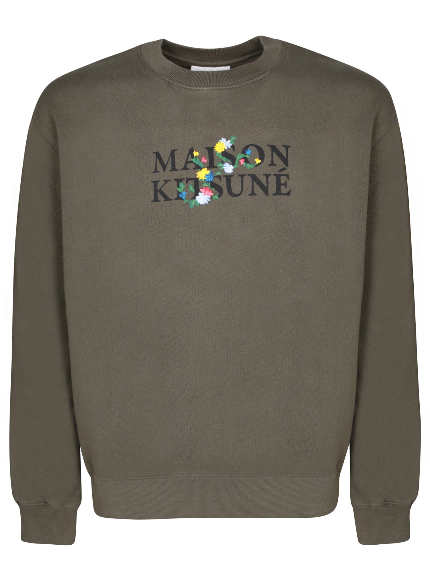 Iconic clean-lined military green sweatshirt, embellished with the Maison Kitsuné logo featuring floral details for an elegantly vibrant touch.