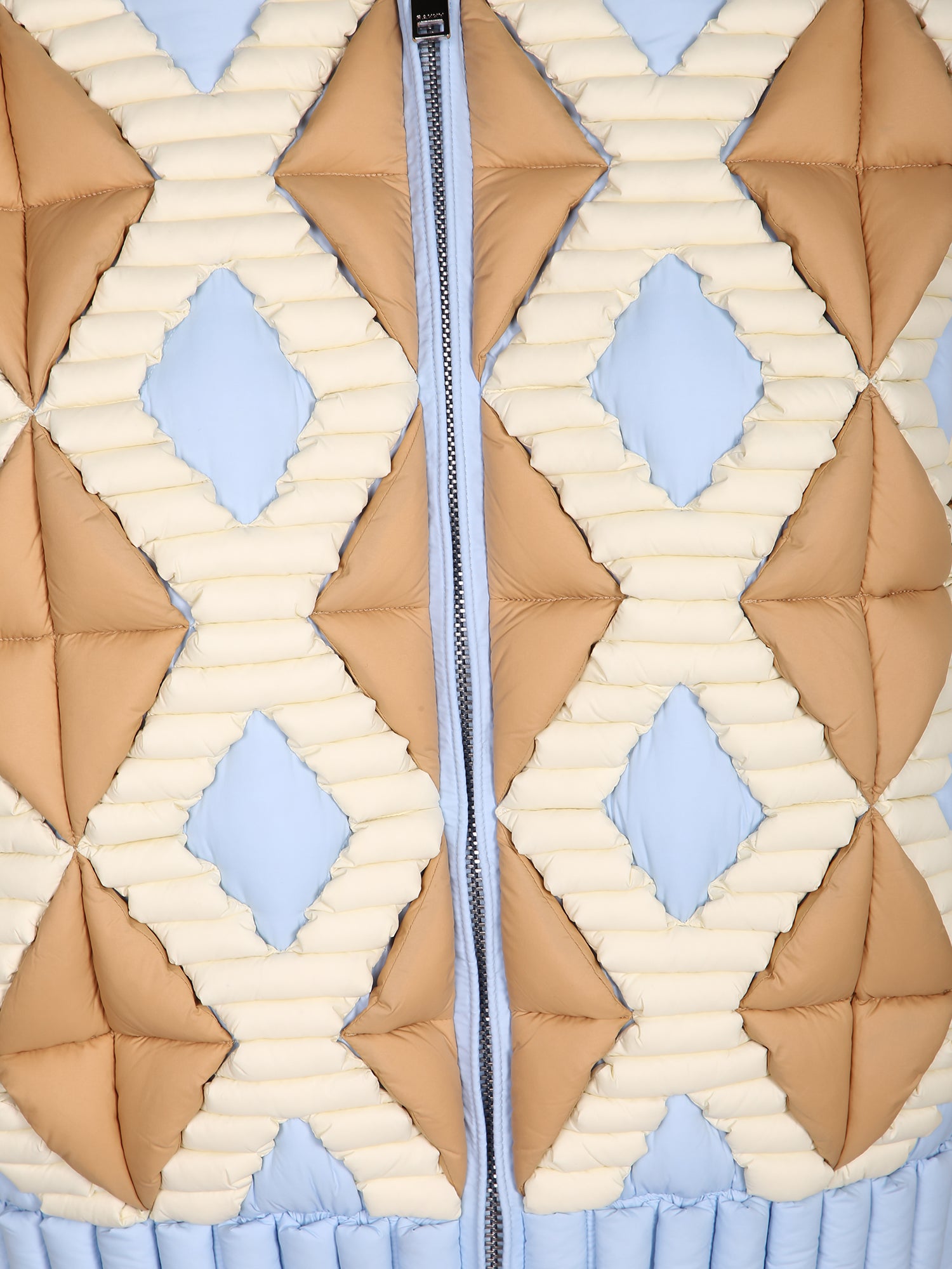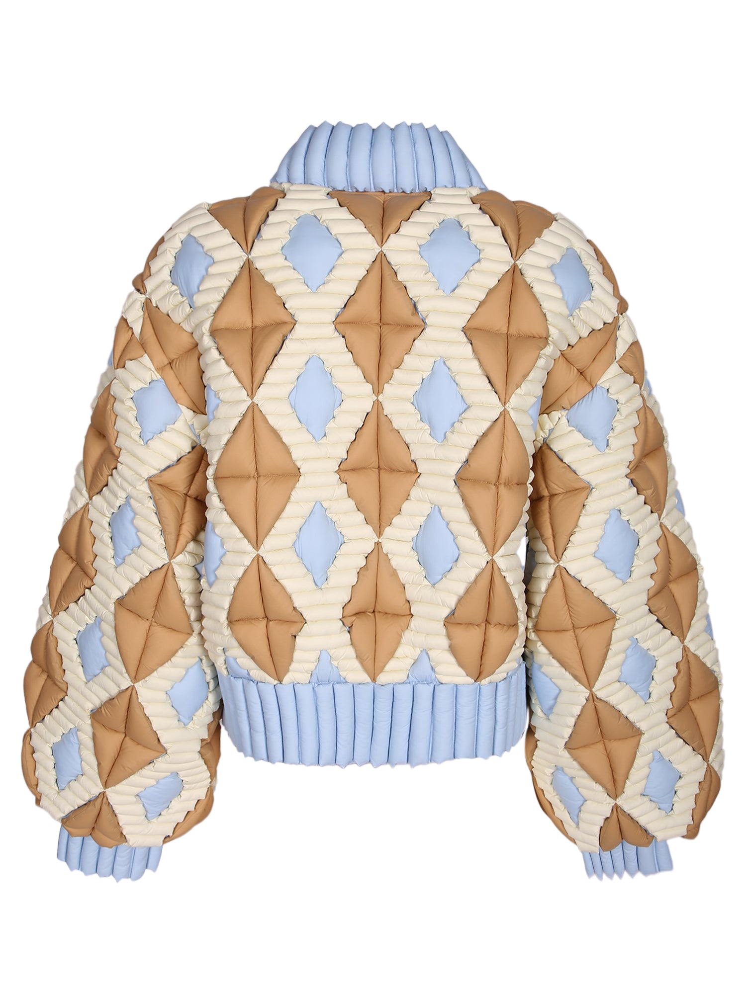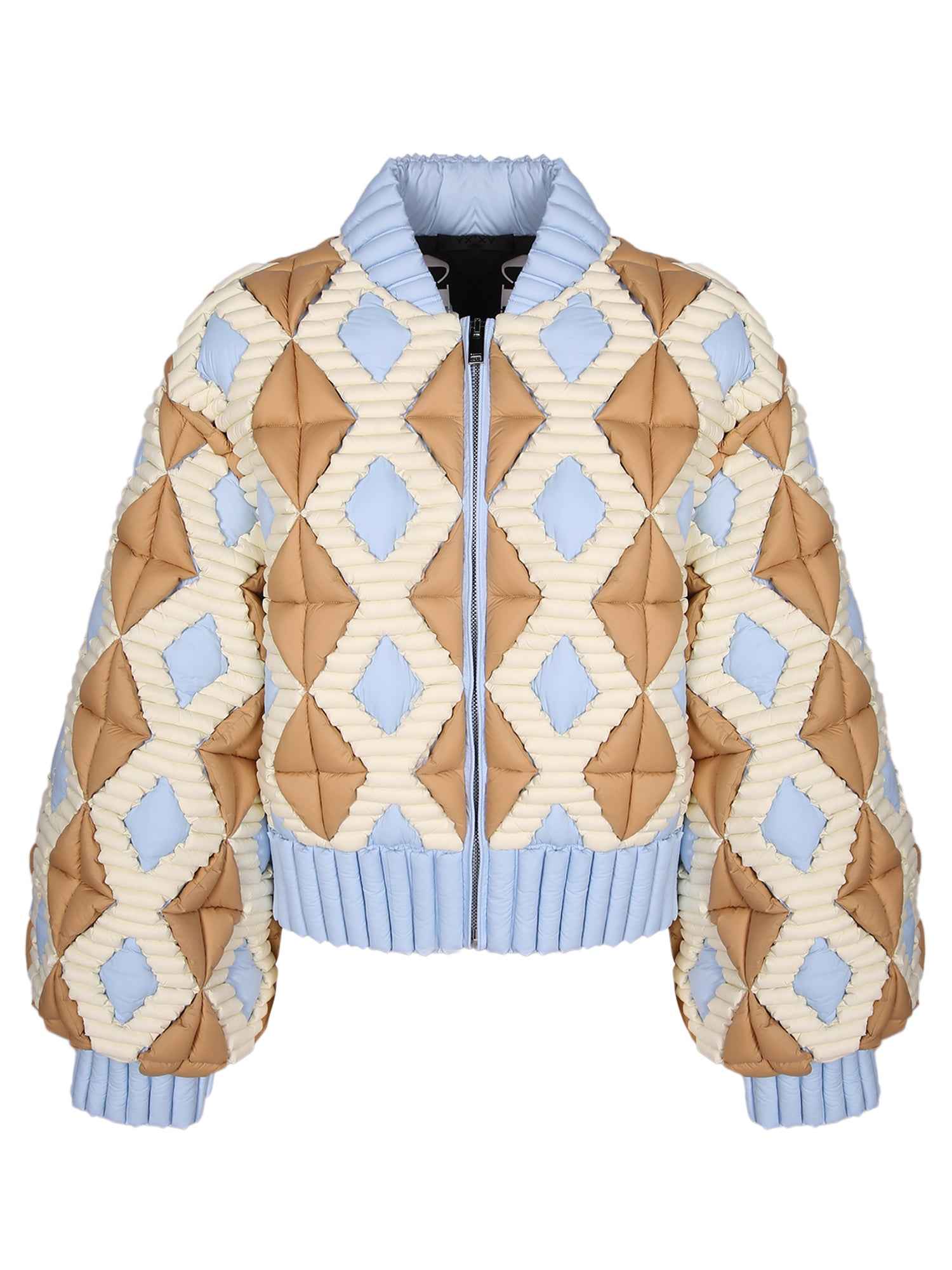 Quilted jacket with diamond pattern. Caramel color with sky blue details. Front zip closure.