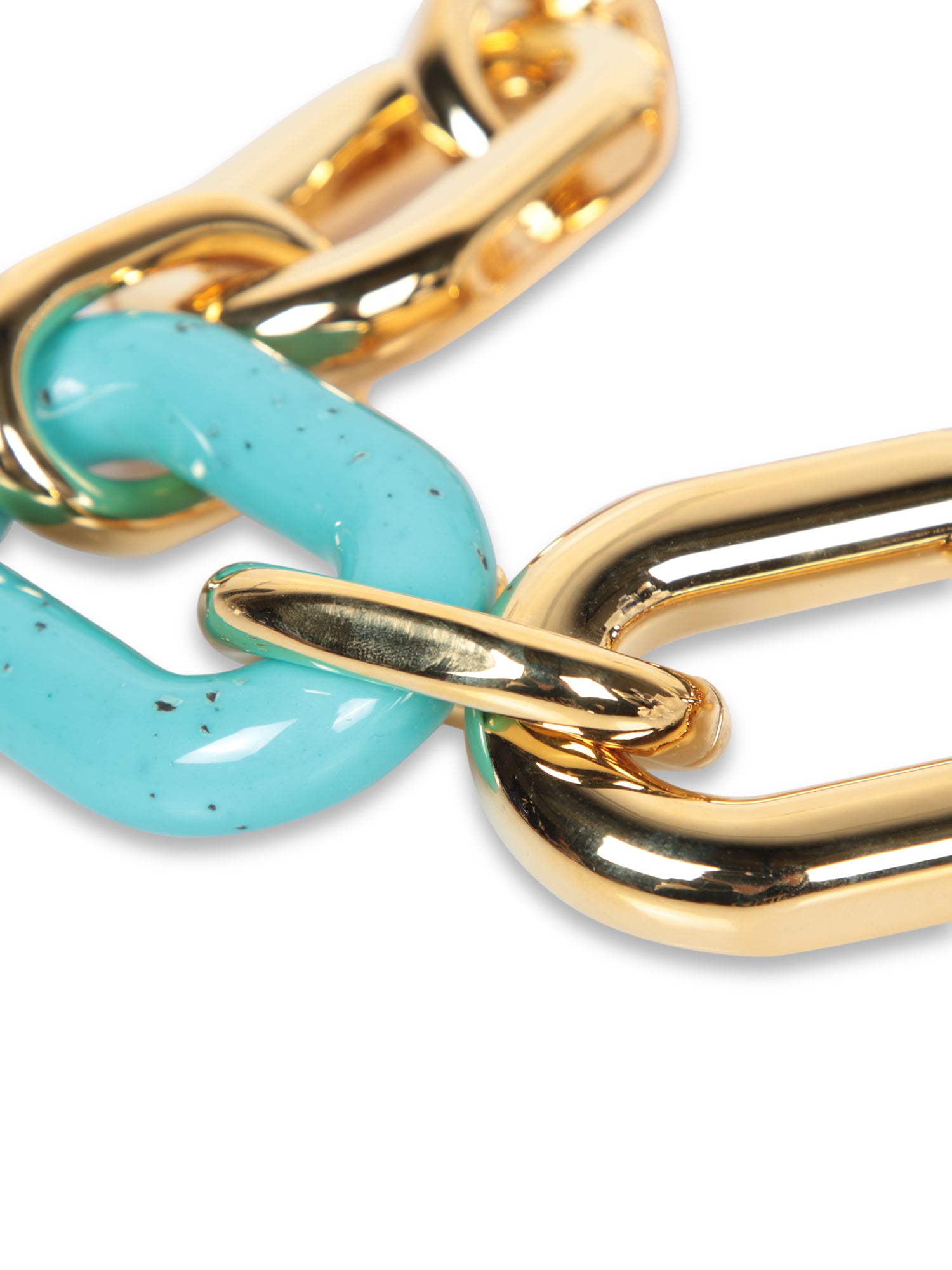 Necklace with oversized gold metal chain links. Turquoise resin link detail.