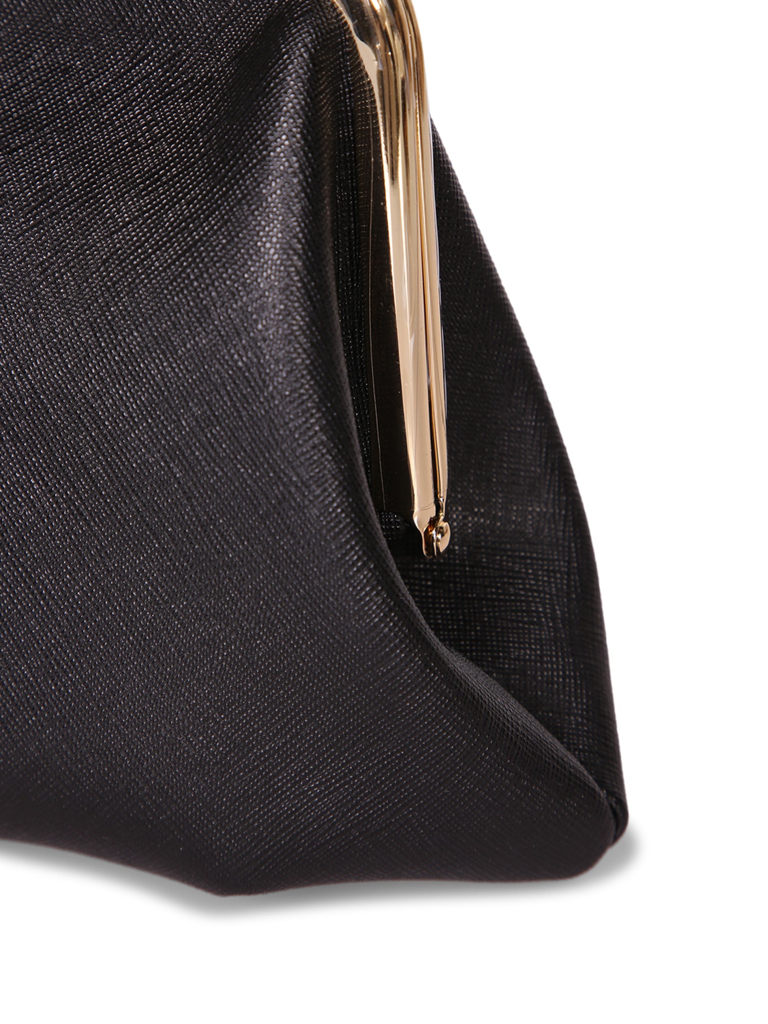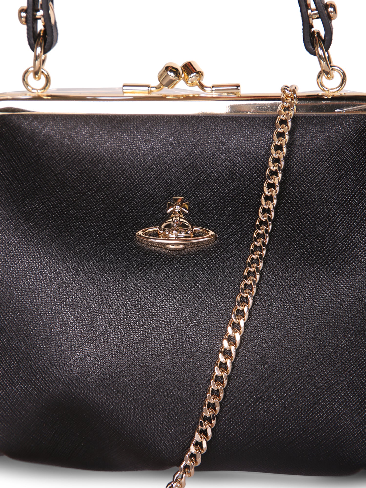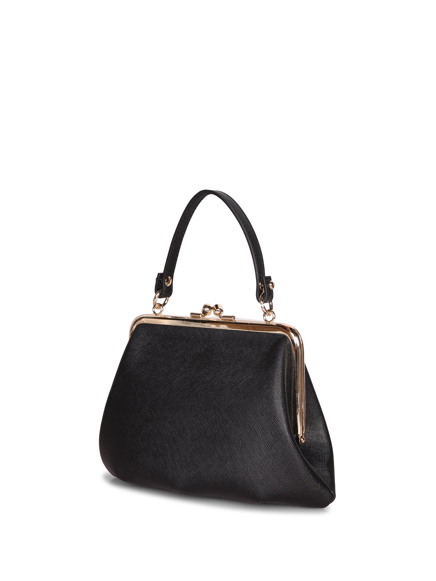 Black leather handbag with golden metallic details. Framed snap closure. Detachable chain strap.