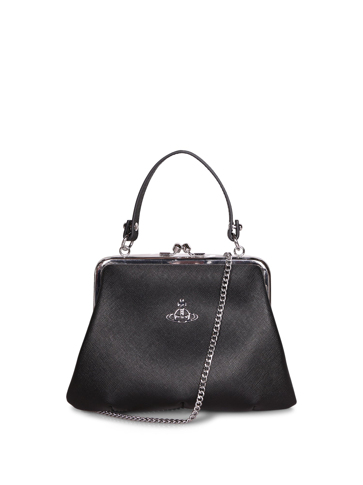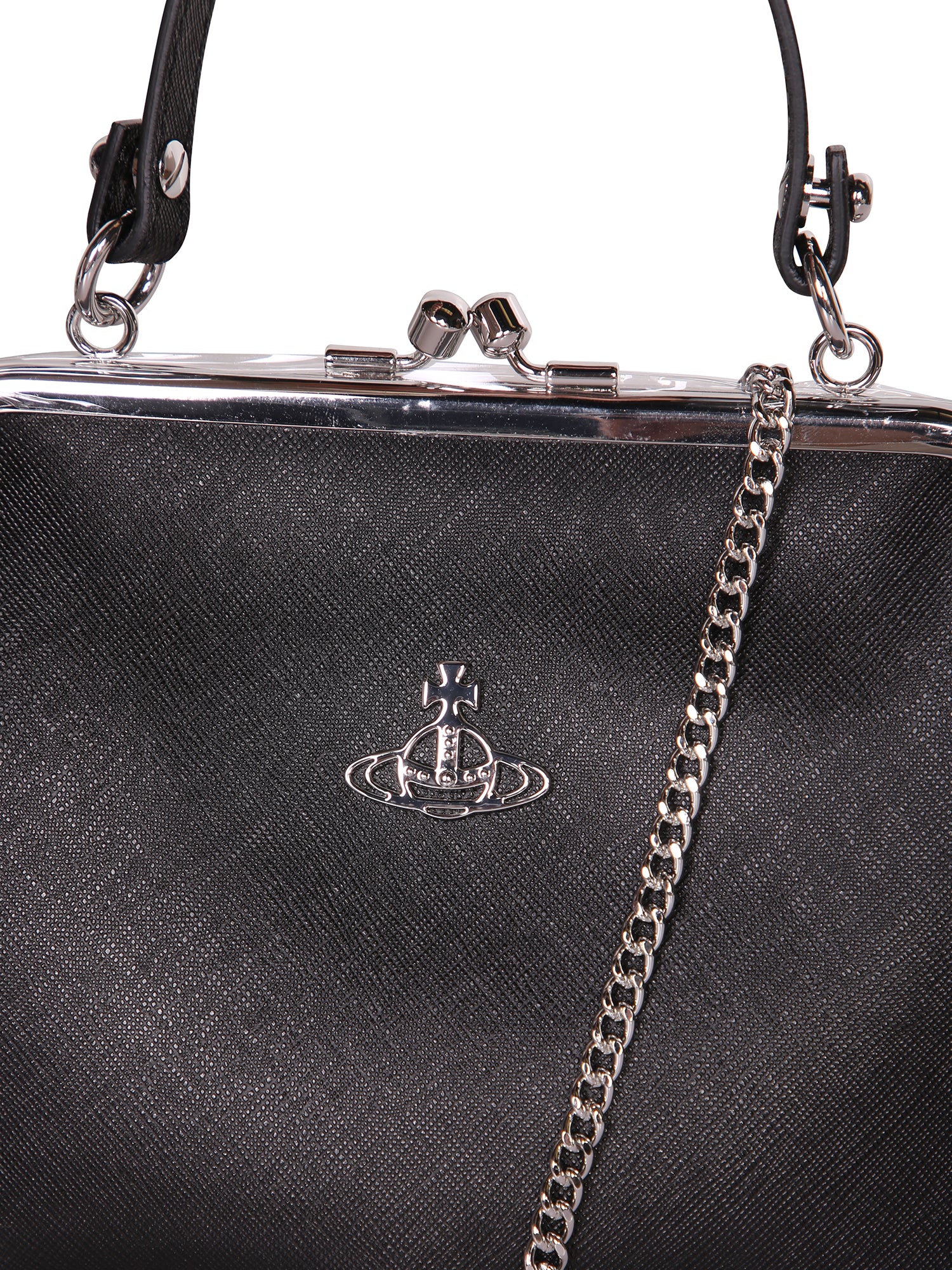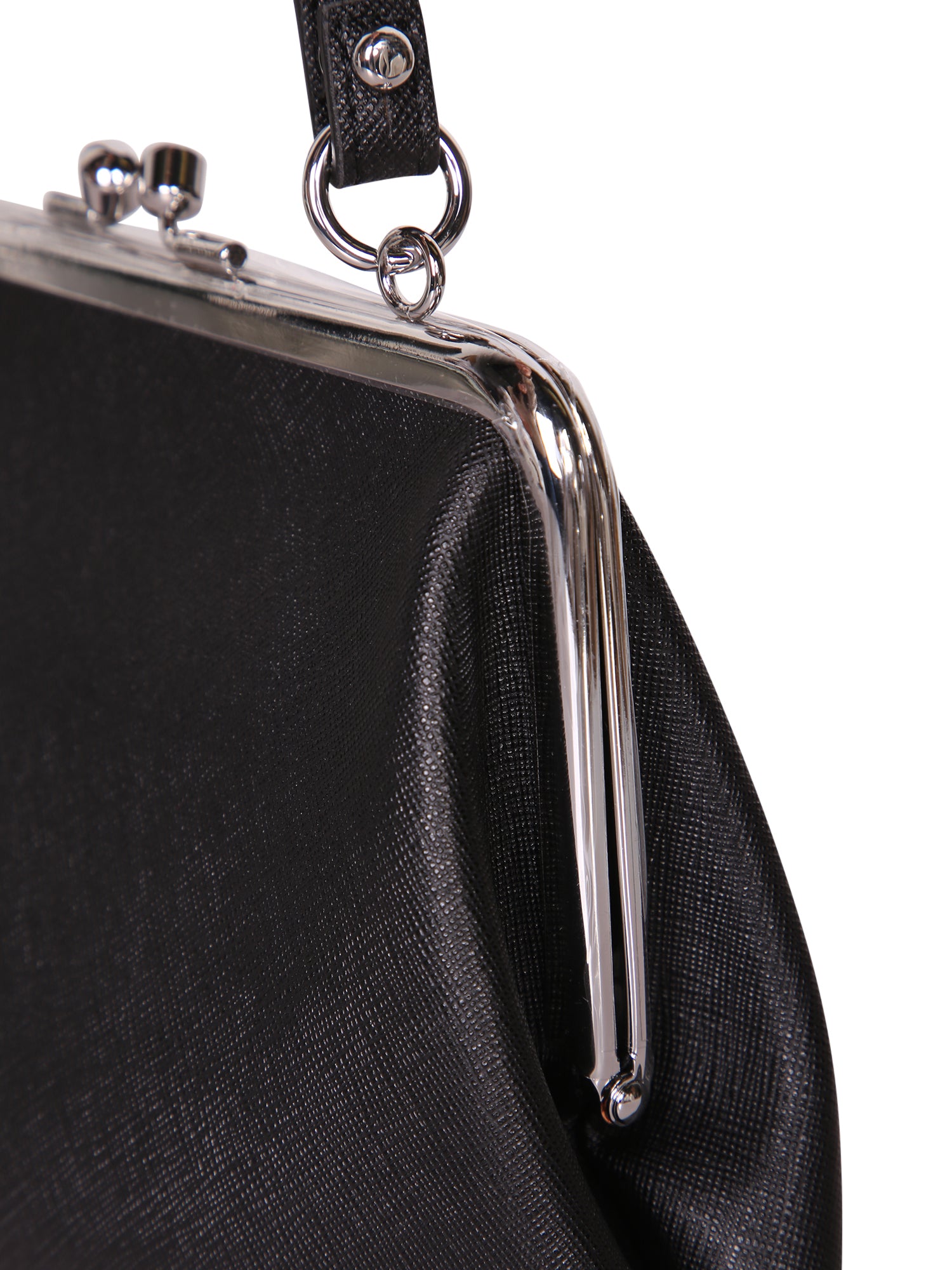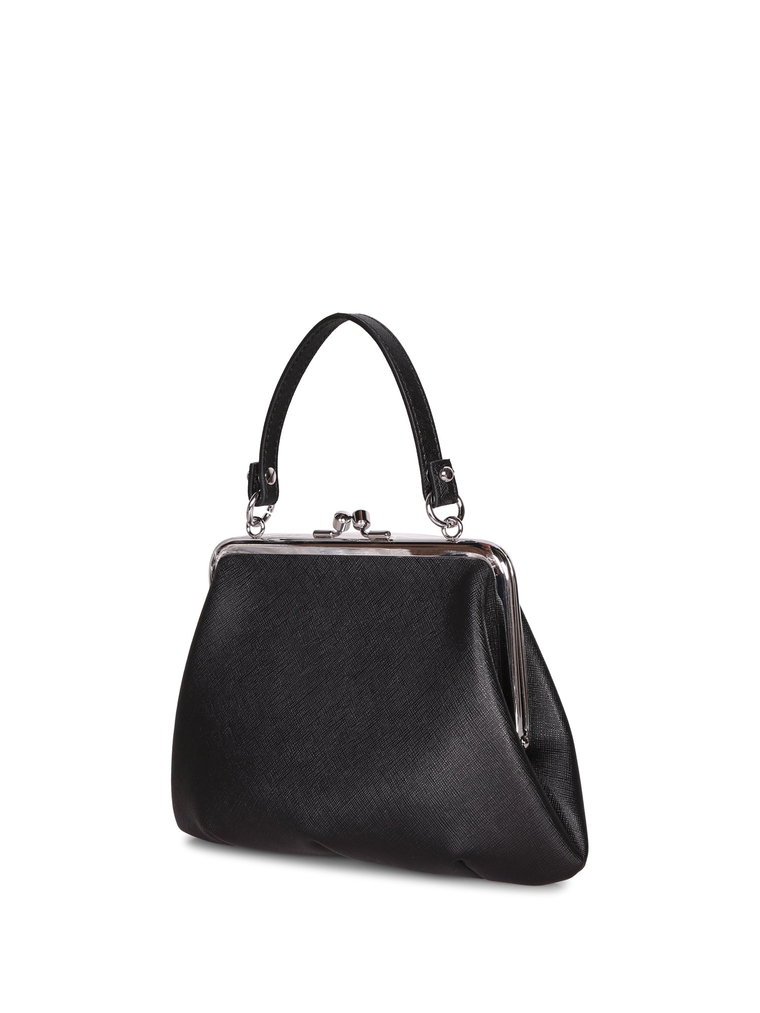 Black saffiano leather. Single handle. Snap closure with iconic silver frame.