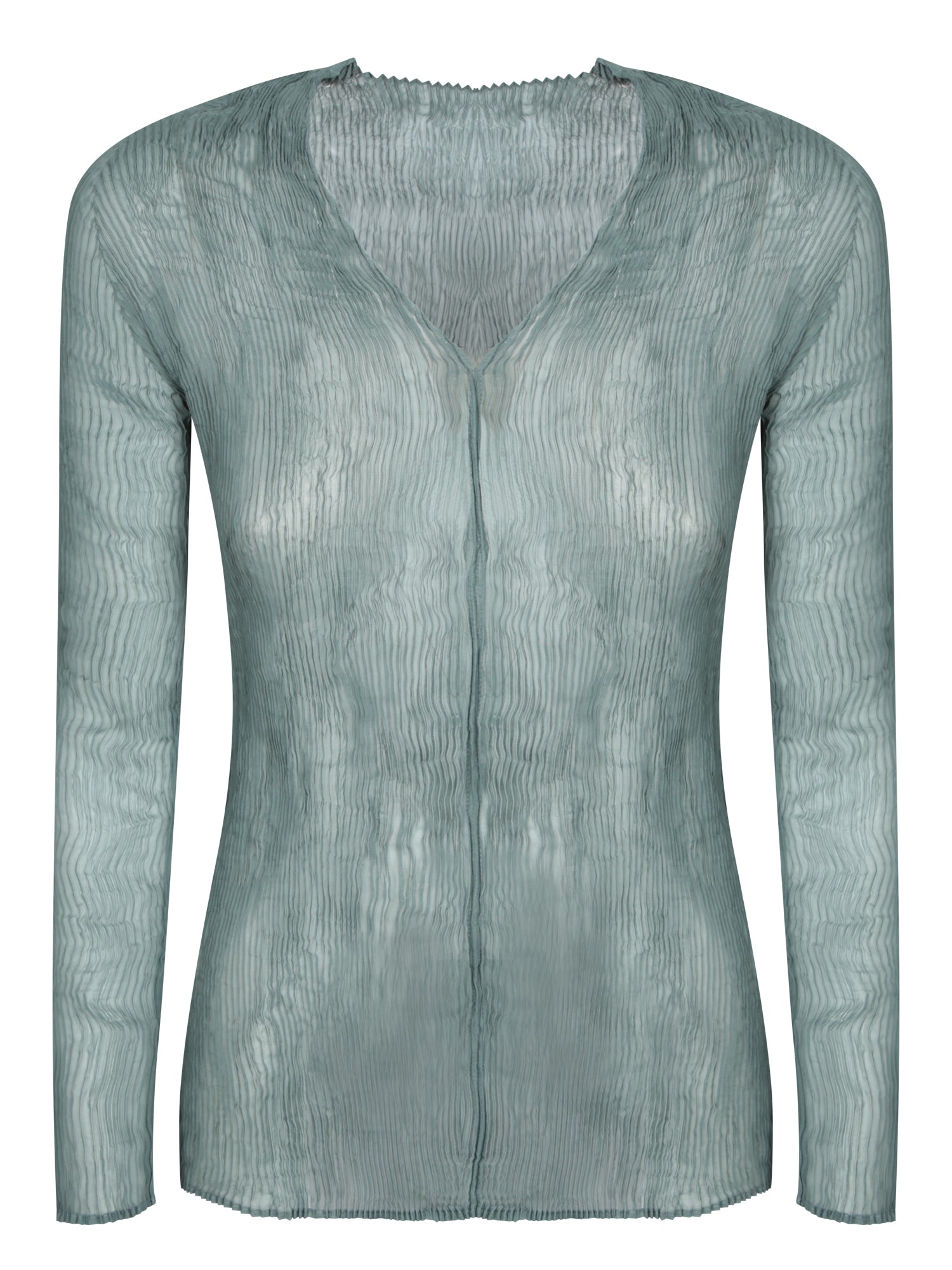 Long sleeve chiffon top. Green color. Cut with twist detail and V-neckline.