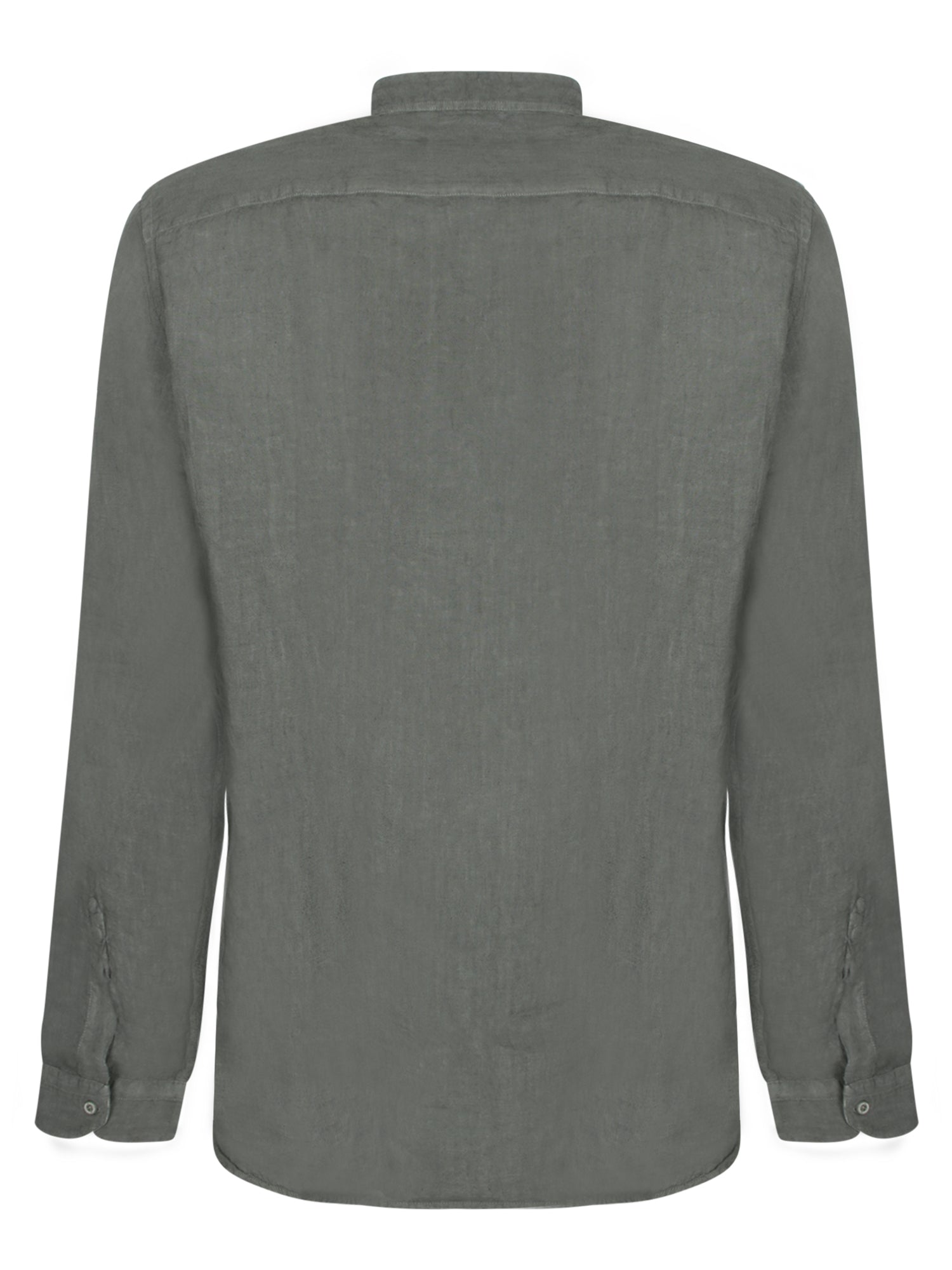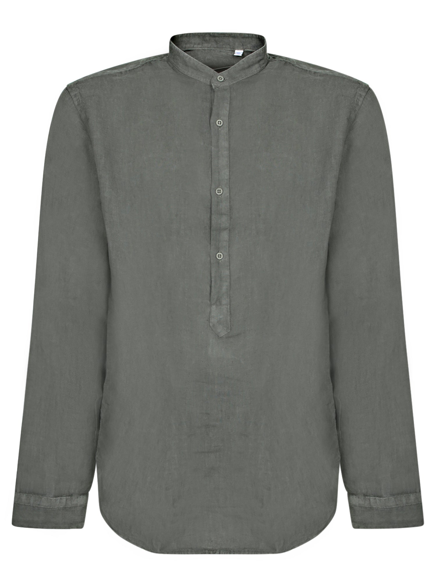 Long sleeve linen shirt. Mandarin collar. Front button closure.