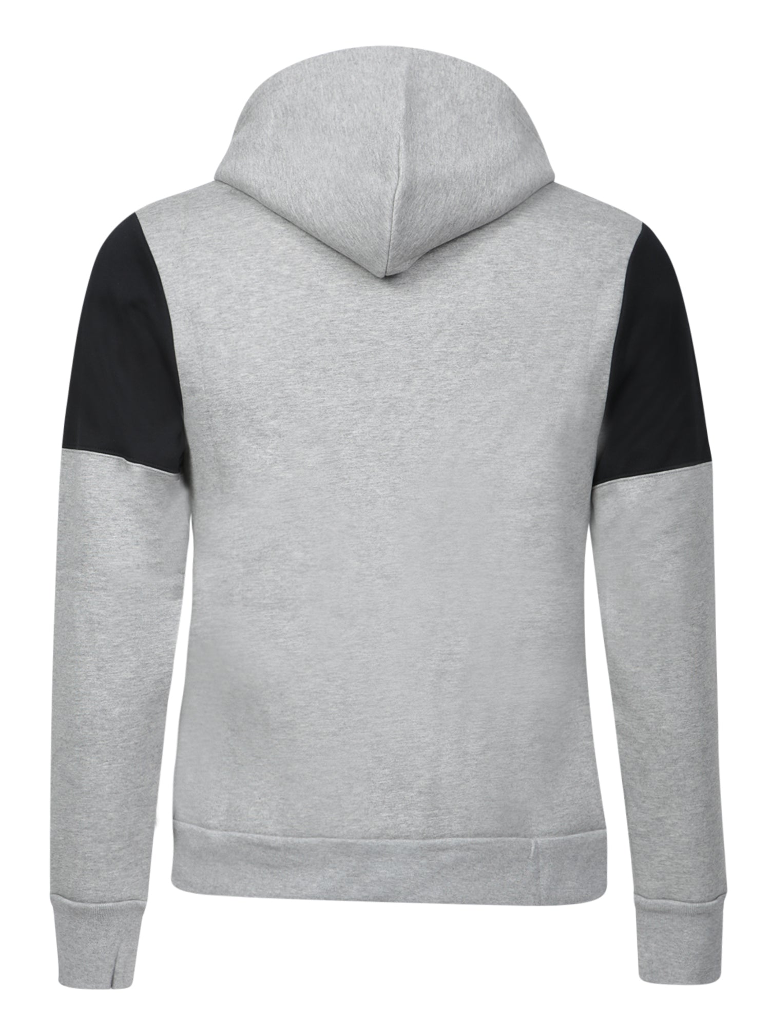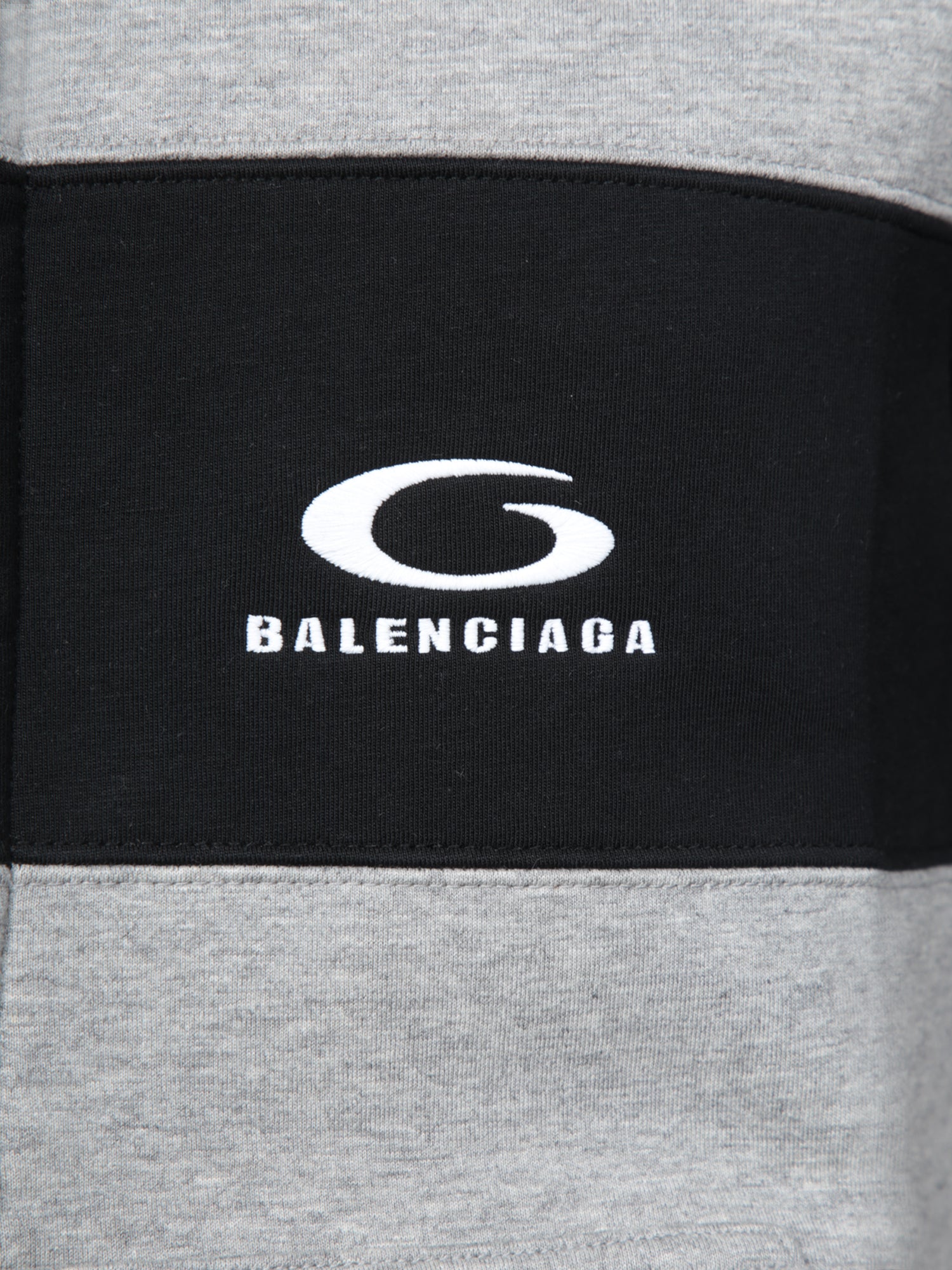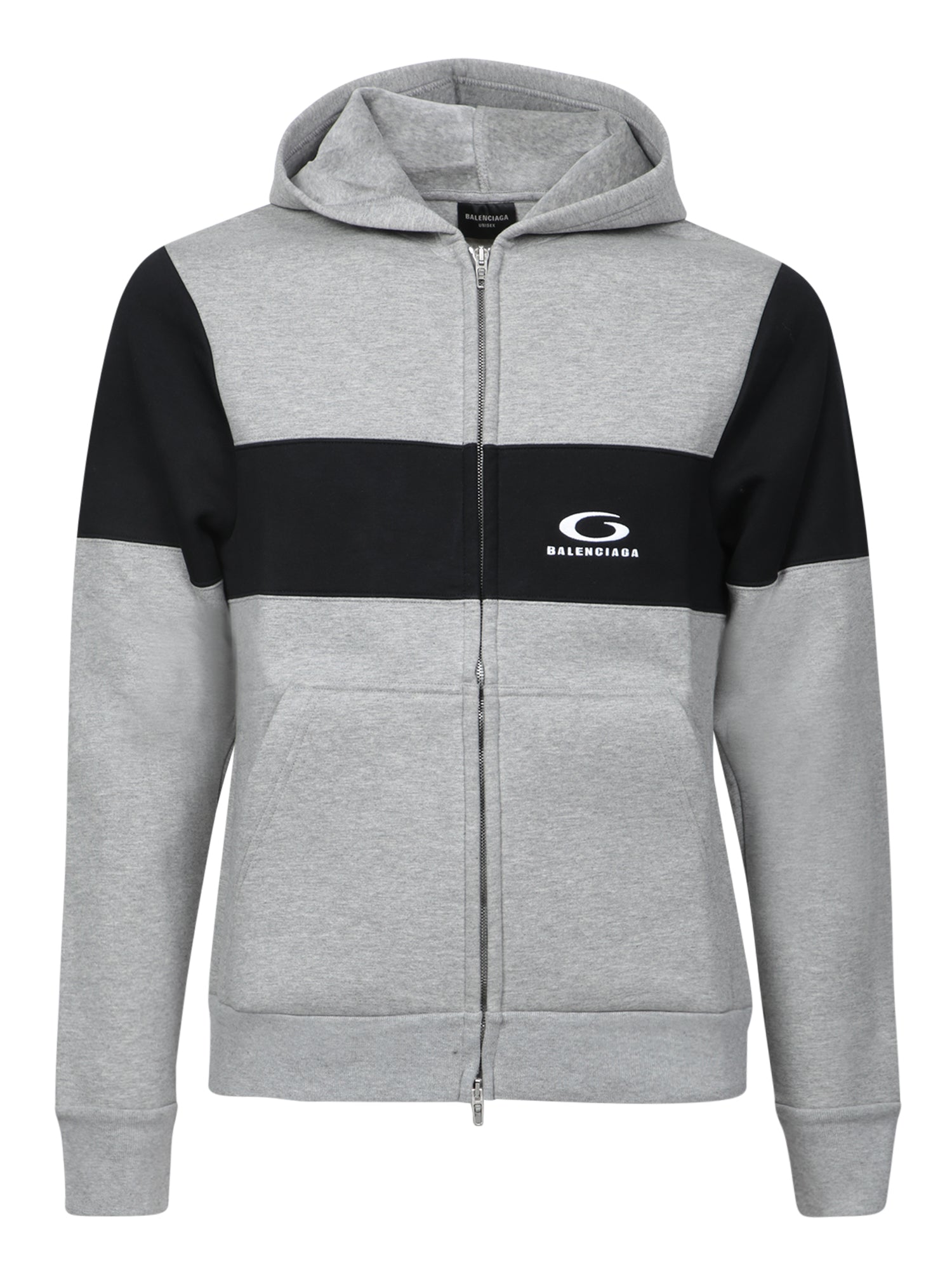 Hooded sweatshirt. Front zip closure. Long sleeves. Grey and black color block design. Balenciaga logo on the chest.