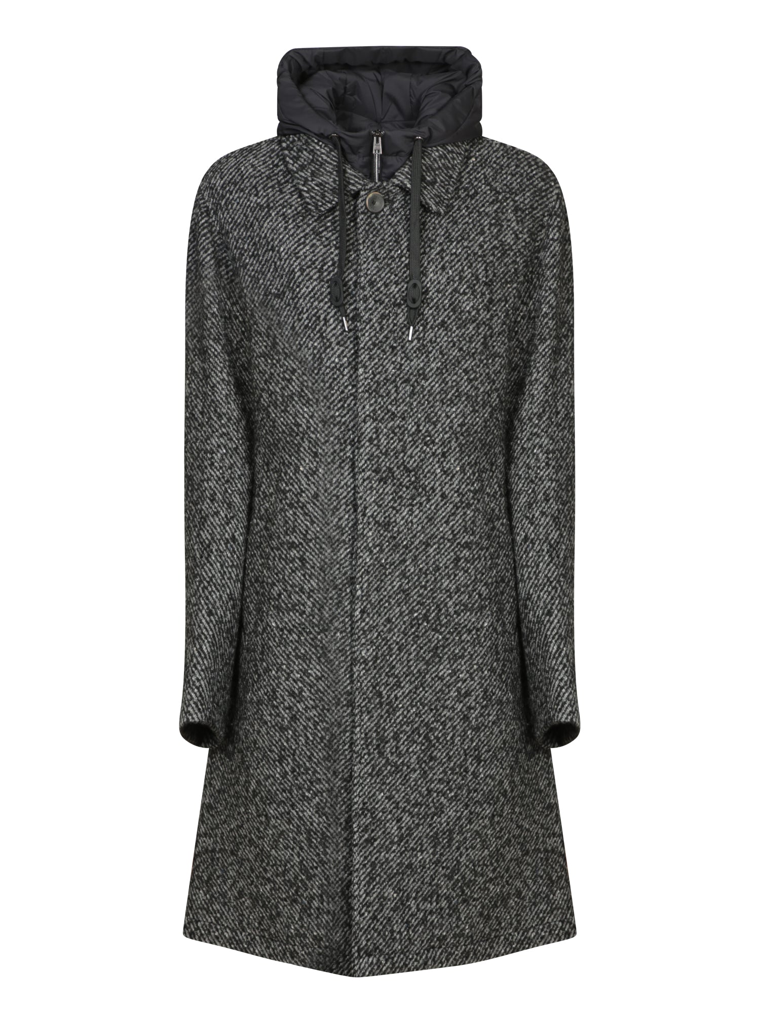 Functional elegance meets modern comfort in this Grey Diagonal Nylon Coat by Herno. Featuring an eye-catching black and grey woven texture, this piece is perfect for a sophisticated look on cold days.