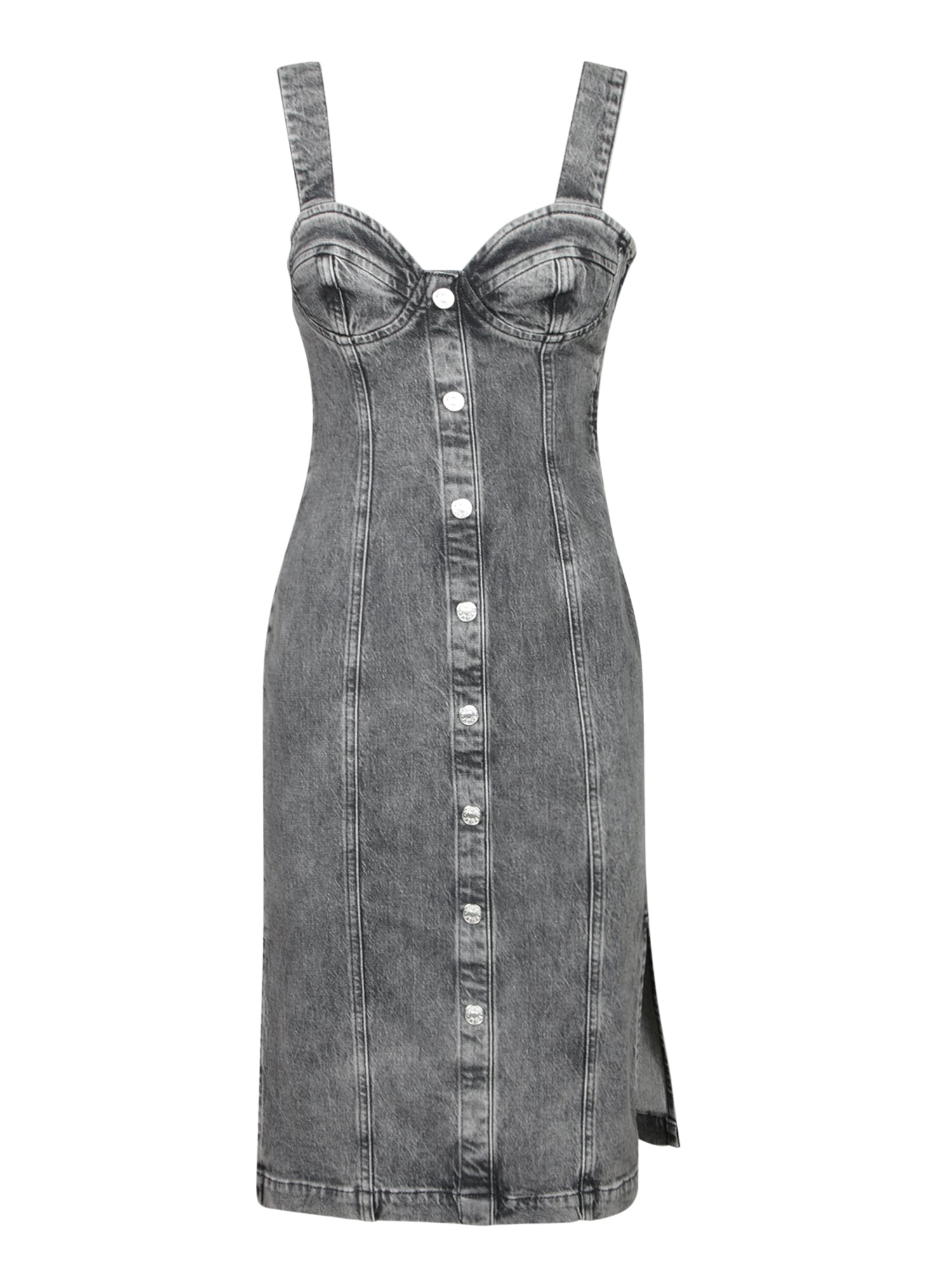 This Moschino Jeans stretch denim dress accentuates the silhouette with a sophisticated corset detail on the bust and a metallic button closure. Its contemporary design and gray hue make it perfect for casual-chic events.
