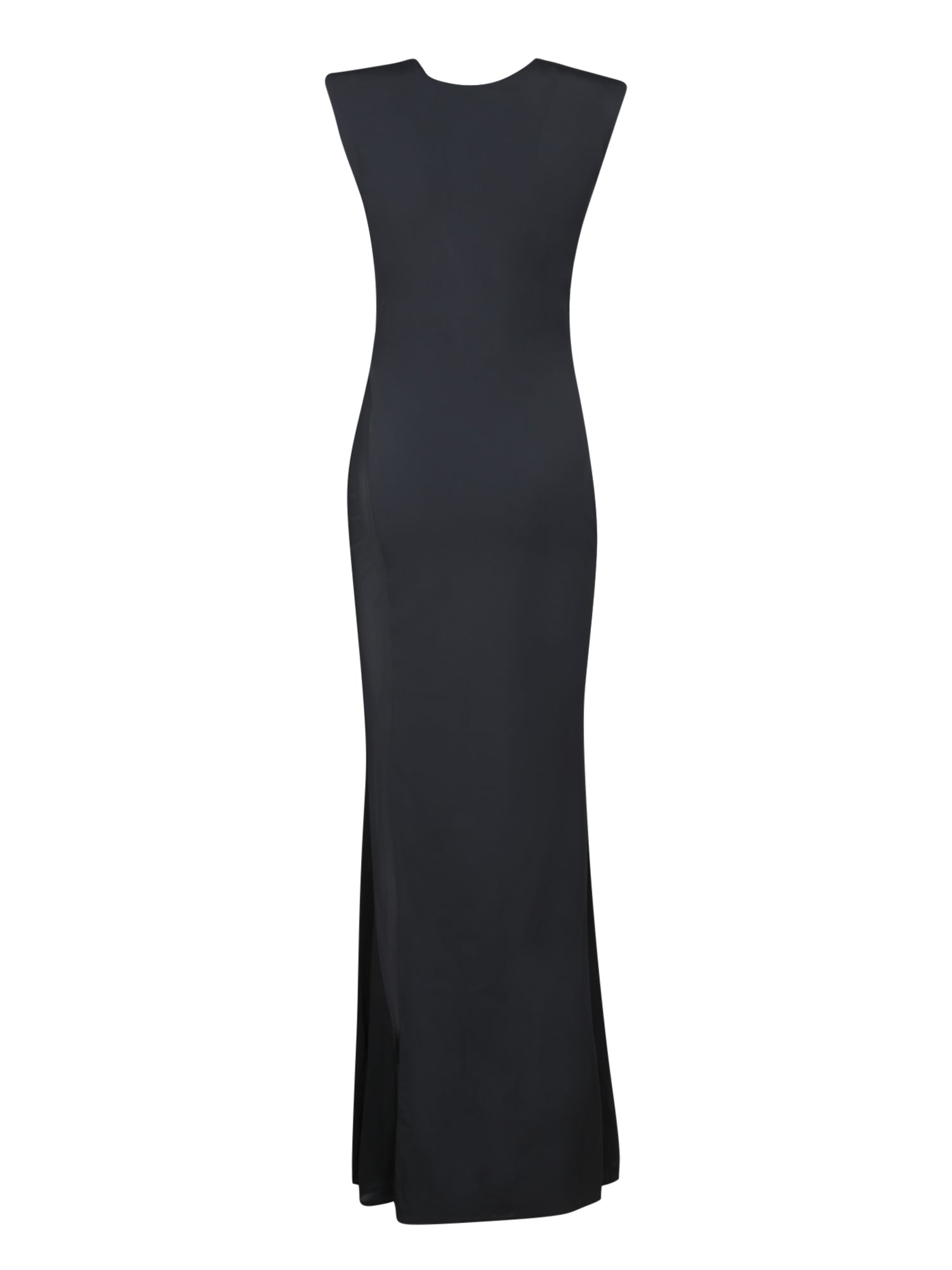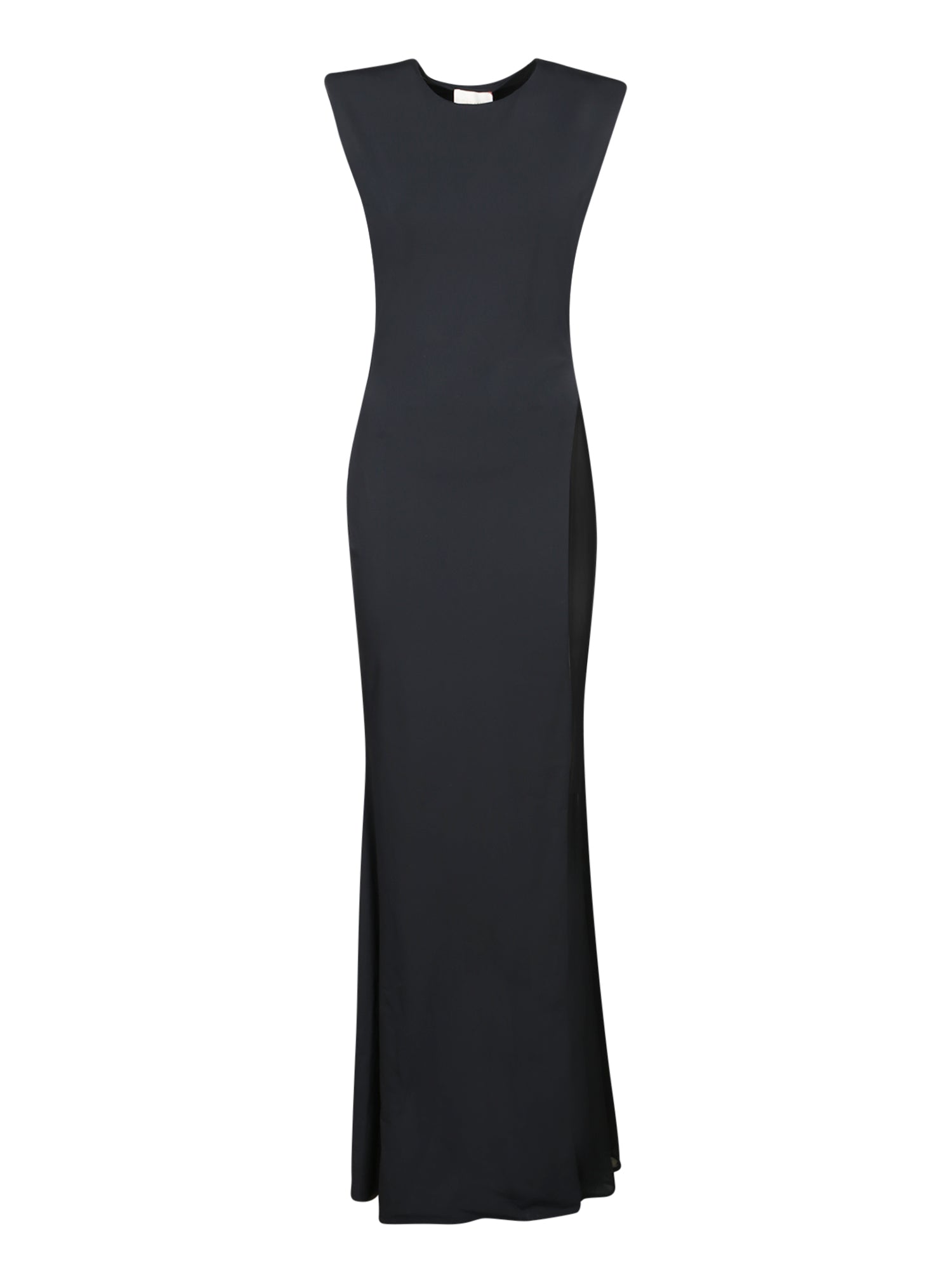Sleeveless dress with boat neckline. Flared silhouette. No applications.