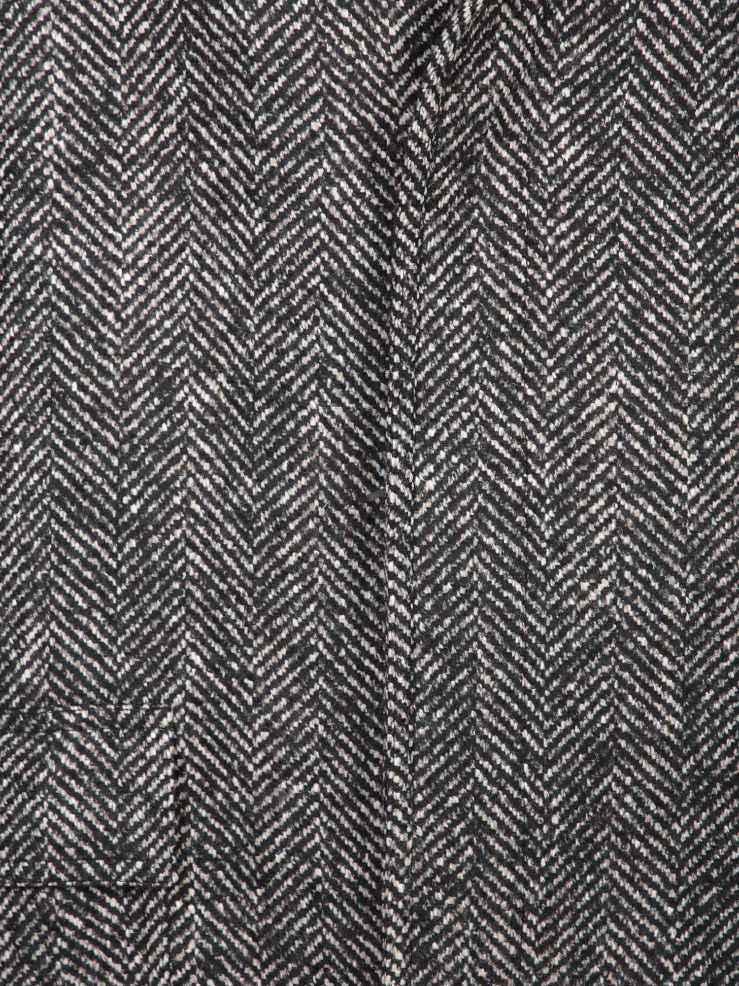 Long-sleeved coat in herringbone fabric. Features a classic collar, side slits, and front button closure.