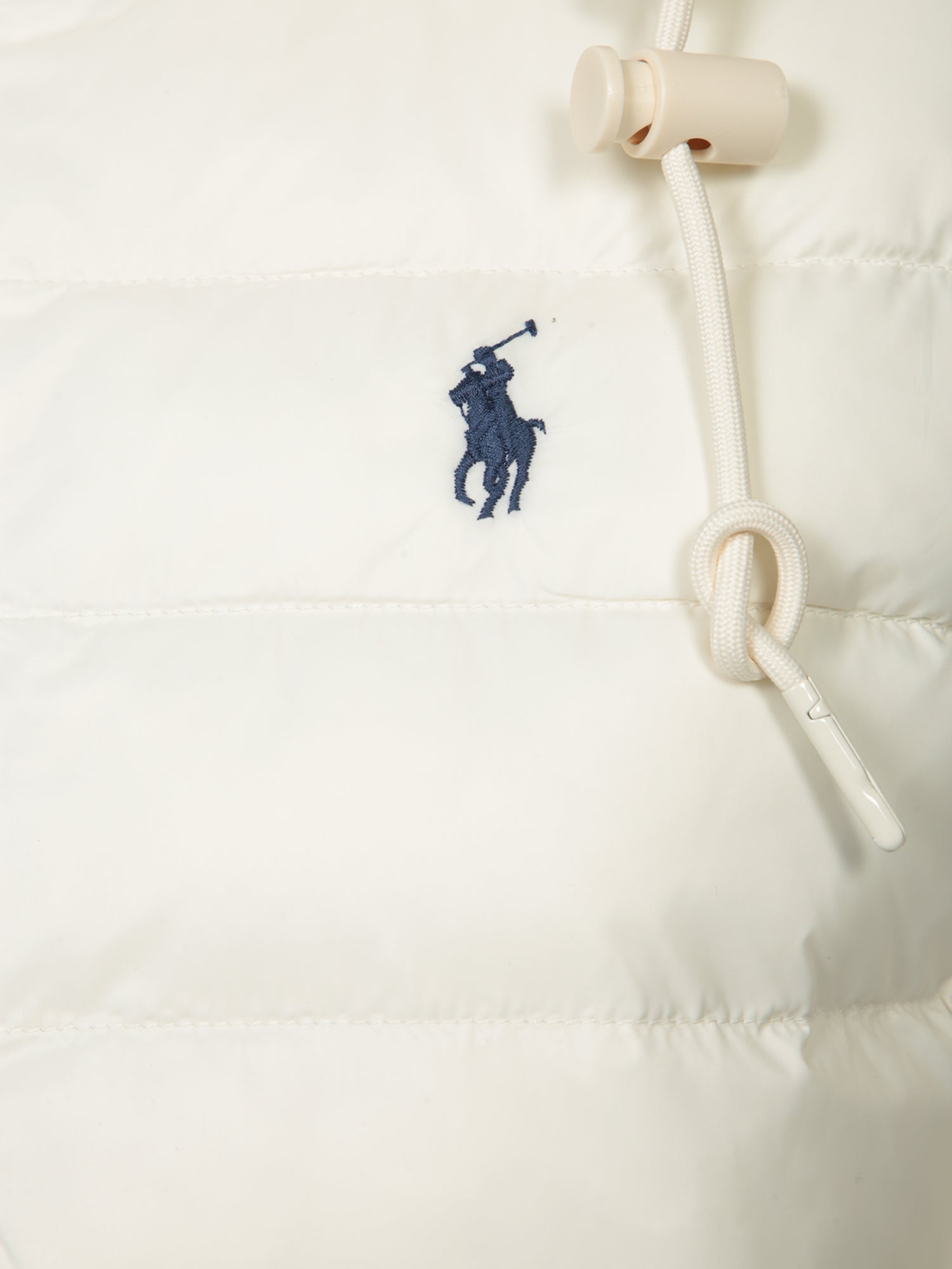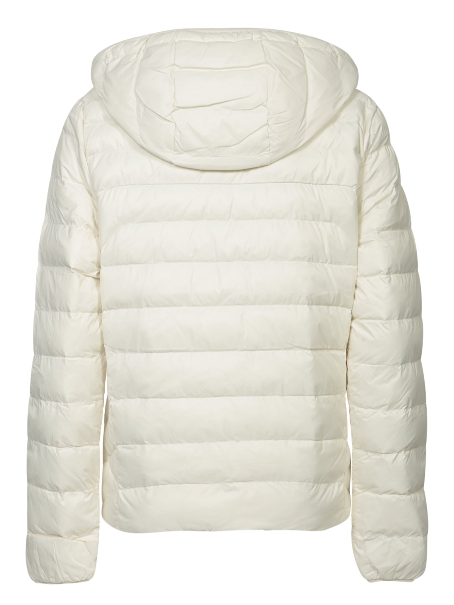 An elegant cream padded jacket featuring a minimalist design that offers comfort and style. Equipped with an adjustable hood and a clean silhouette, ideal for a casual or urban fit.