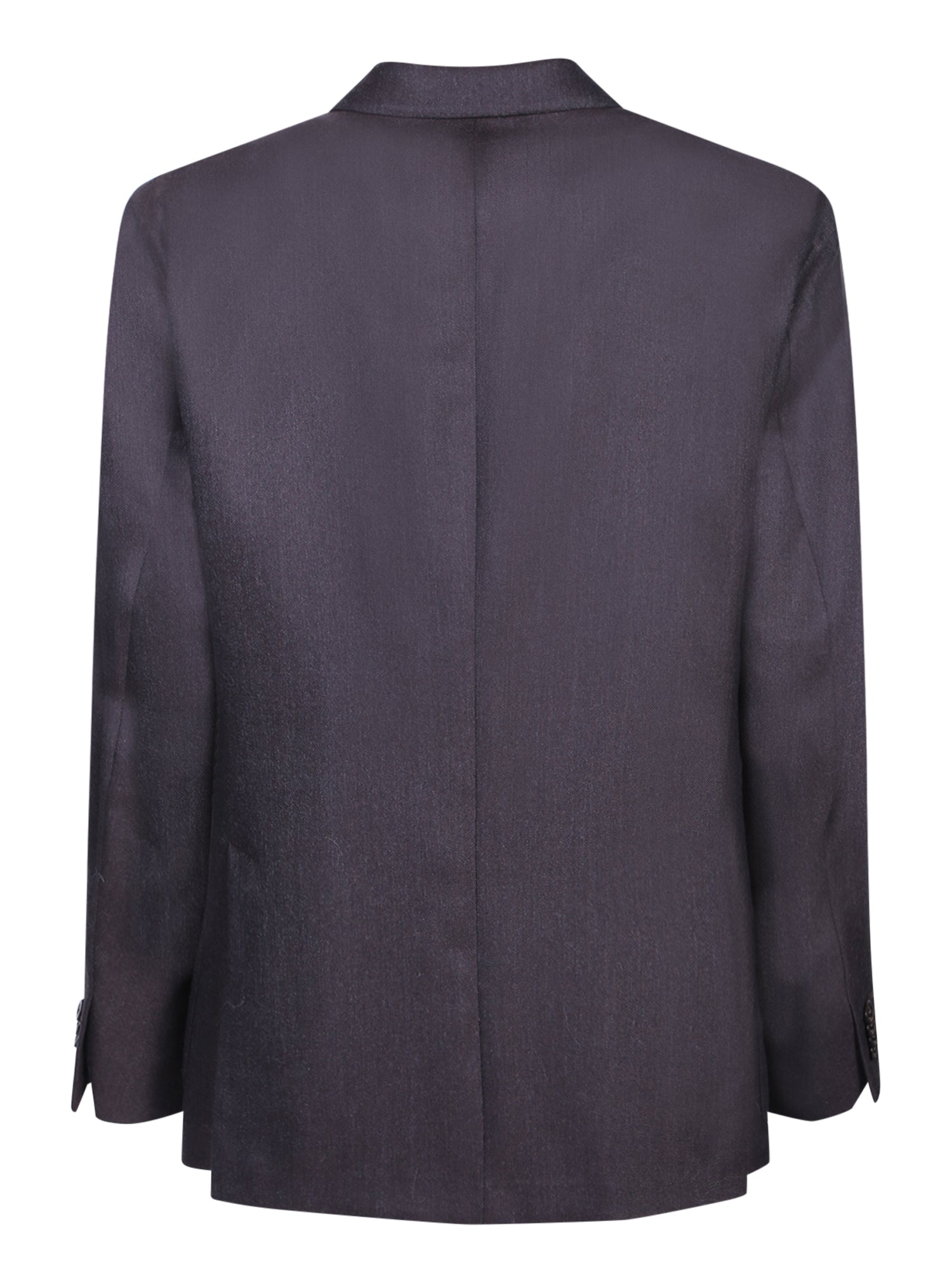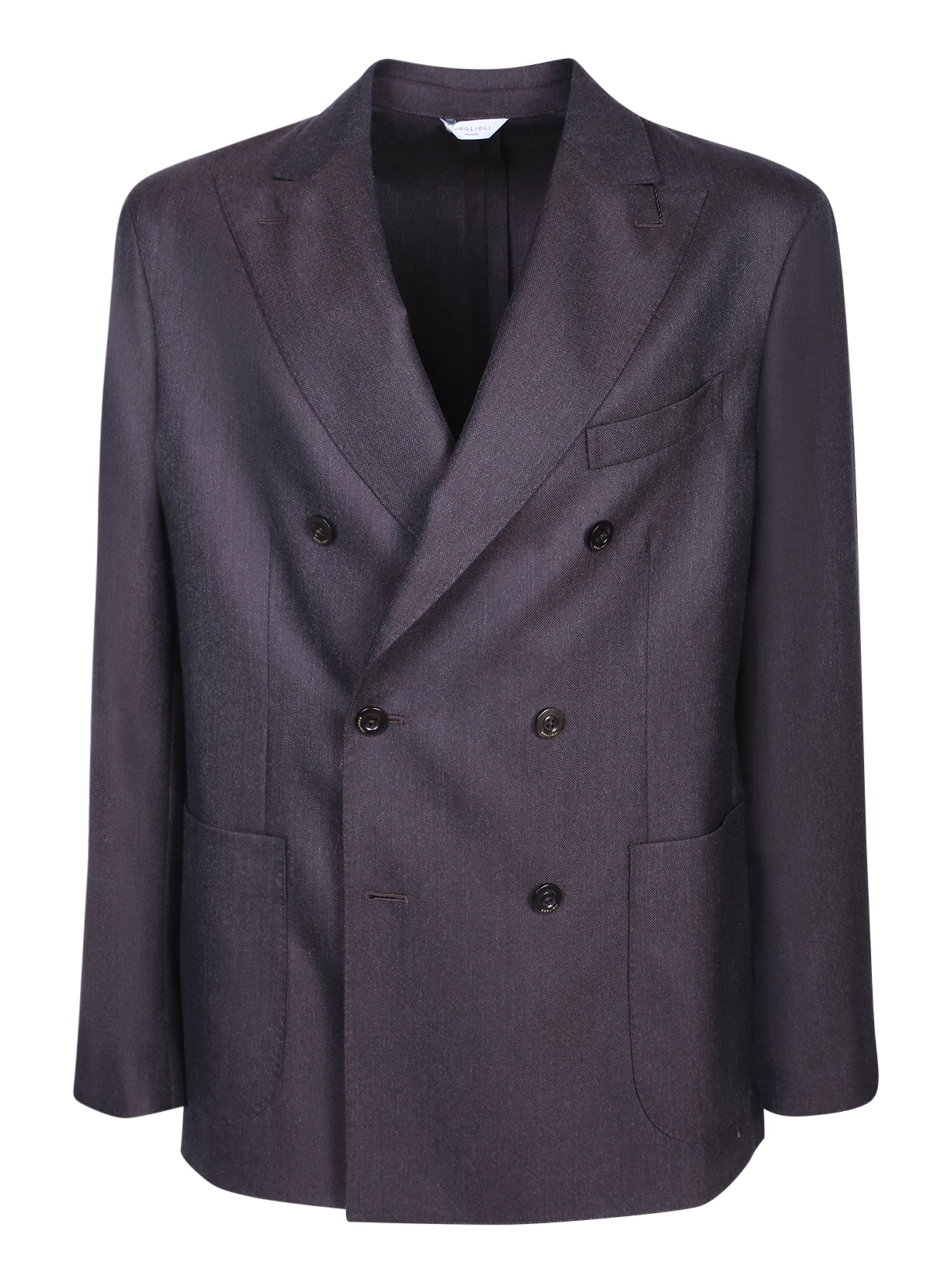 Brown double-breasted hopsack jacket. Features welt pockets and tonal buttons.