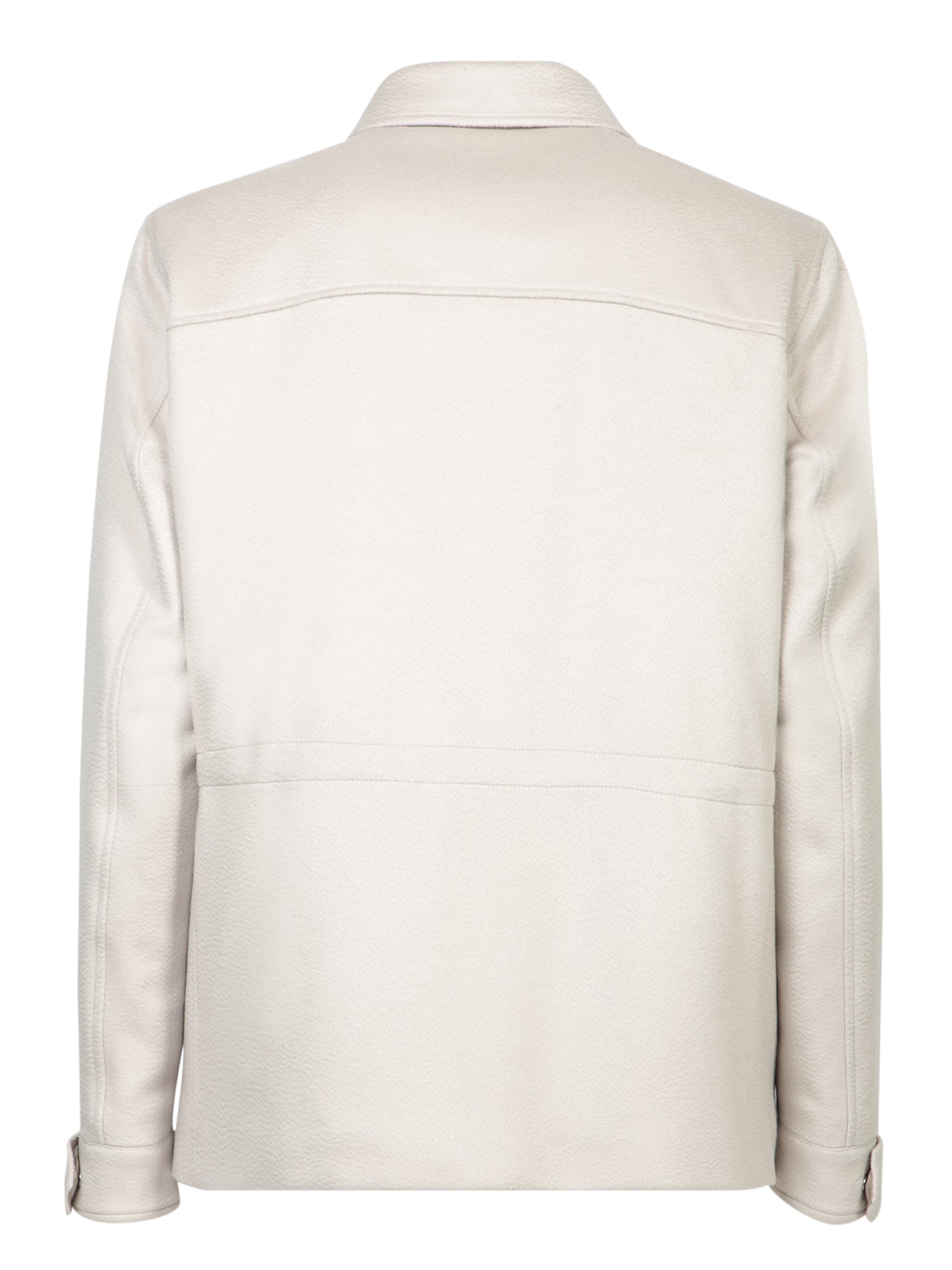 Jacket with classic collar, concealed front zipper, four functional pockets.