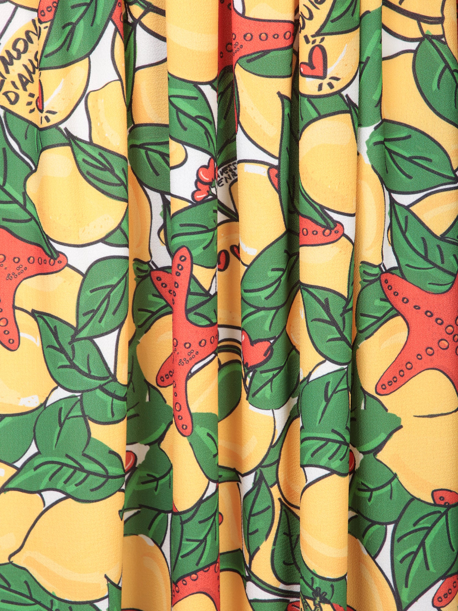 Crepe dress with a vivid lemon and vegetable print. Features a halter neckline and a cut-out back.