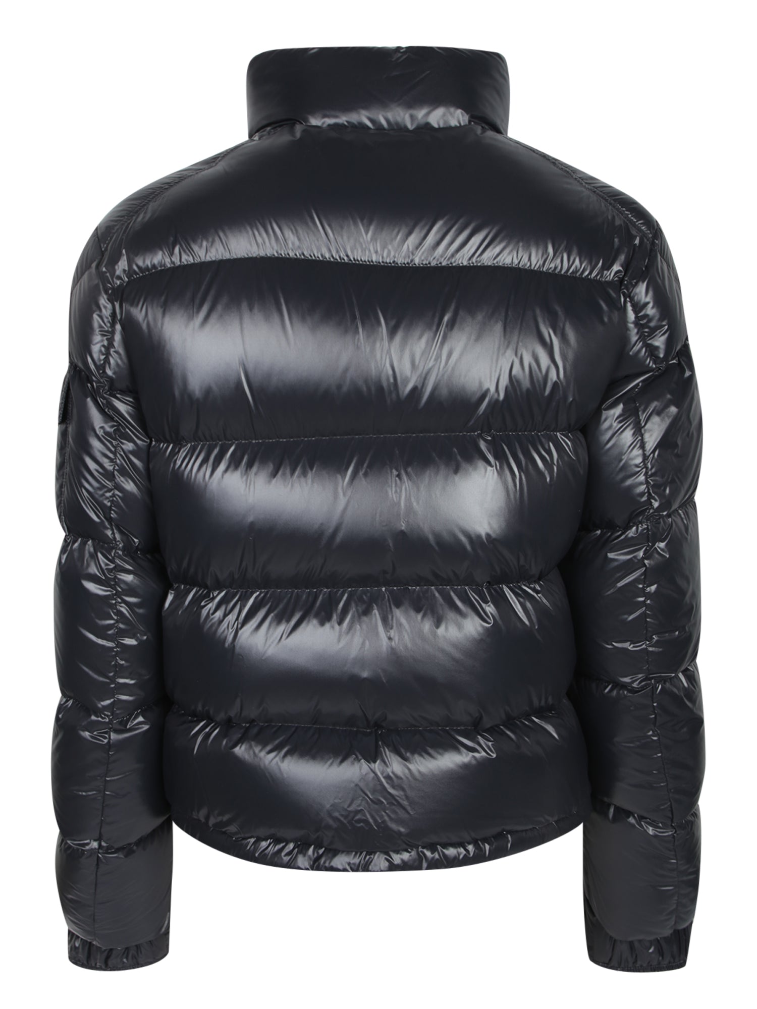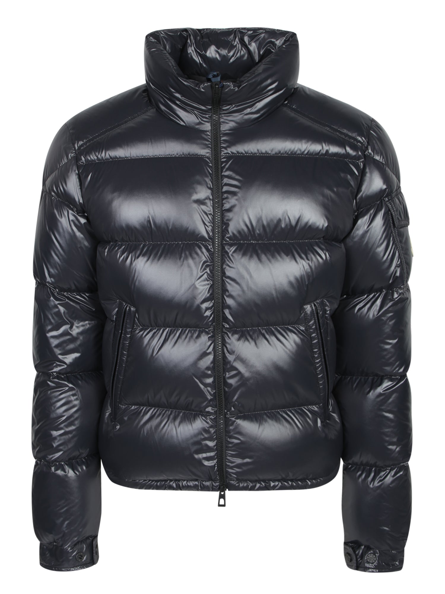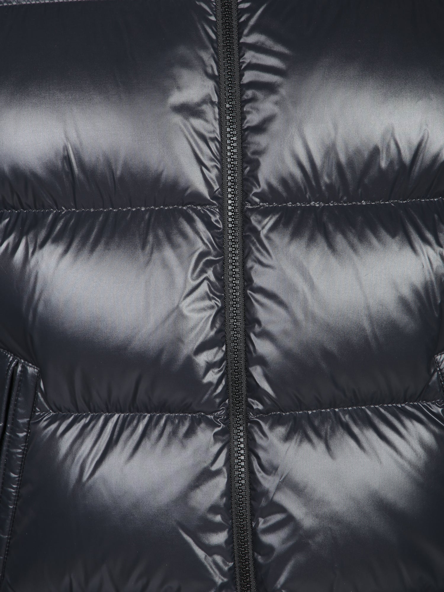 Full-zip down jacket with zipper side pockets, high neck, and ribbed details. Glossy material.