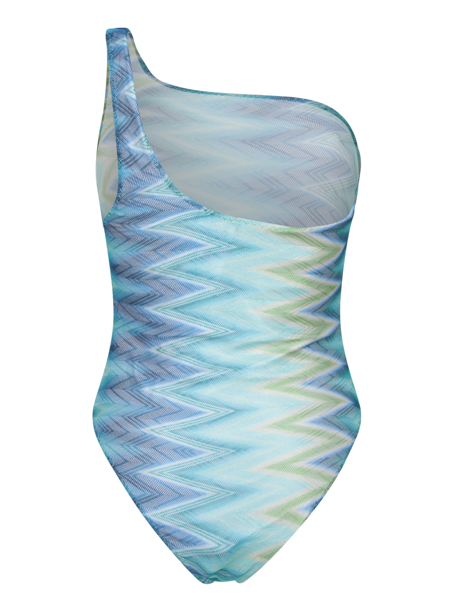 One-shoulder swimsuit. Zigzag print fabric. Seamless design.