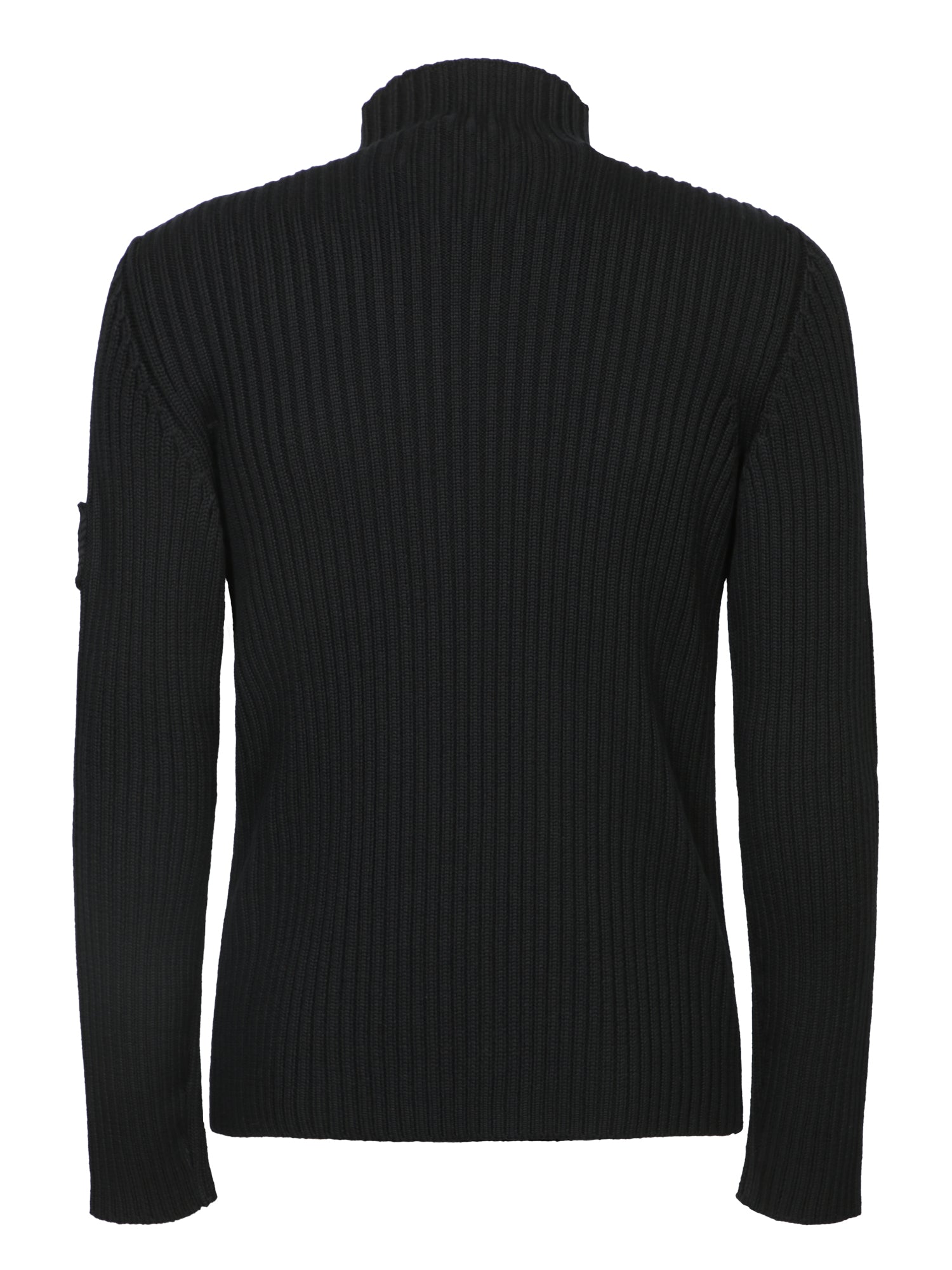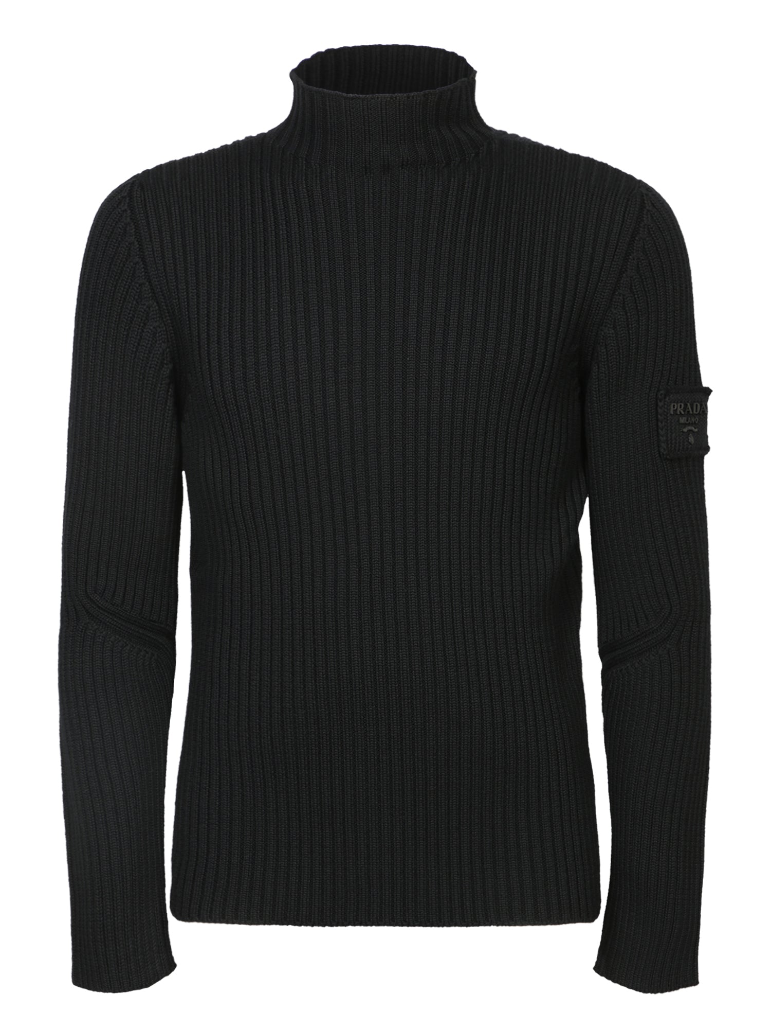 An elegant black Prada knitted sweater featuring a sophisticated turtleneck and a subtle branded logo on the left arm, adding a refined brand accent.