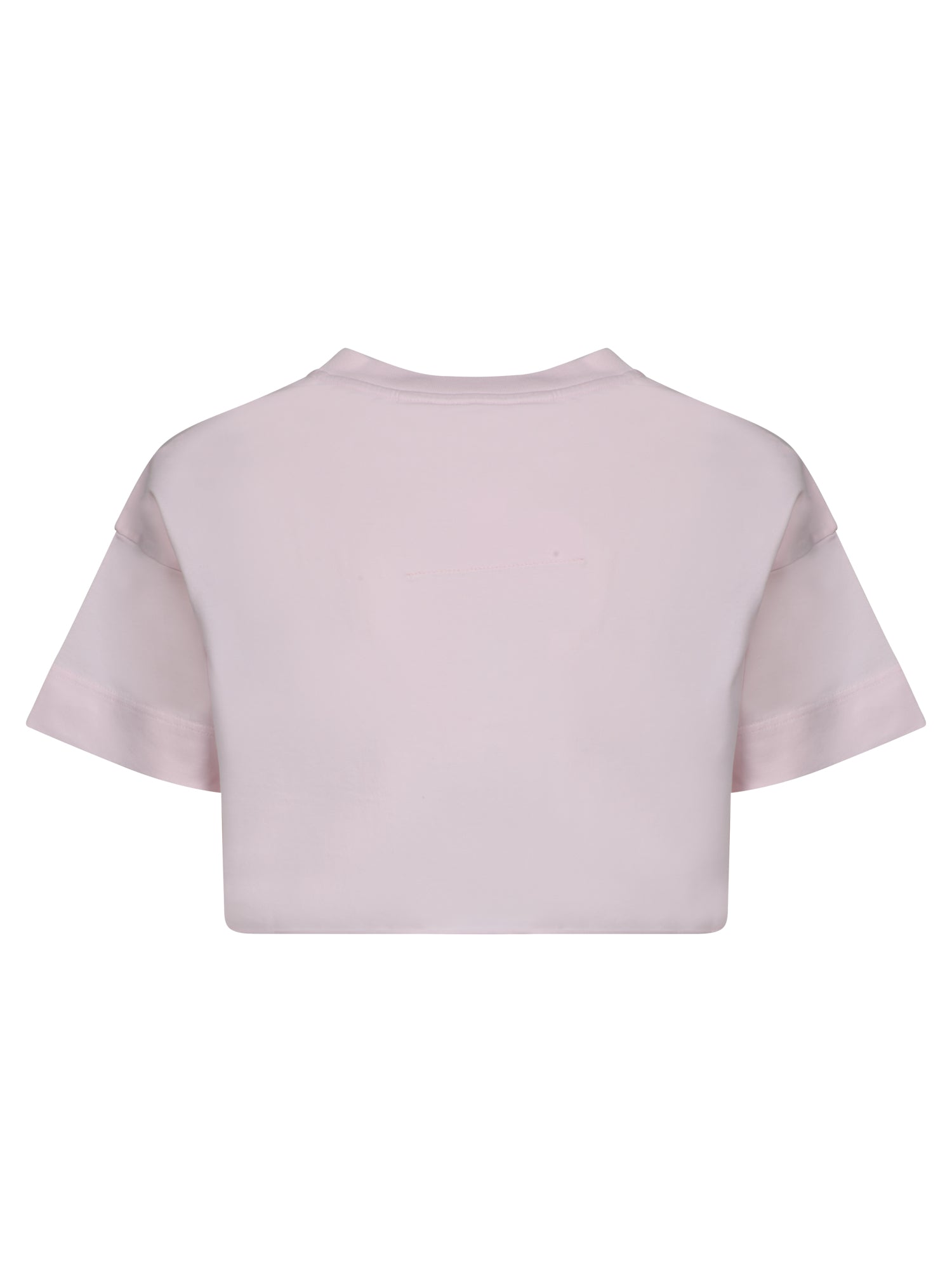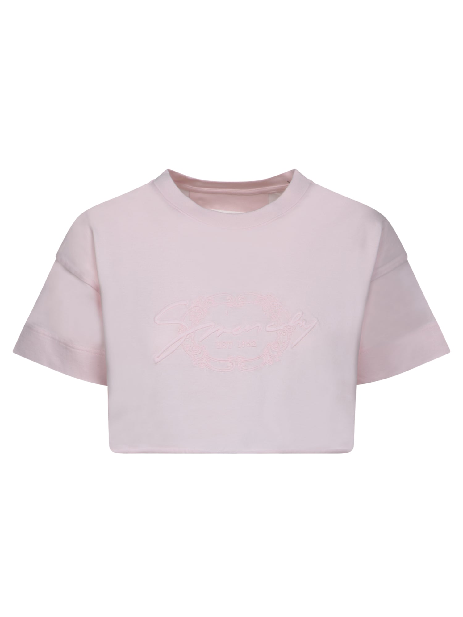 Elegant Givenchy crop t-shirt in pastel pink with delicately embroidered logo on the front. The perfect piece for a youthful and trendy look.