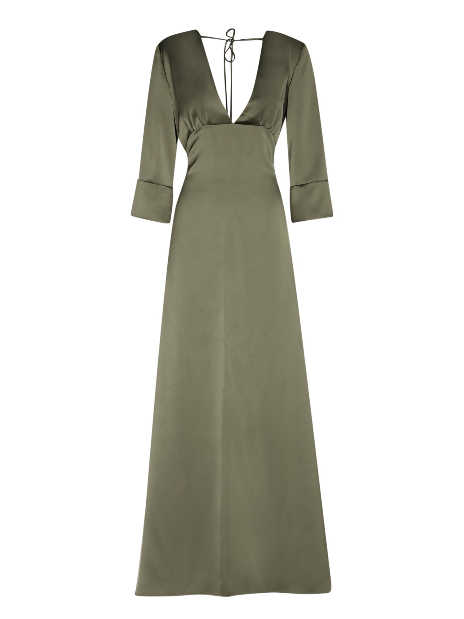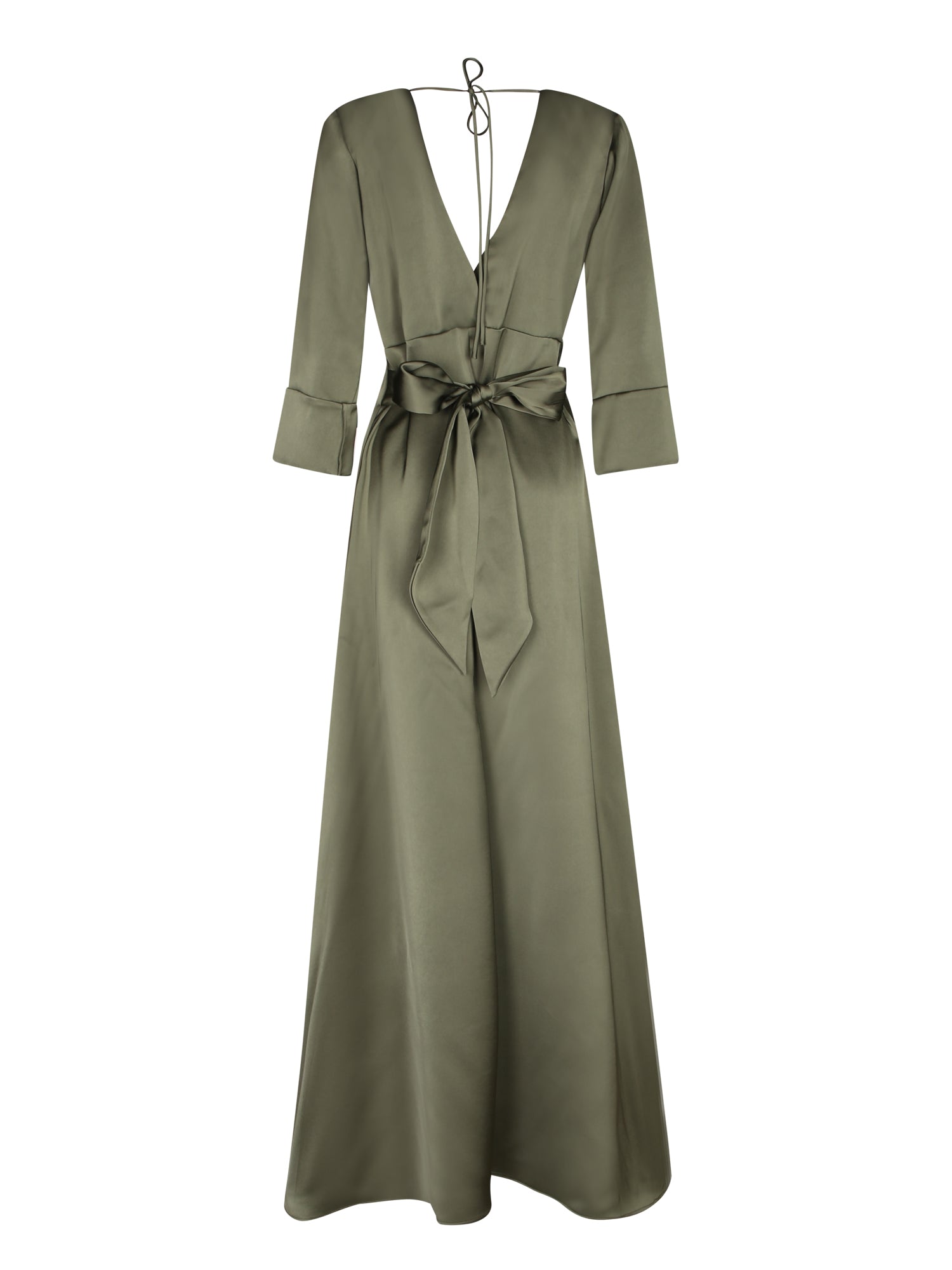 Long satin dress with deep V-neck, three-quarter sleeves and bow detail on the back.