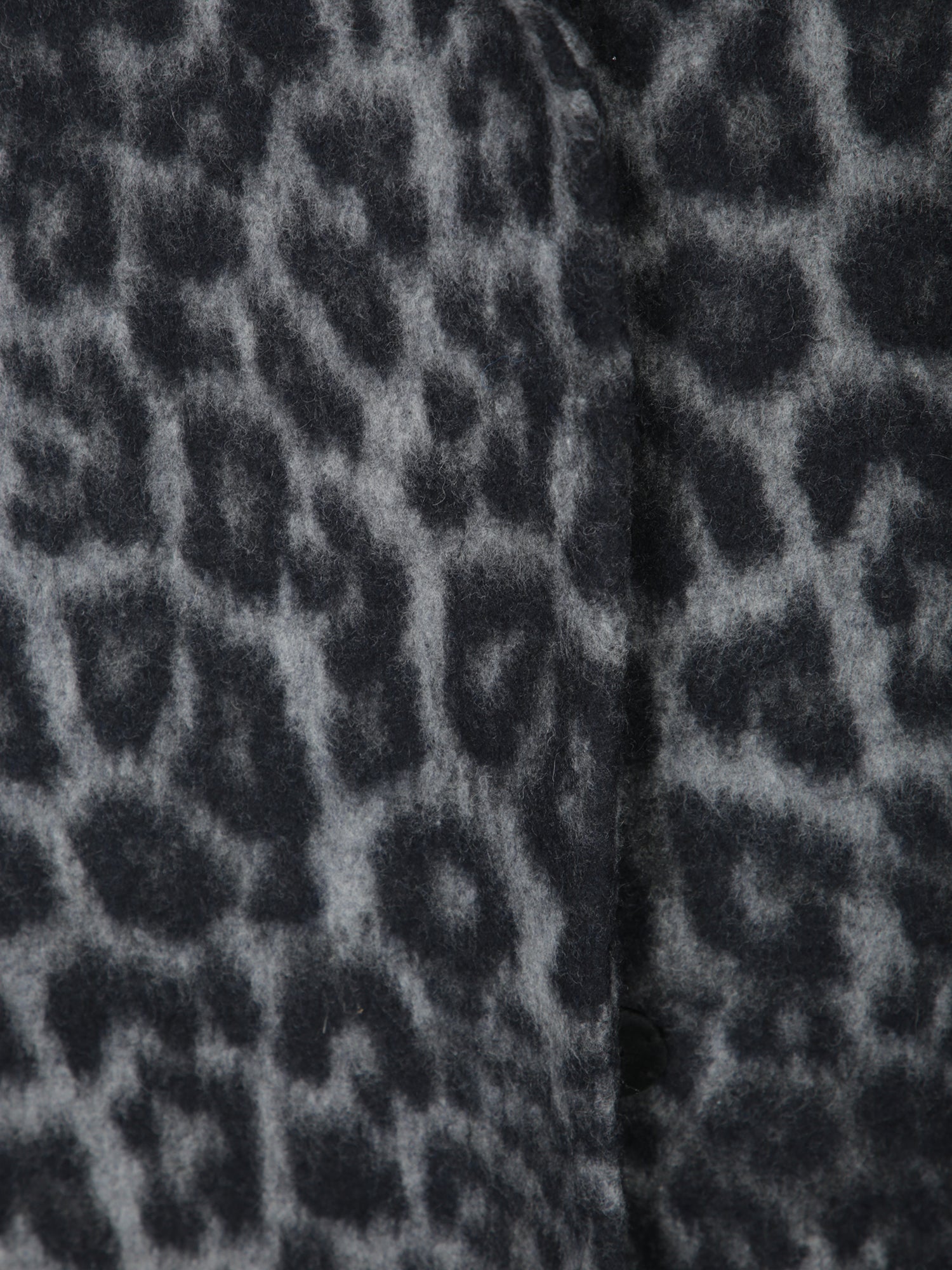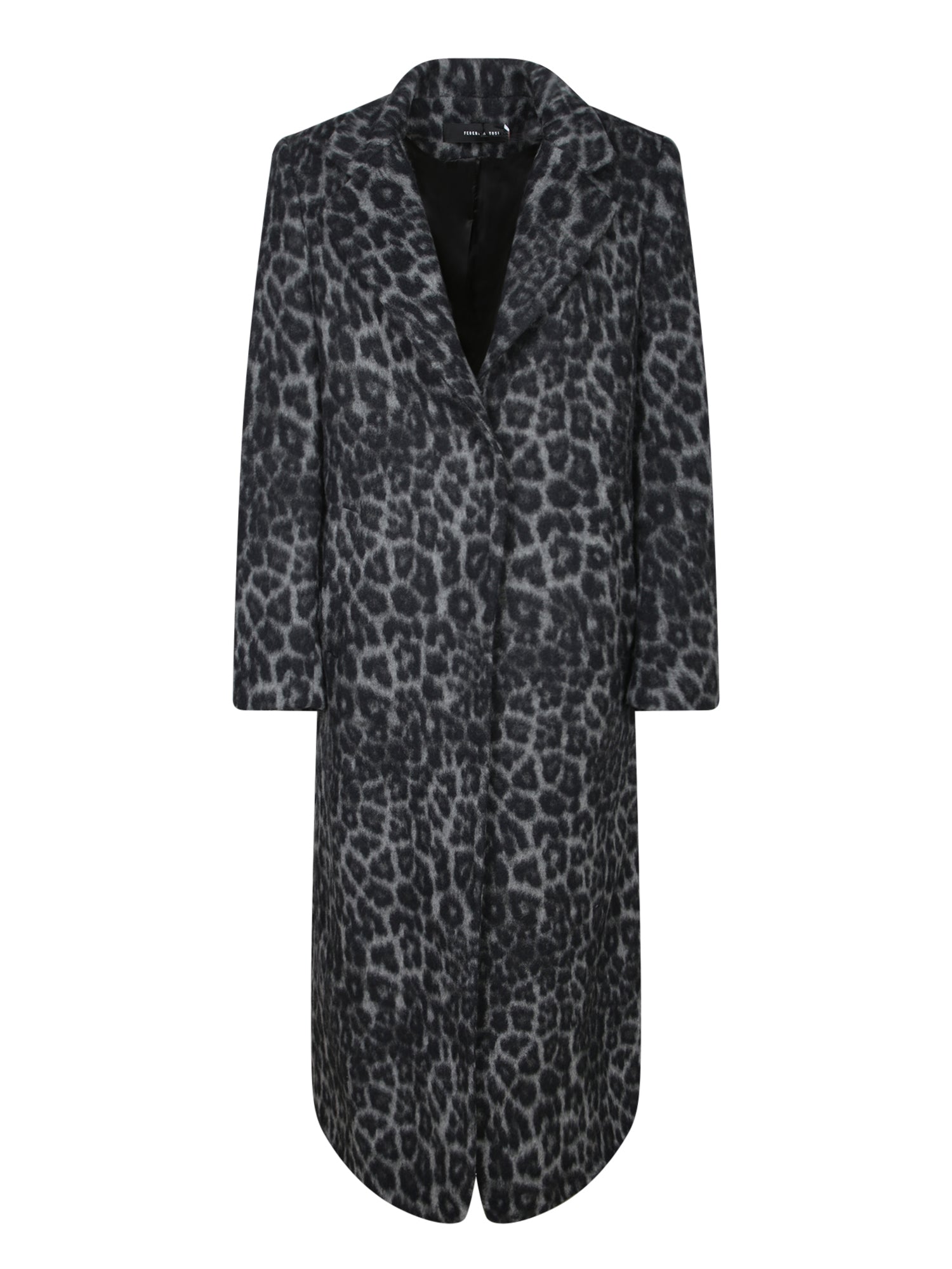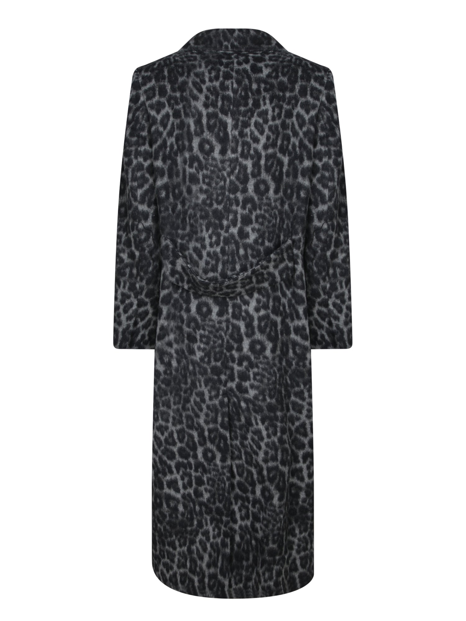 Long wool coat with spotted print. Open-front design with lapel collar.