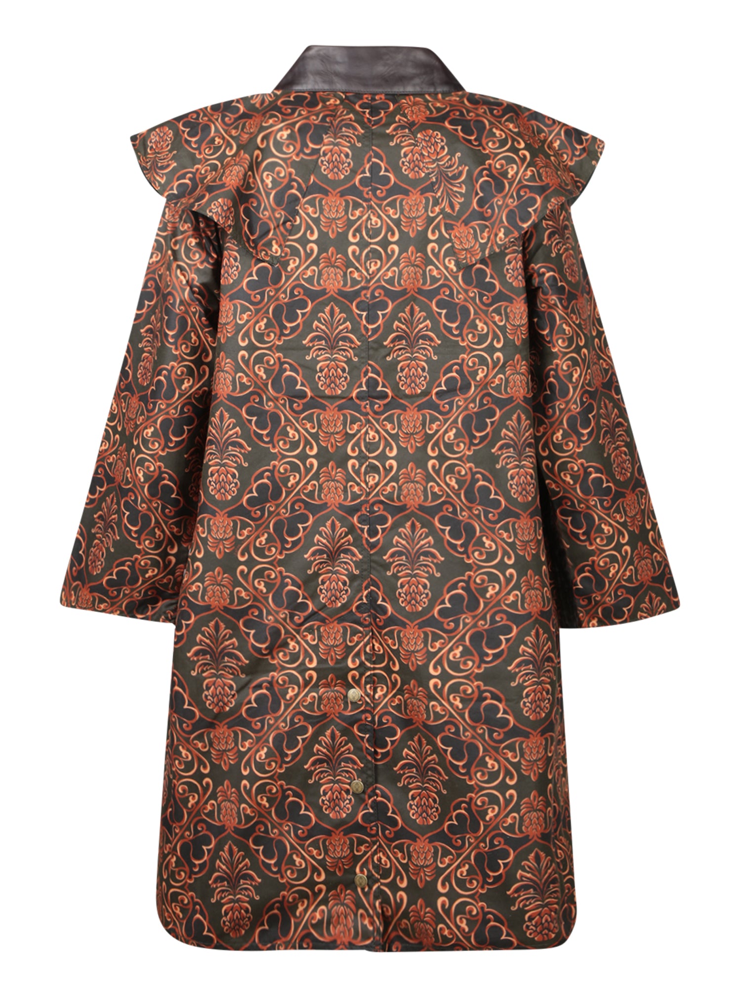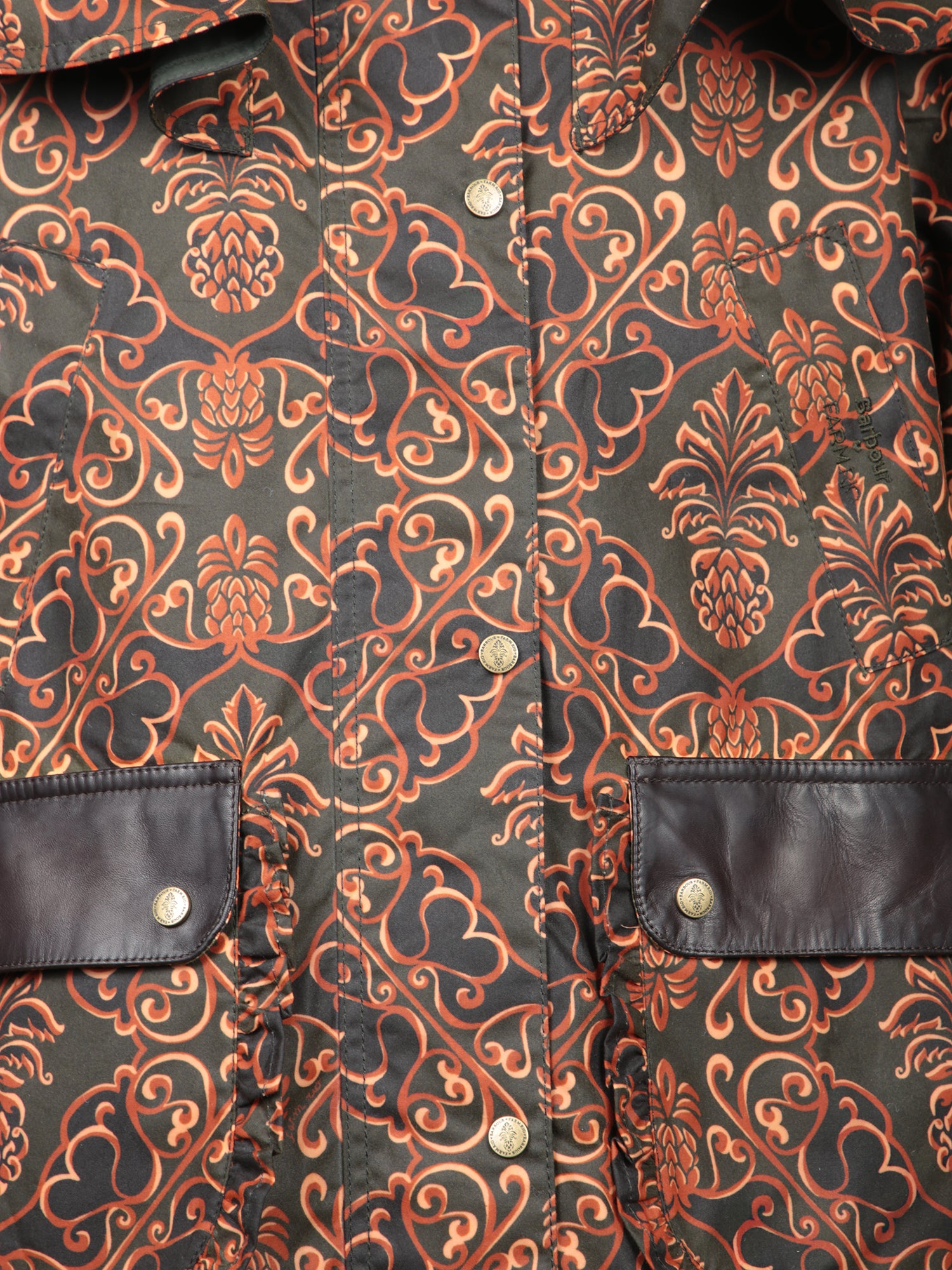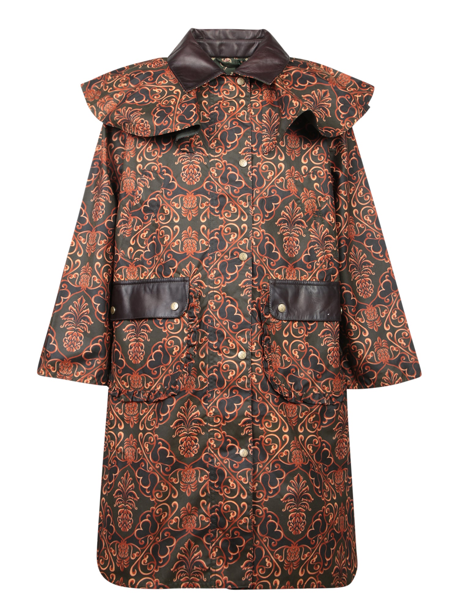 Jacket with intricate print. Brown leather details. Front button closure.