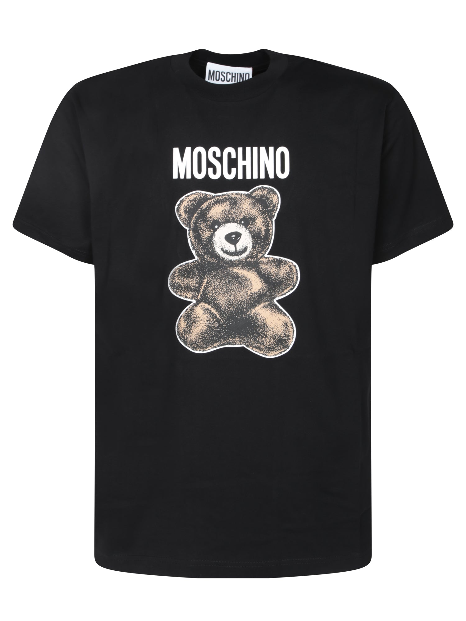 This Moschino black t-shirt captures attention with its large print of a bear and the iconic logo prominently displayed. Crafted in soft cotton, it delivers comfort and timeless style.