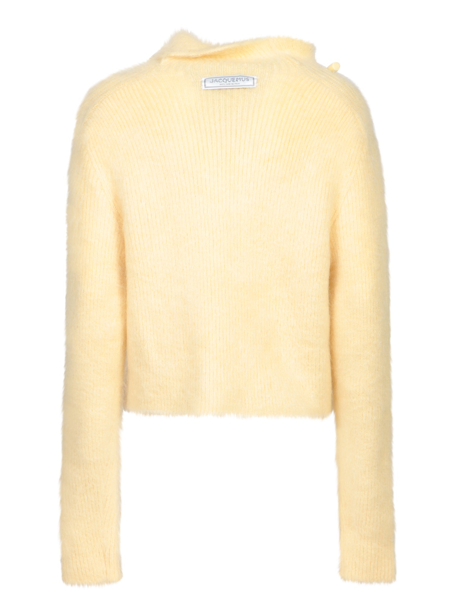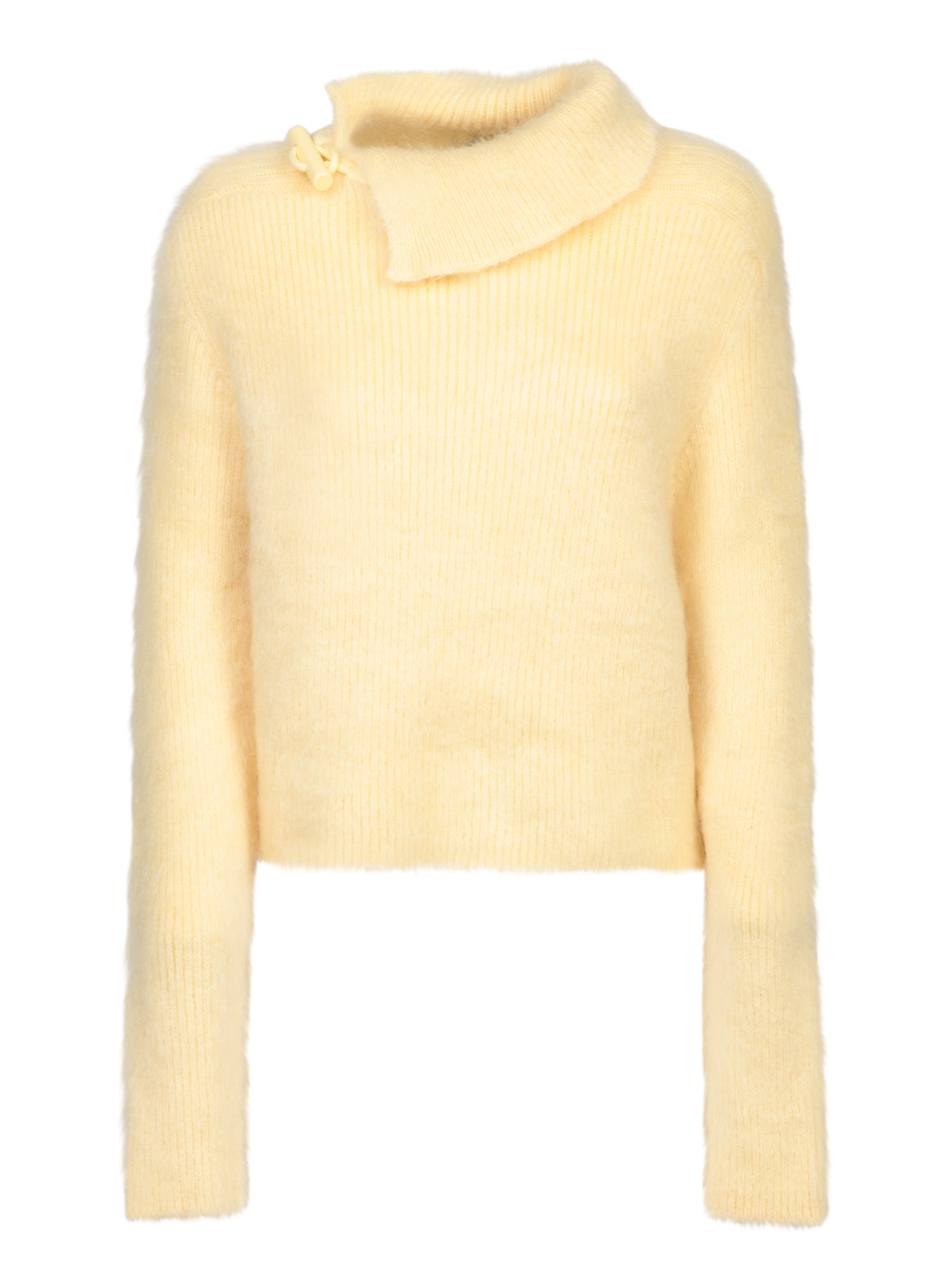 This light yellow Jacquemus sweater features a captivating, contemporary design with a sophisticated high collar embellished by a single button, offering a uniquely elegant touch.