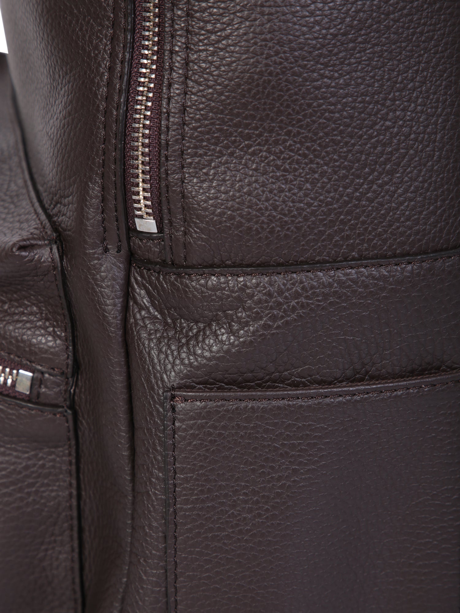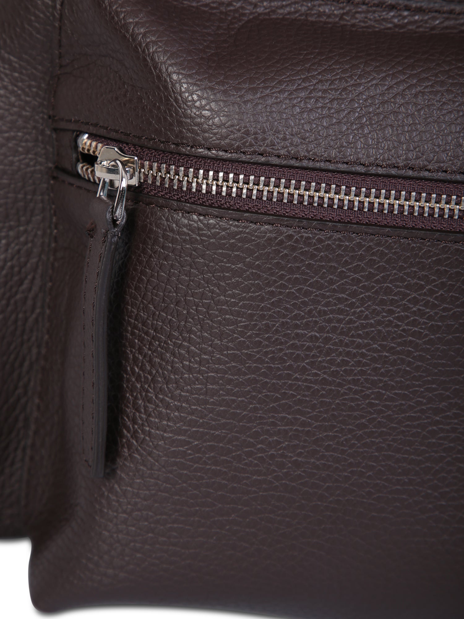 Top closure with double-slider zipper. Front zip fastening pocket. Two external side pockets. Two internal pockets. Two pen holders. Internal compartment for computer, Adjustable shoulder strap. Grained leather. Color: brown Depth: 14cm Height: 40cm Wi
