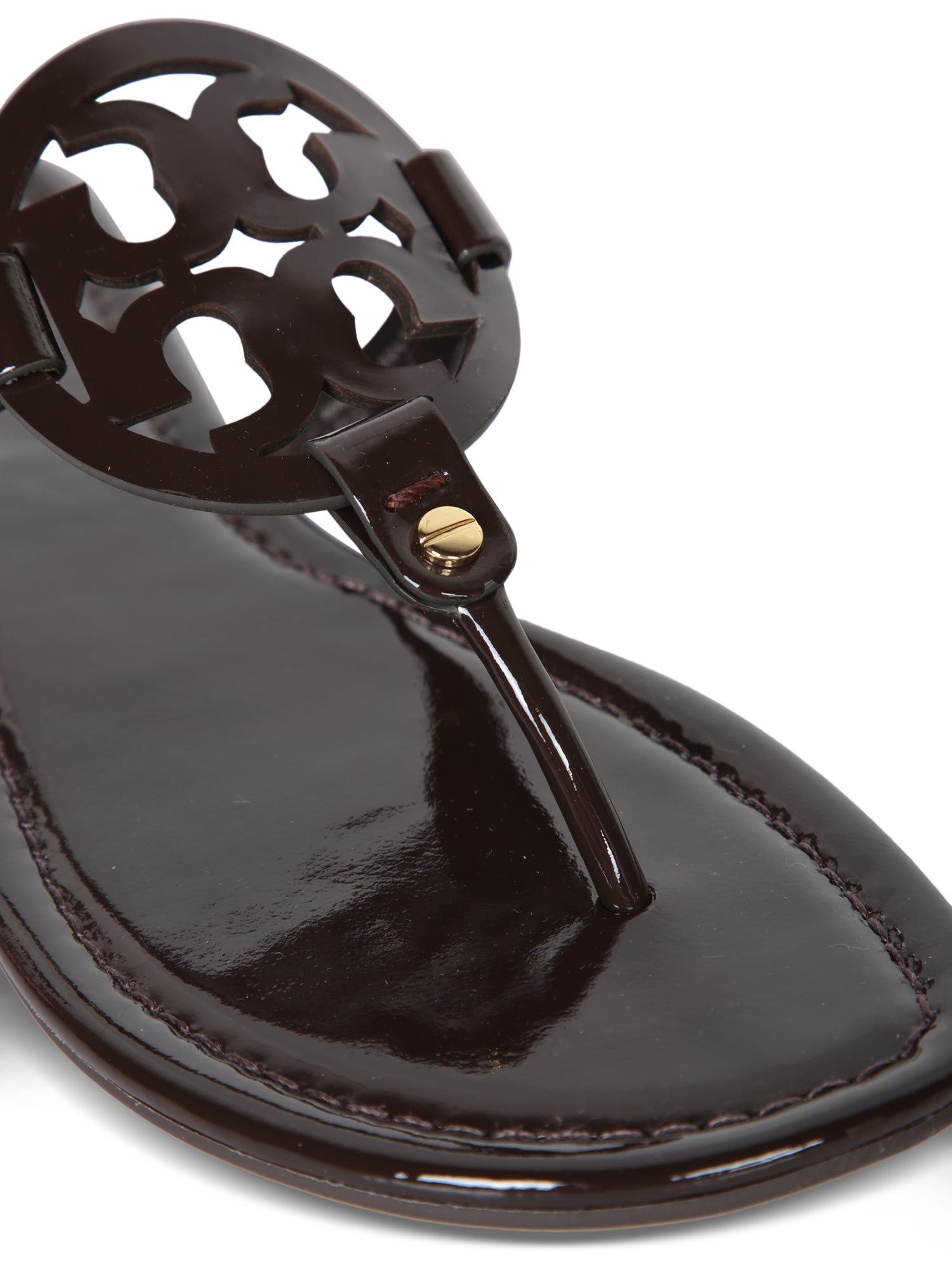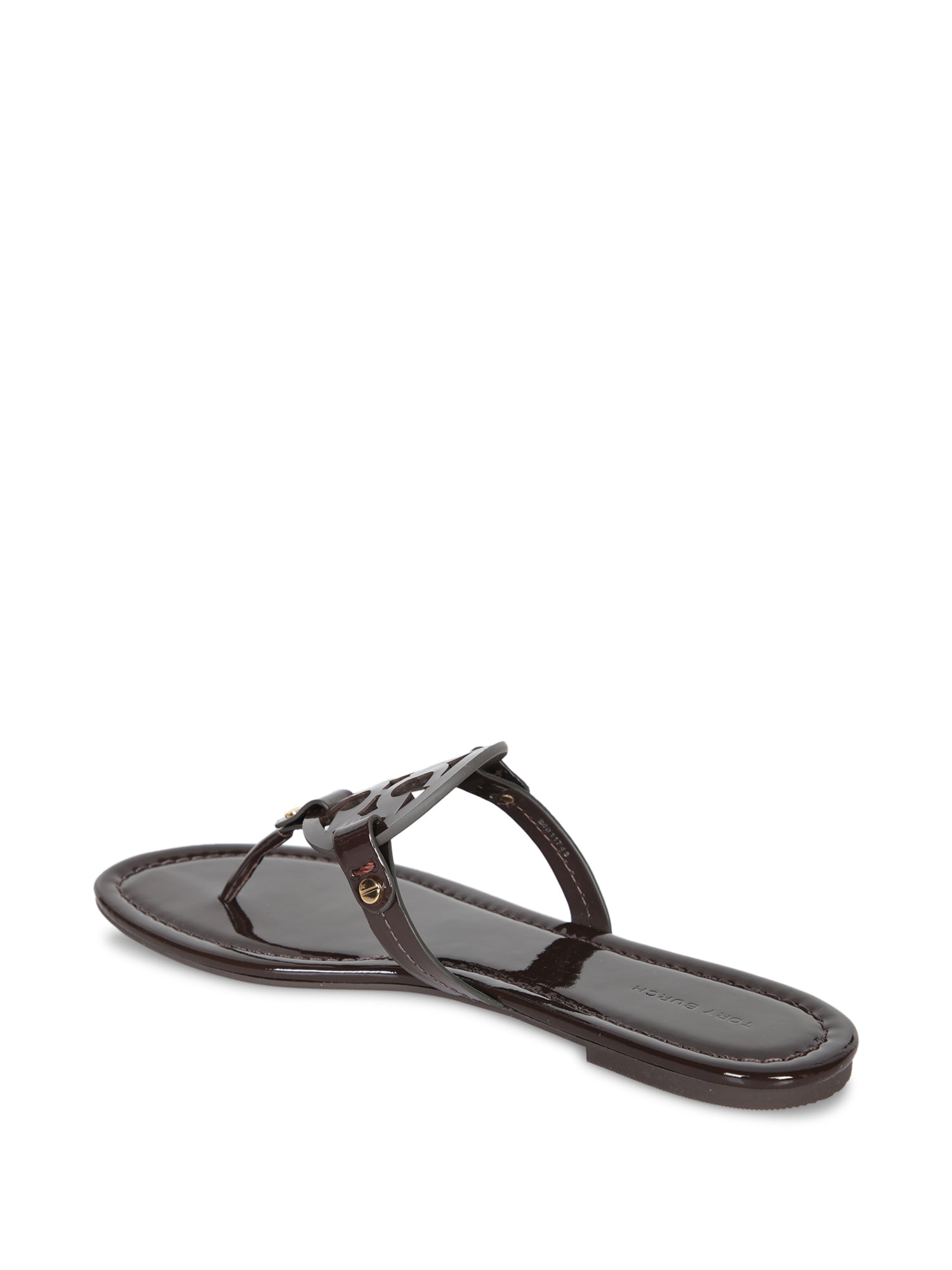 This Tory Burch Miller sandal blends sophistication with comfort. Crafted with a glossy patent finish, it features the signature decorative logo for a distinct touch of luxury. Perfect for dressy or casual-chic occasions.