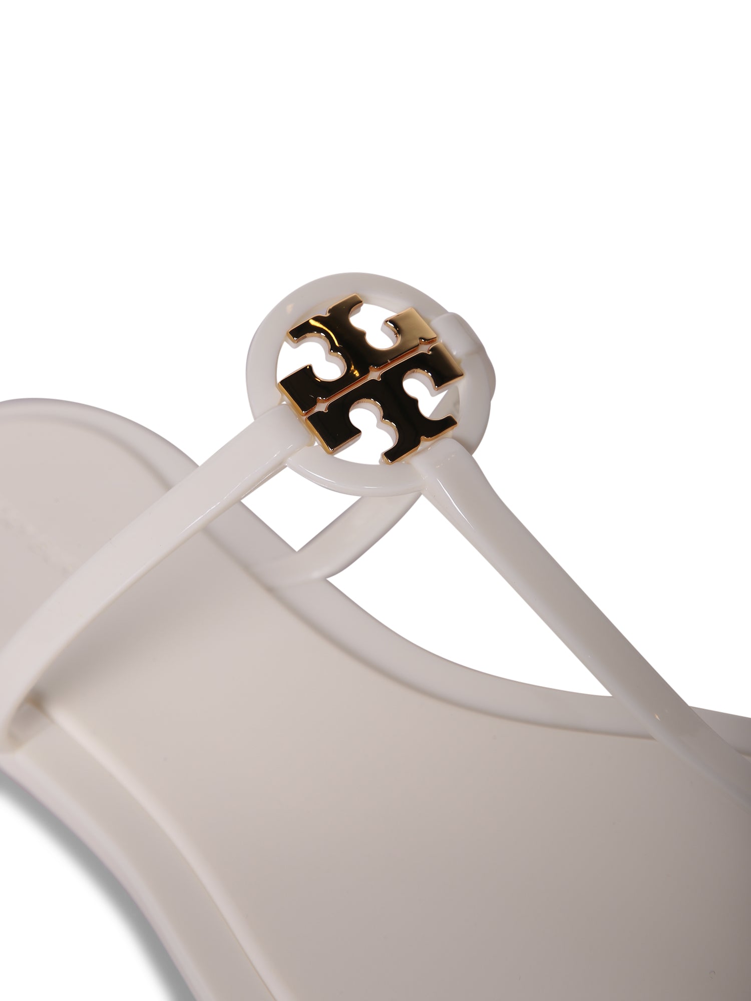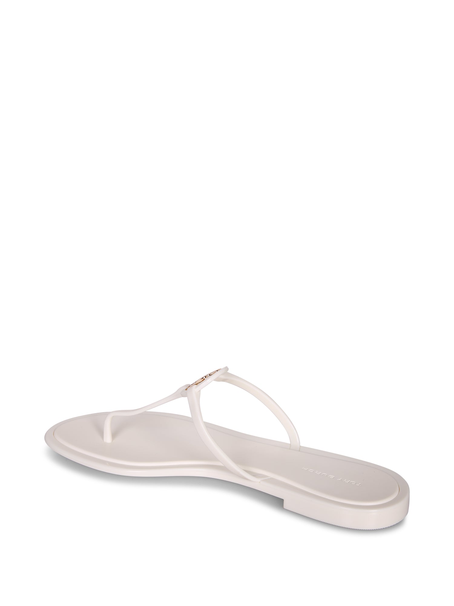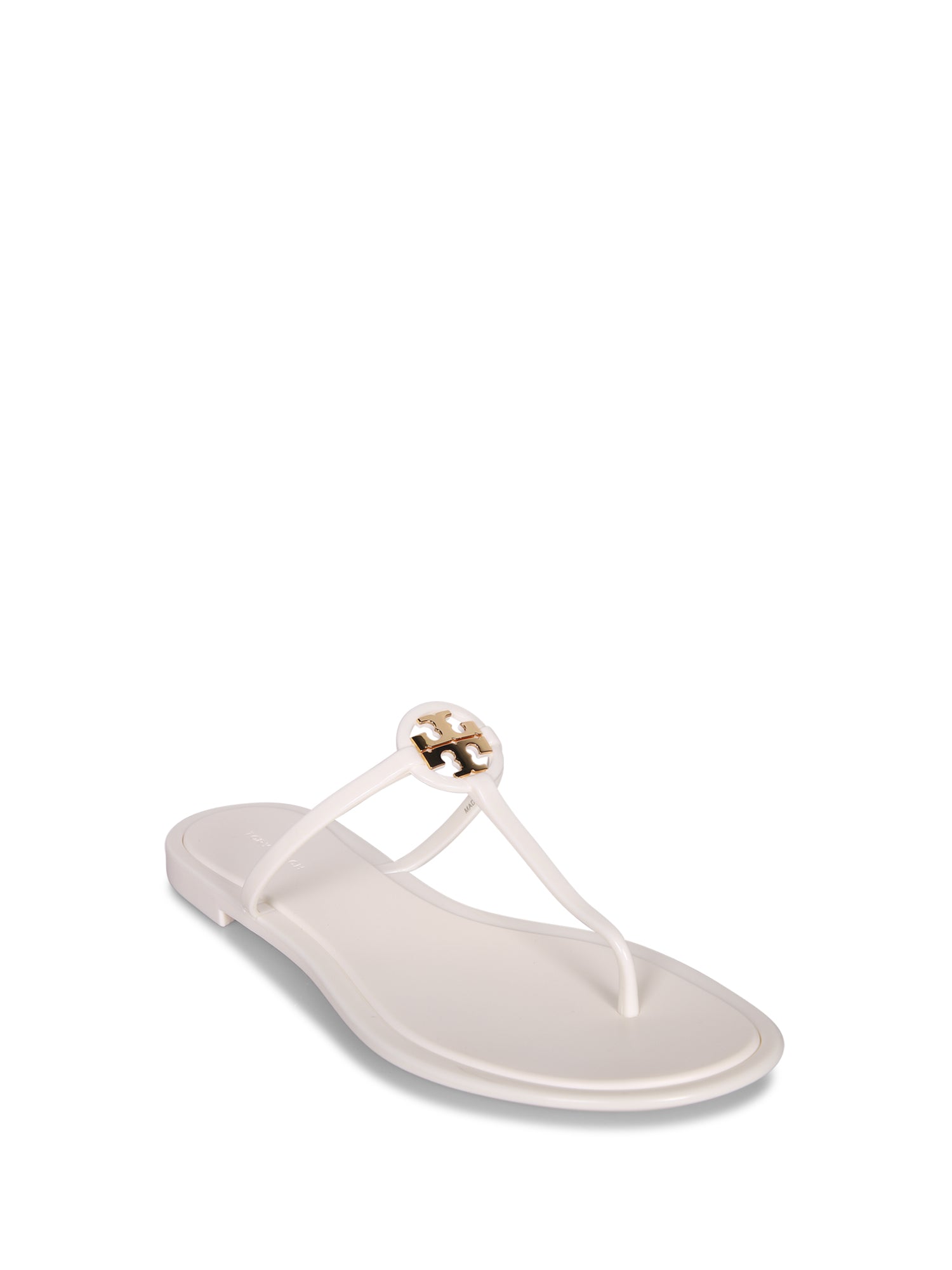 Flat sandal made of synthetic material. Metallic logo embellishment. Thong sandal design.
