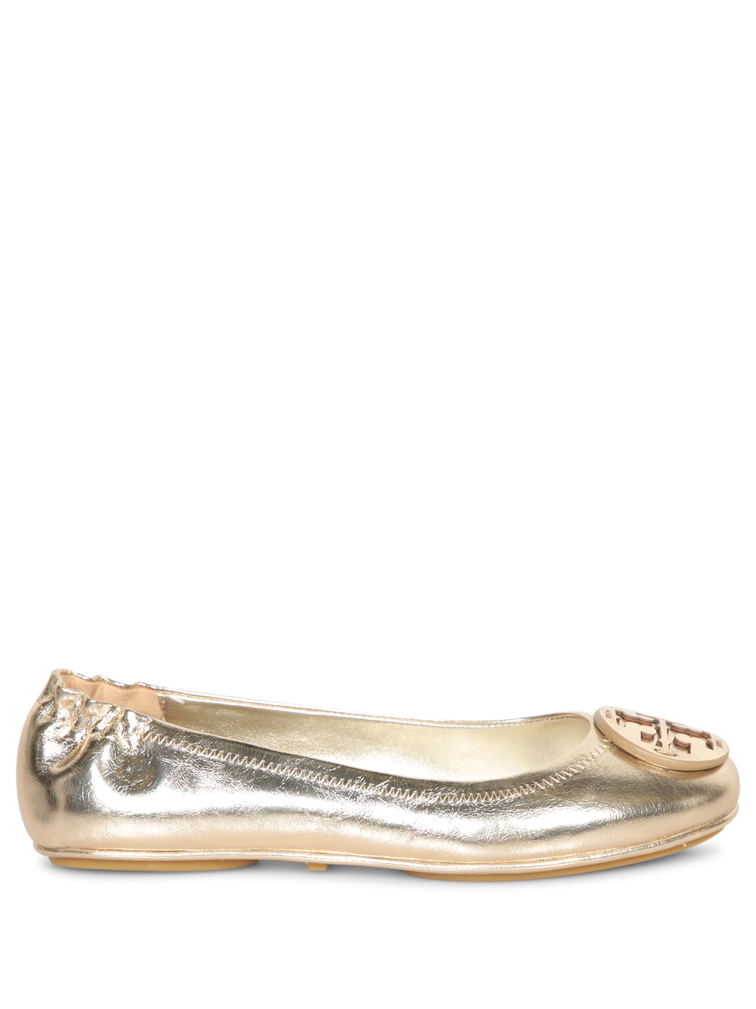 The epitome of portable elegance, this Tory Burch ballerina stands out with its gold metallic leather finish and comfortable foldable design, perfect for traveling in style.