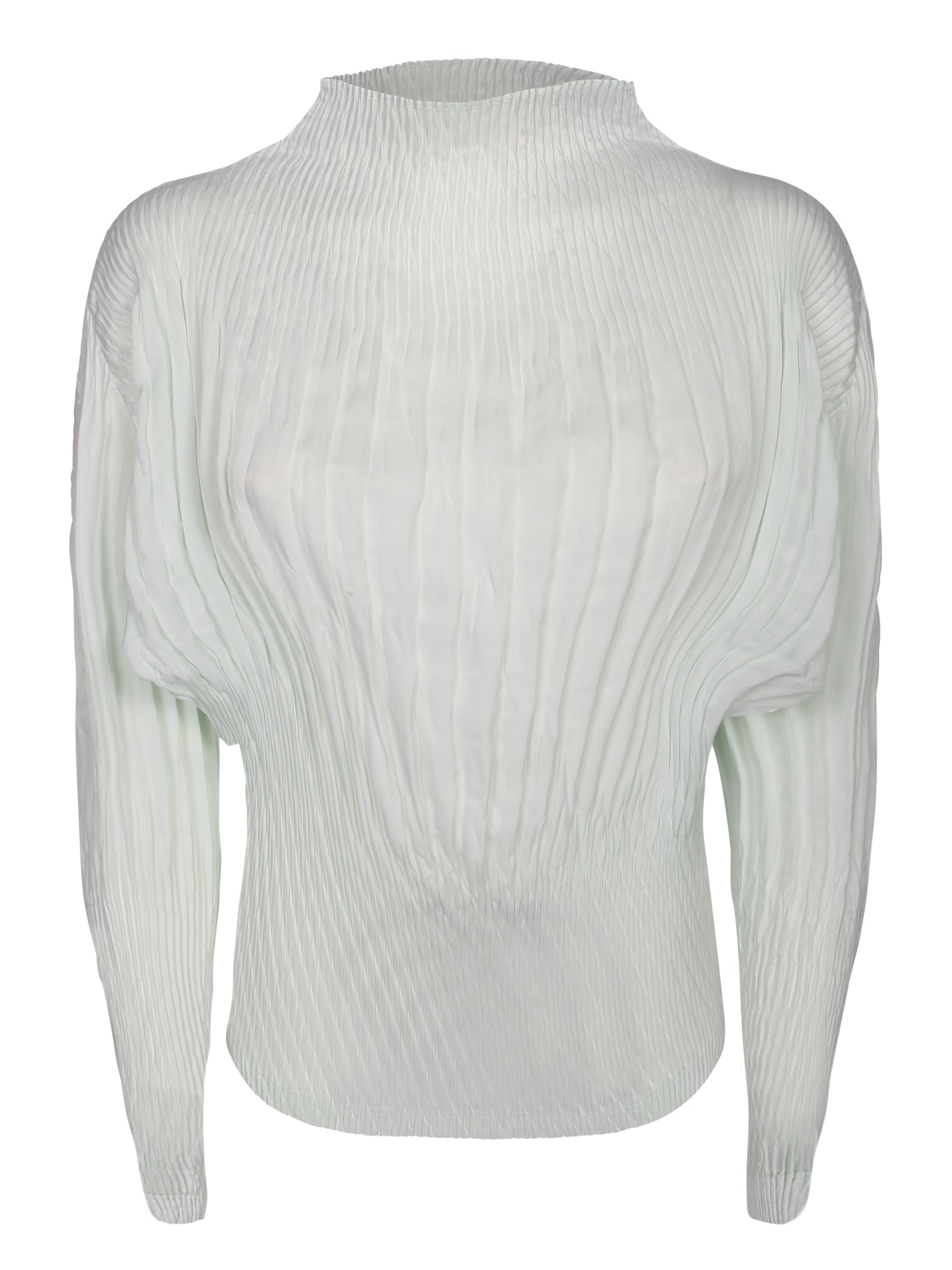 Blouse with long sleeves, high neck, and pleated detailing.