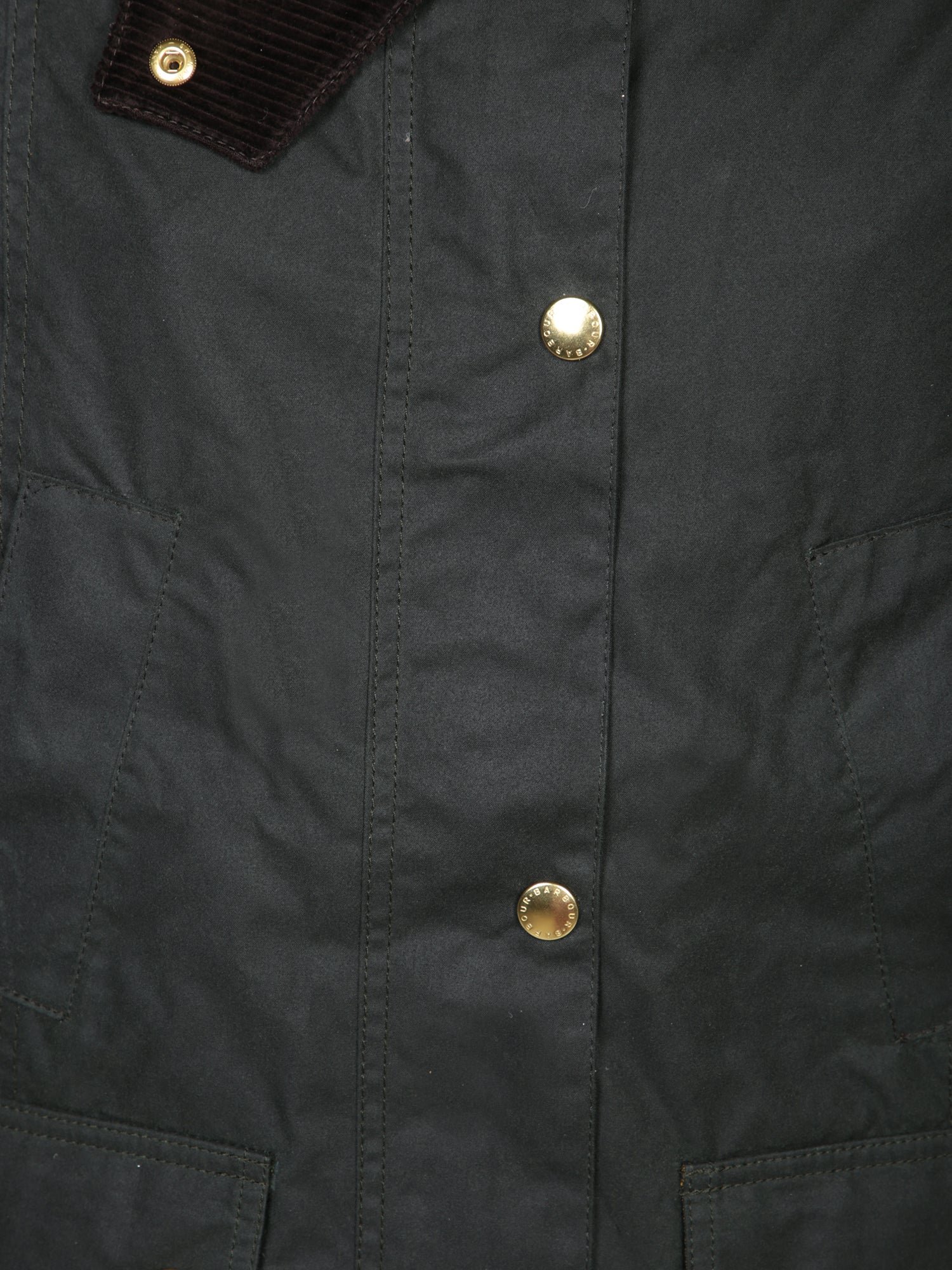 Waxed cotton jacket with corduroy collar, button closure, applied pockets, and embroidered logo.
