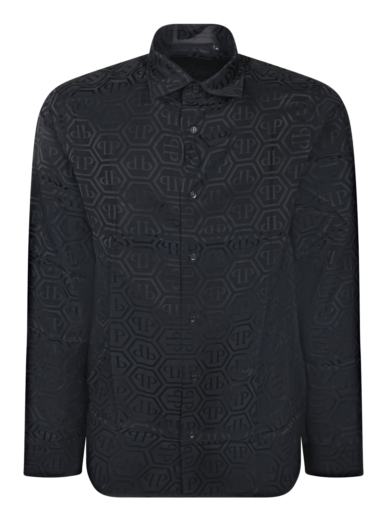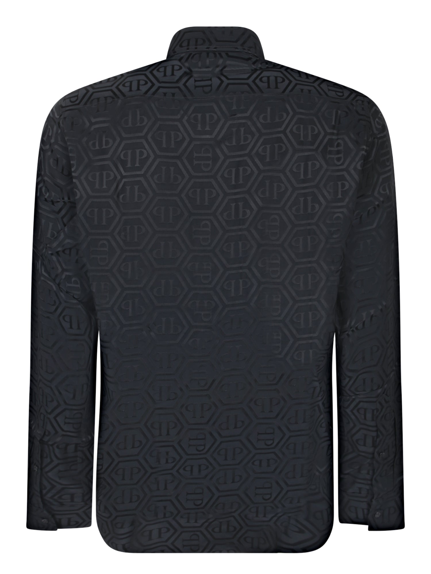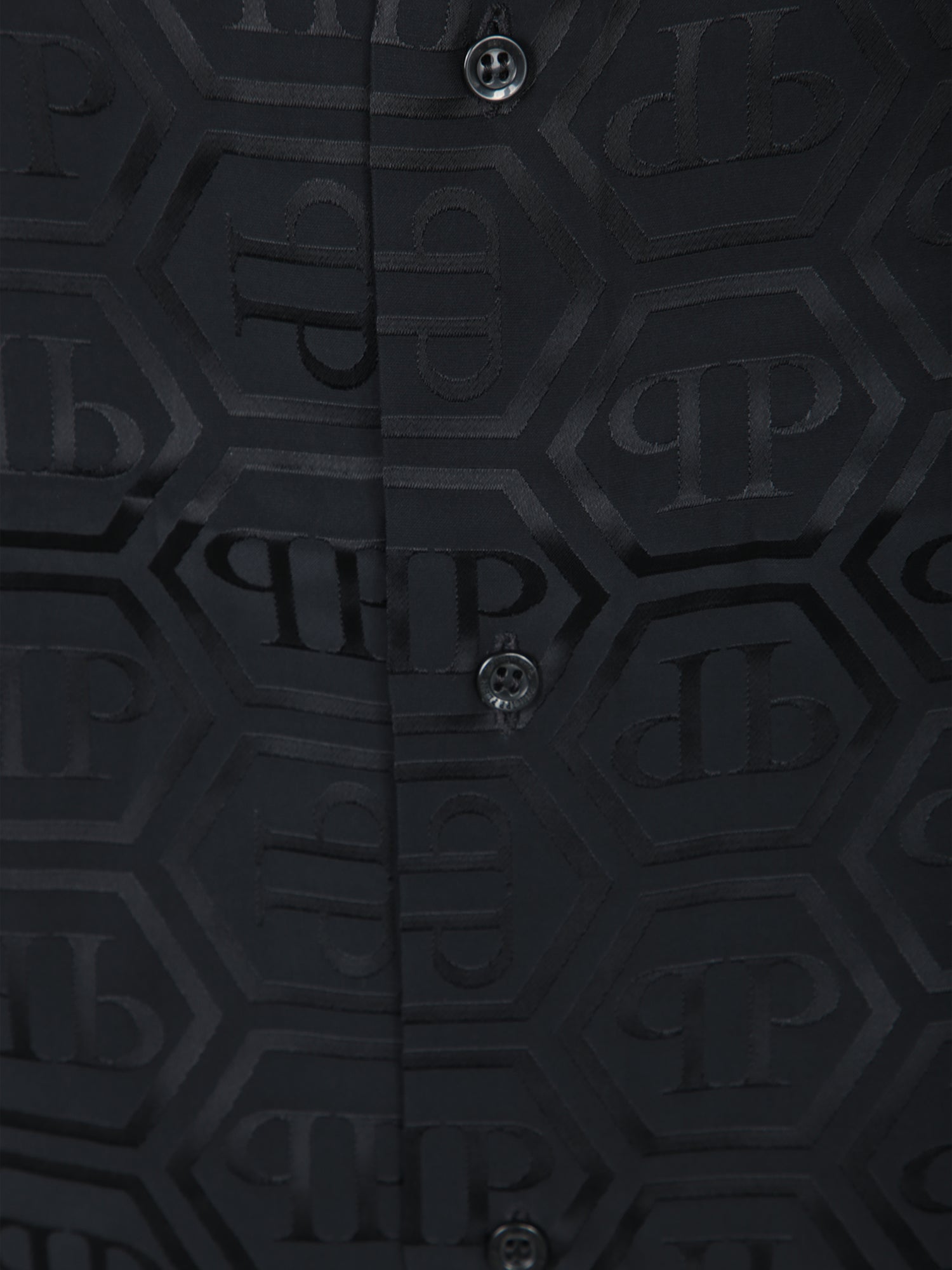Long sleeve shirt in pure silk. Classic collar. Front button closure. All-over monogram pattern.