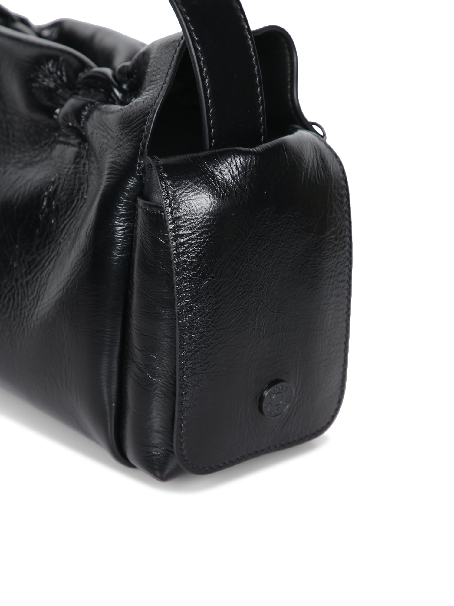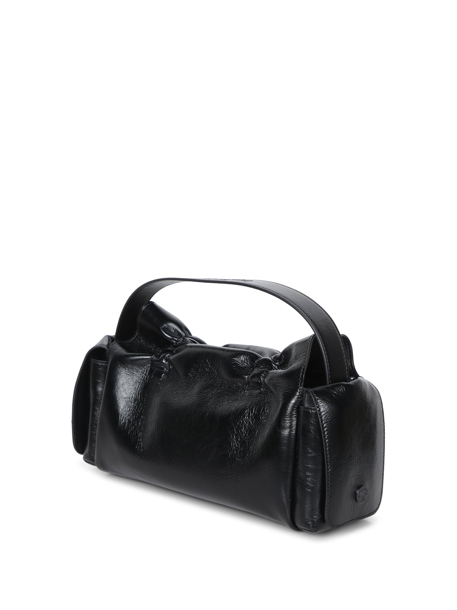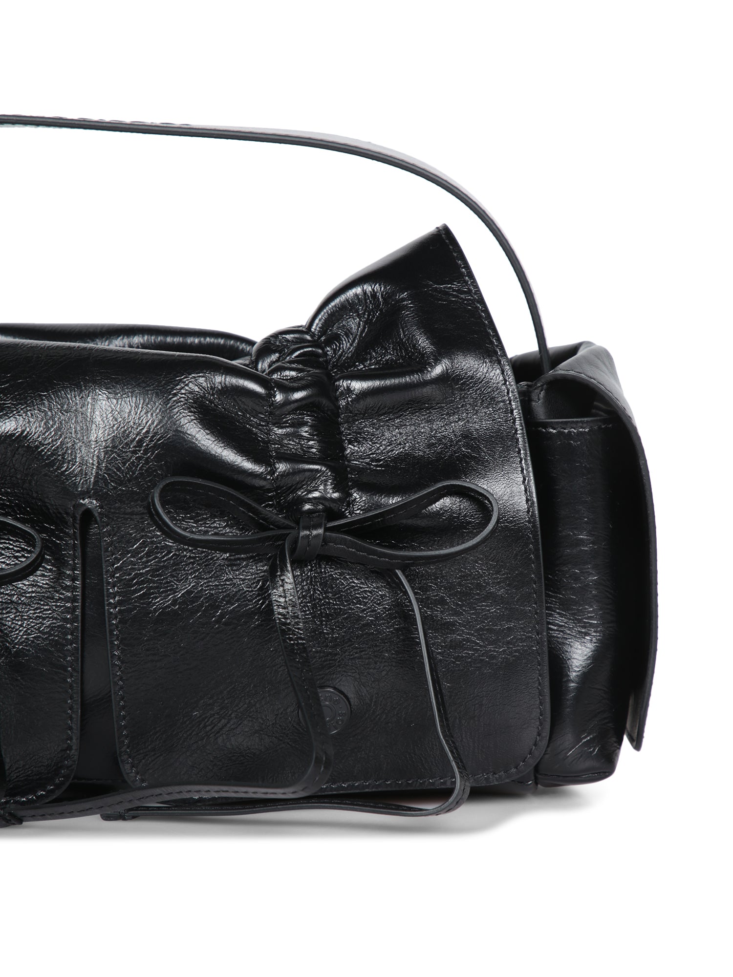 Explore the subtle elegance of Acne Studios with this black leather bag, featuring a rich exterior pocket design and finished with charming bow details.
