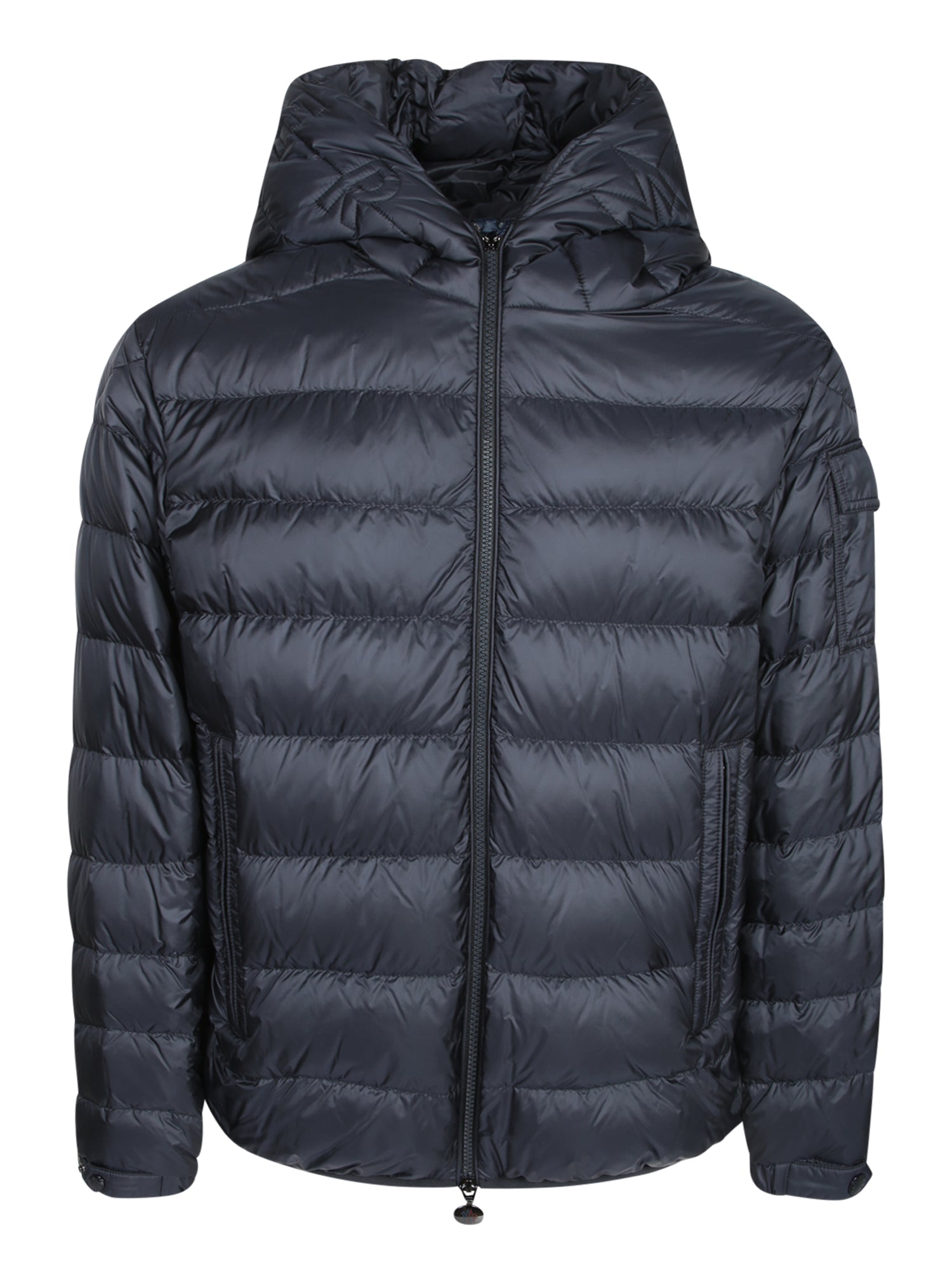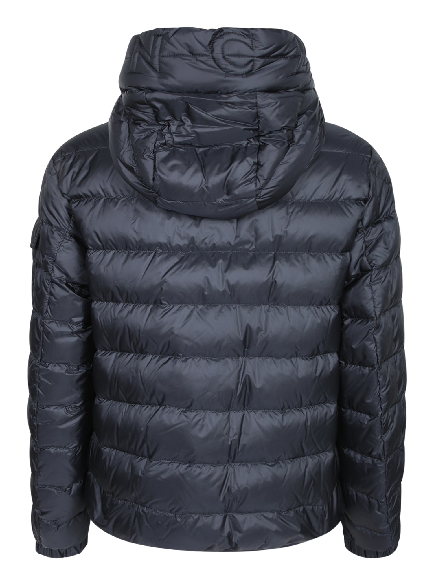Down jacket with hood, front zip closure, long sleeves, side zip pockets.