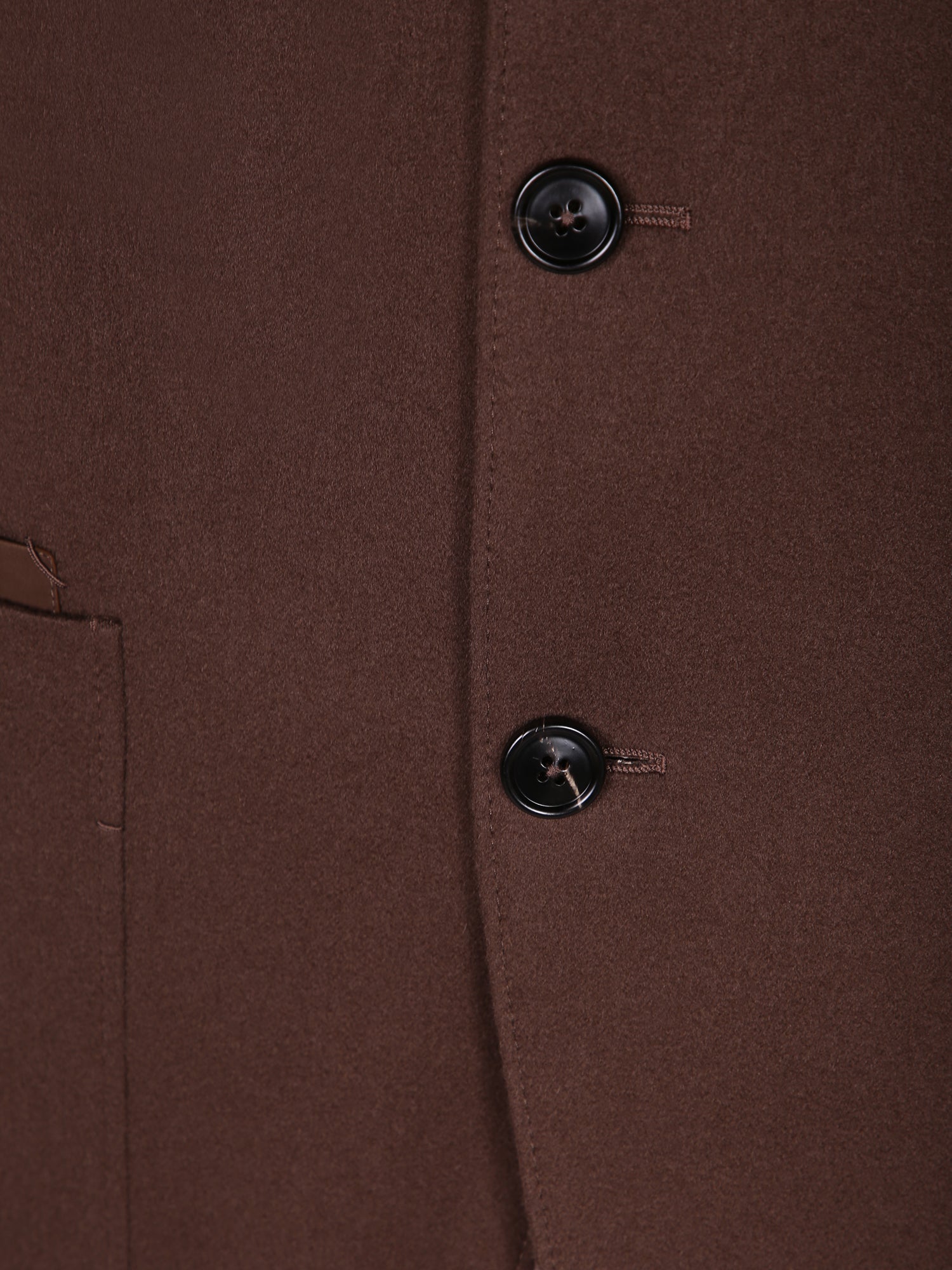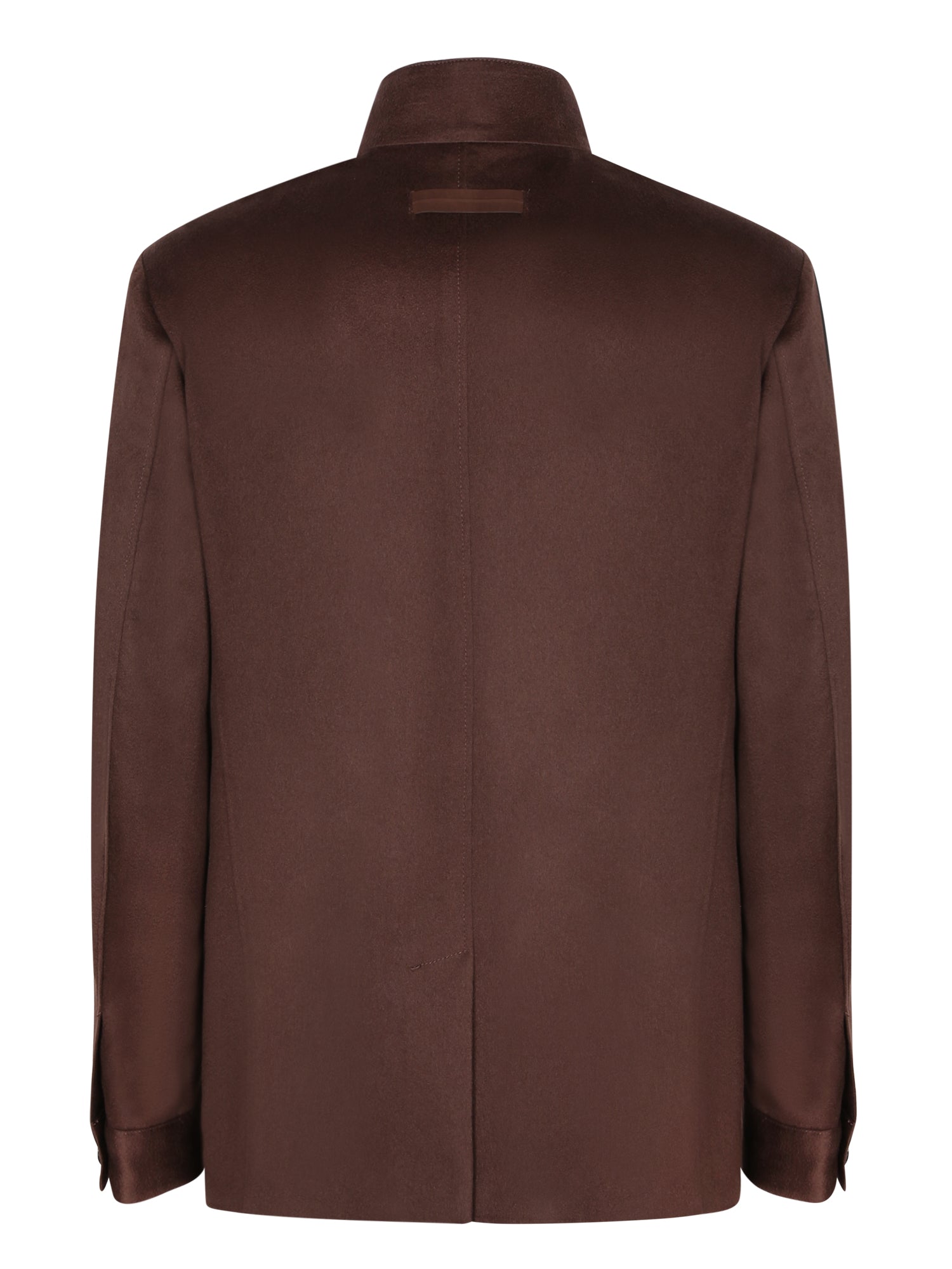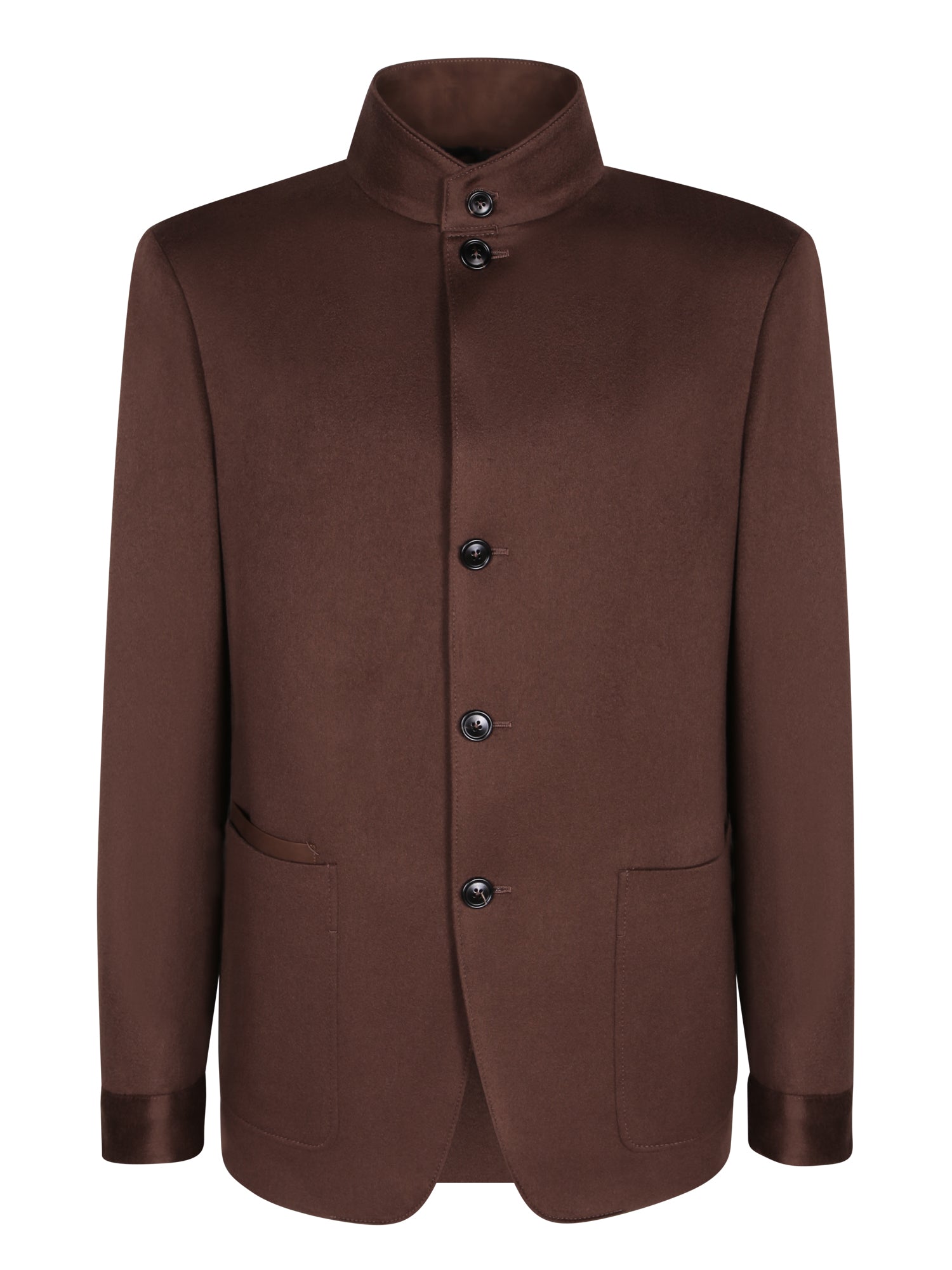 Cashmere jacket. Mandarin collar. Exposed button closure. Patch pockets.