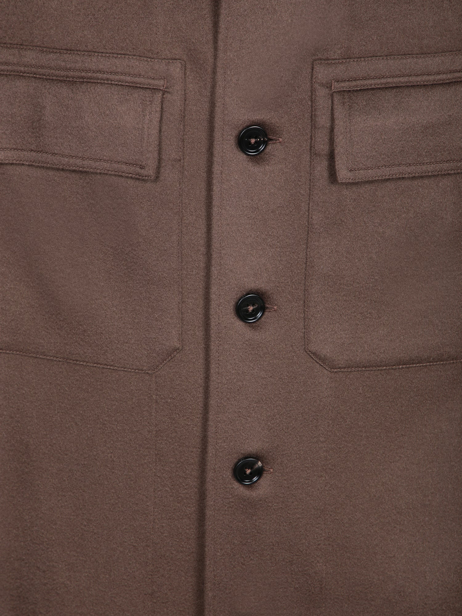 Cashmere overshirt with button closure. Taupe color. Two front flap pockets.