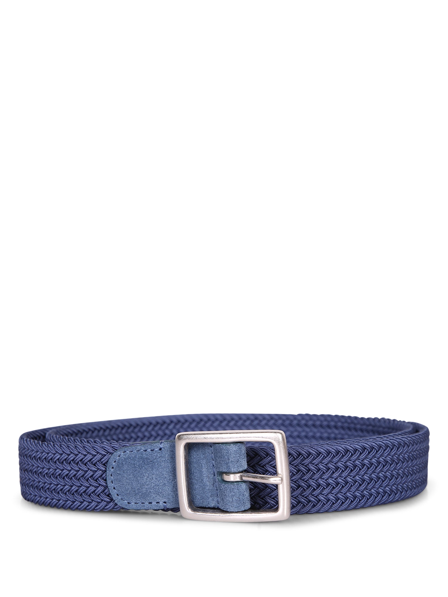 Square metal buckle. Suede leather detail. Braided stretch fabric.