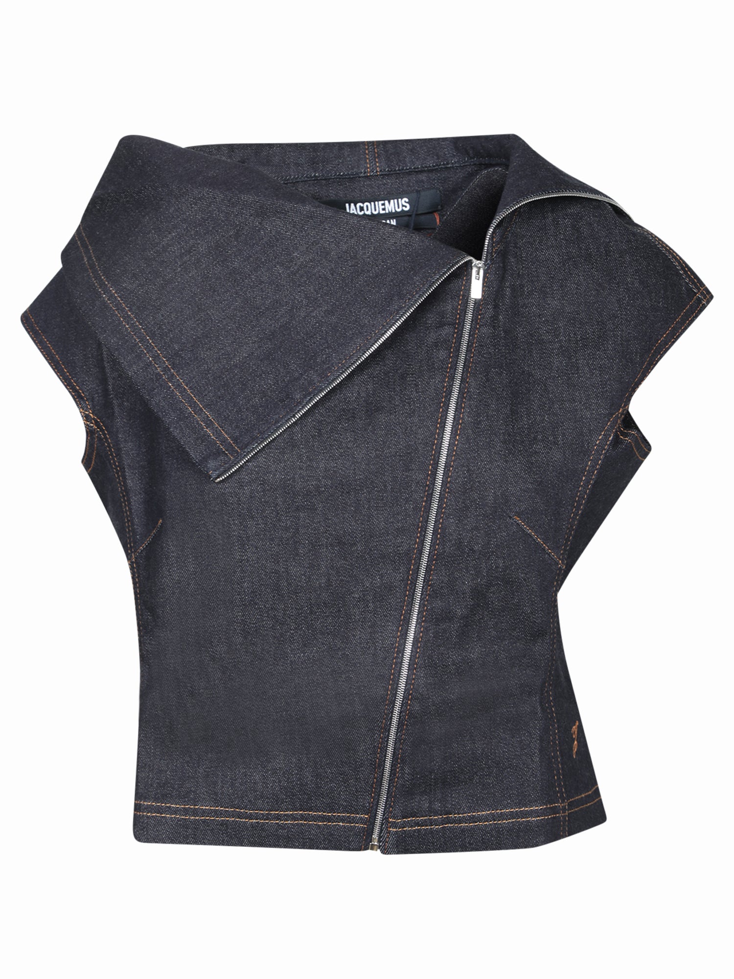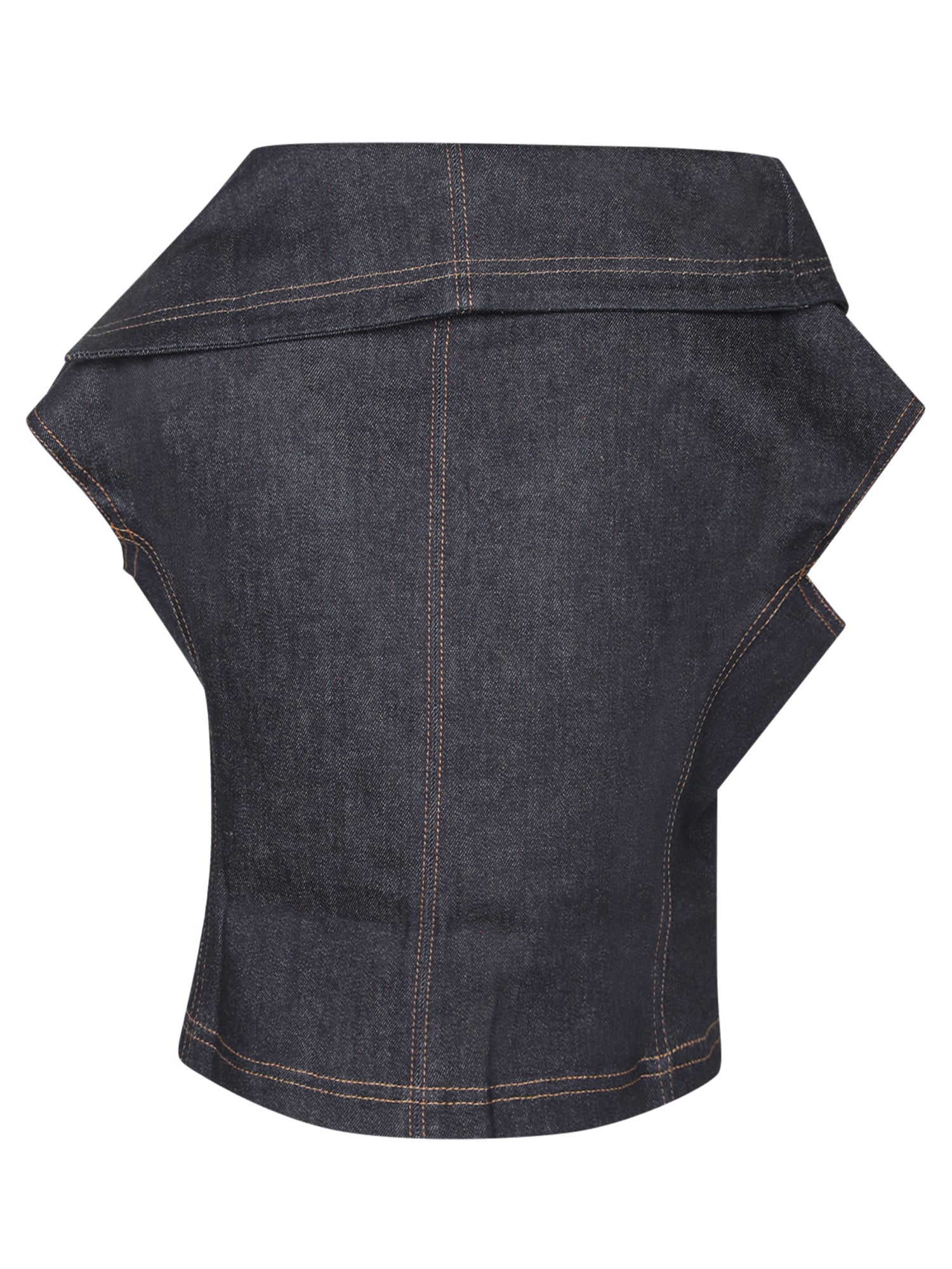 Sleeveless denim top. Oversized V-neck collar. Front zip closure.