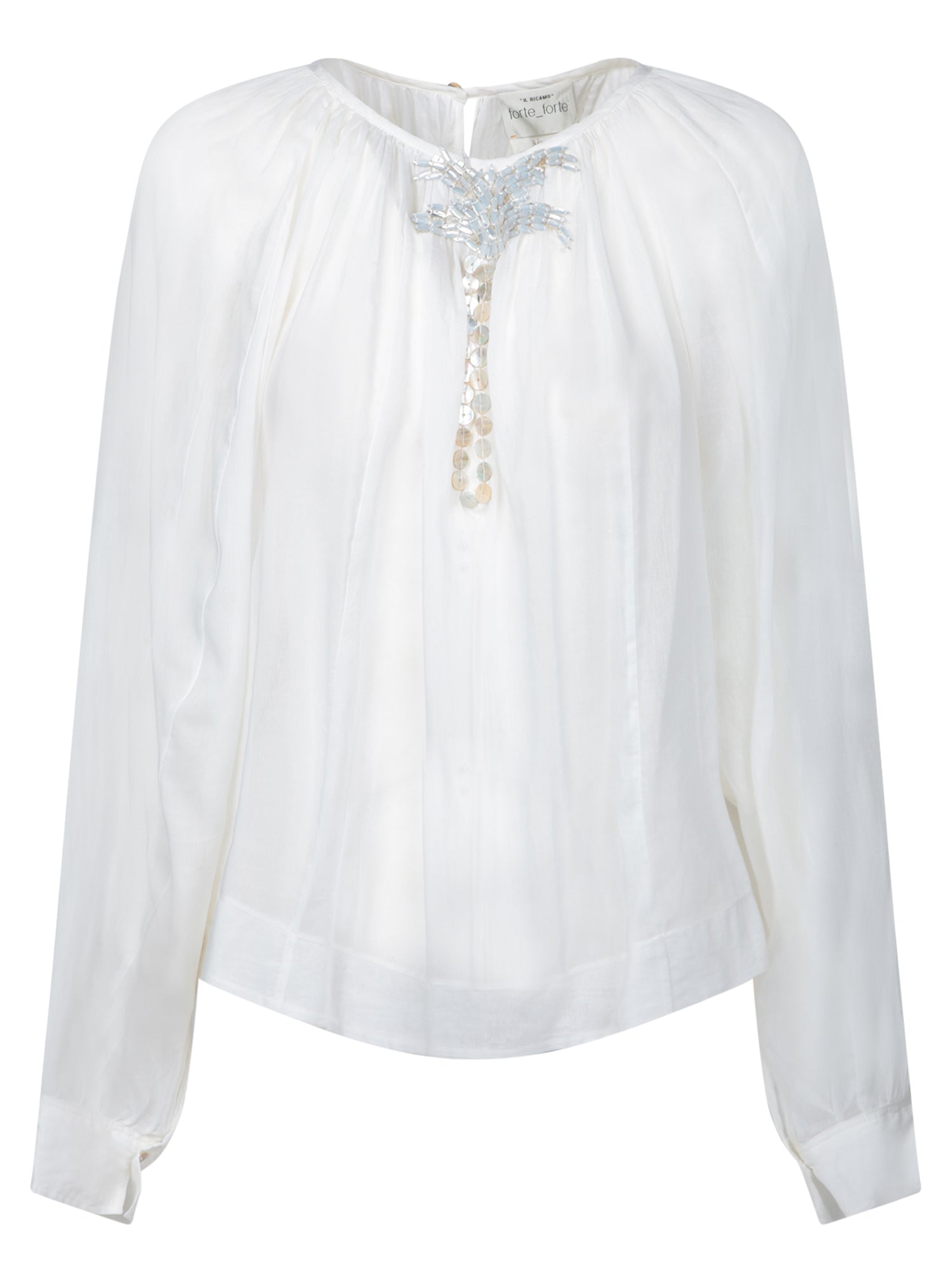 Showcase refined bohemian style with this white shirt from FORTE FORTE, featuring a bead-embellished front detail and a flowing design.