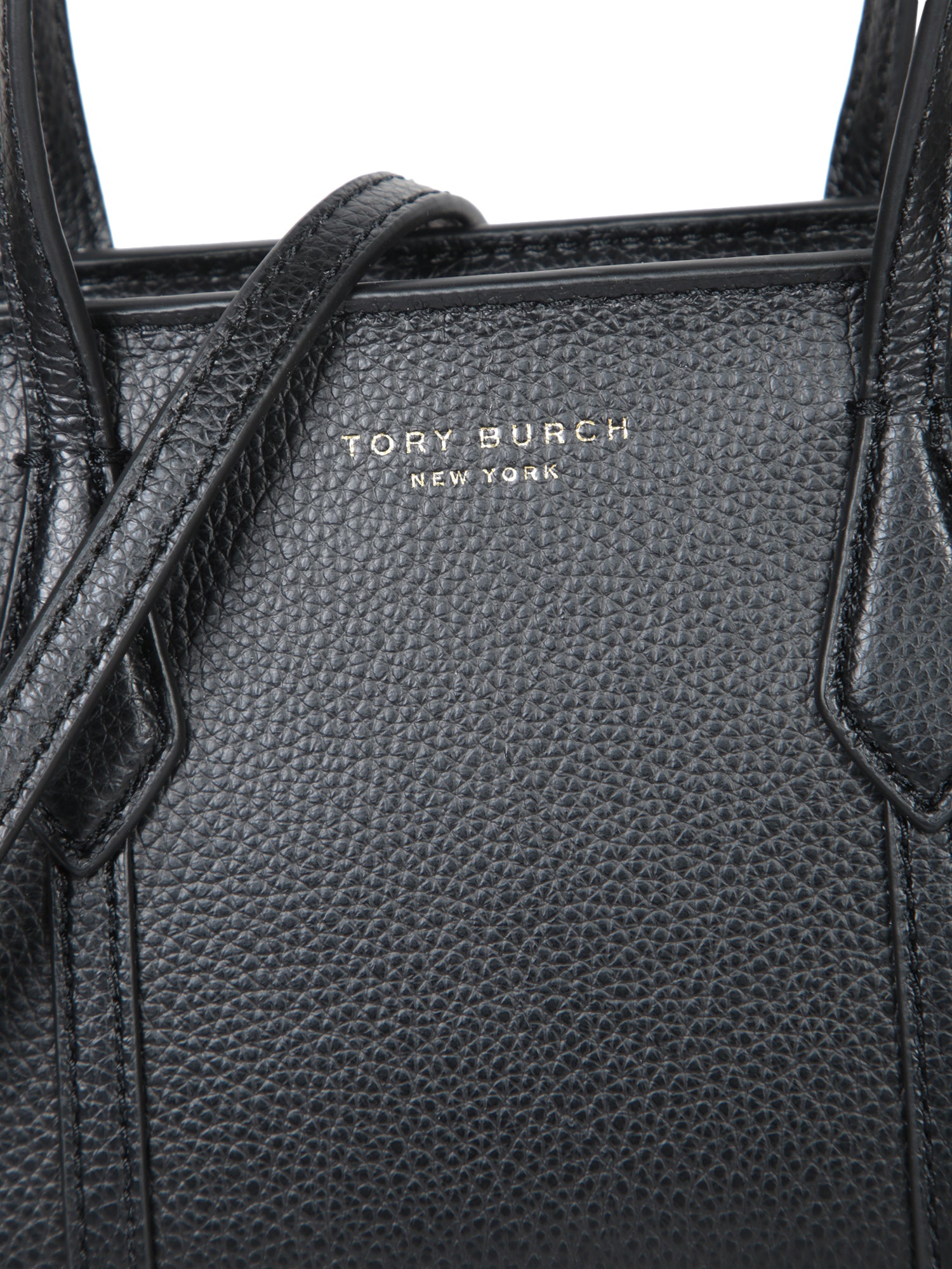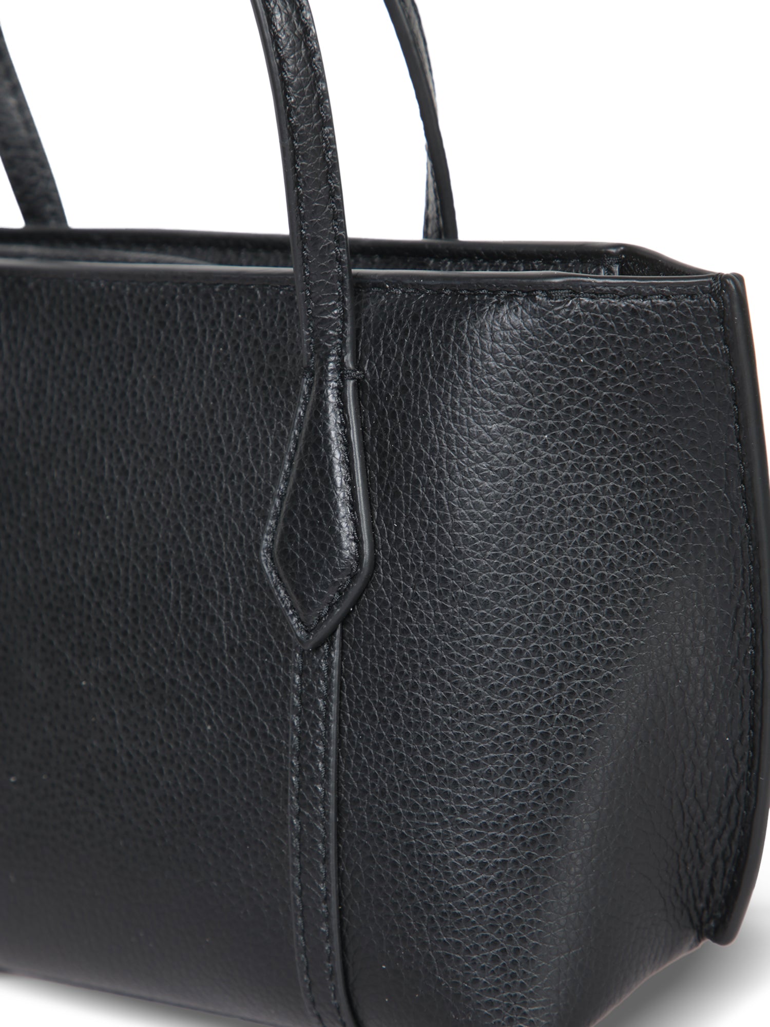Leather bag with hand-stitched details. Features a magnetic closure and dual handles.