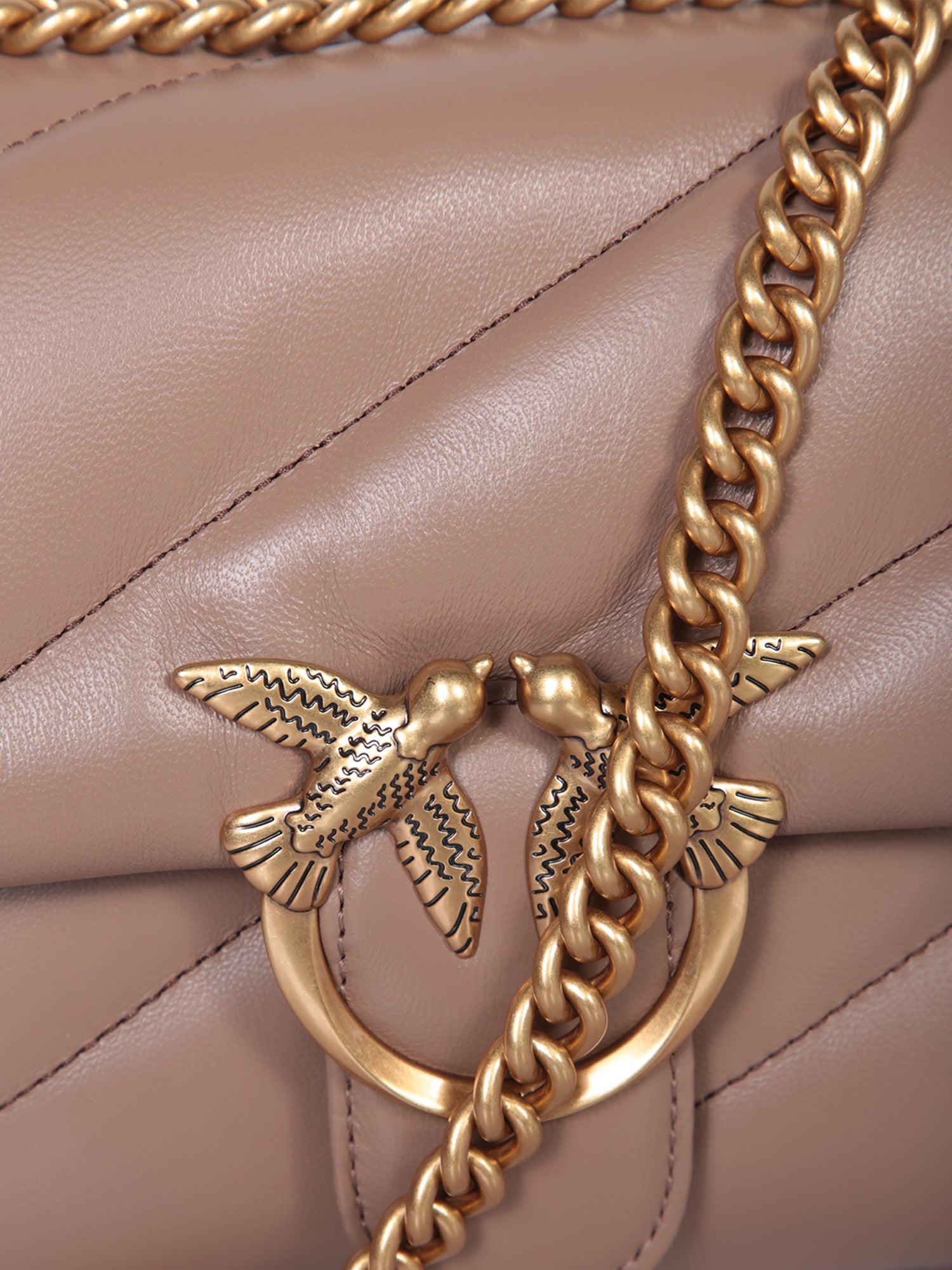 Quilted effect fabric. Golden Love Birds lock closure. Chain shoulder strap.