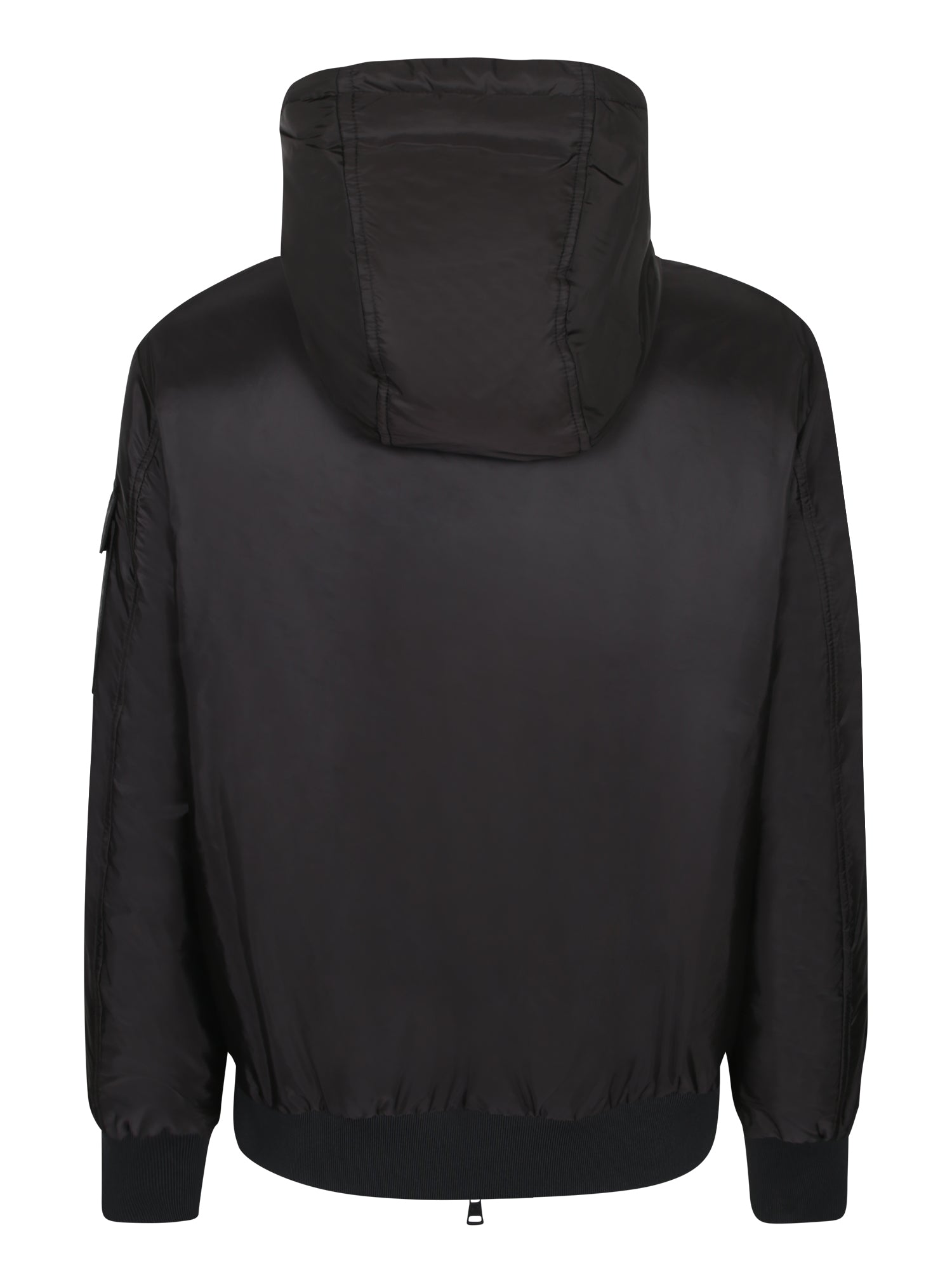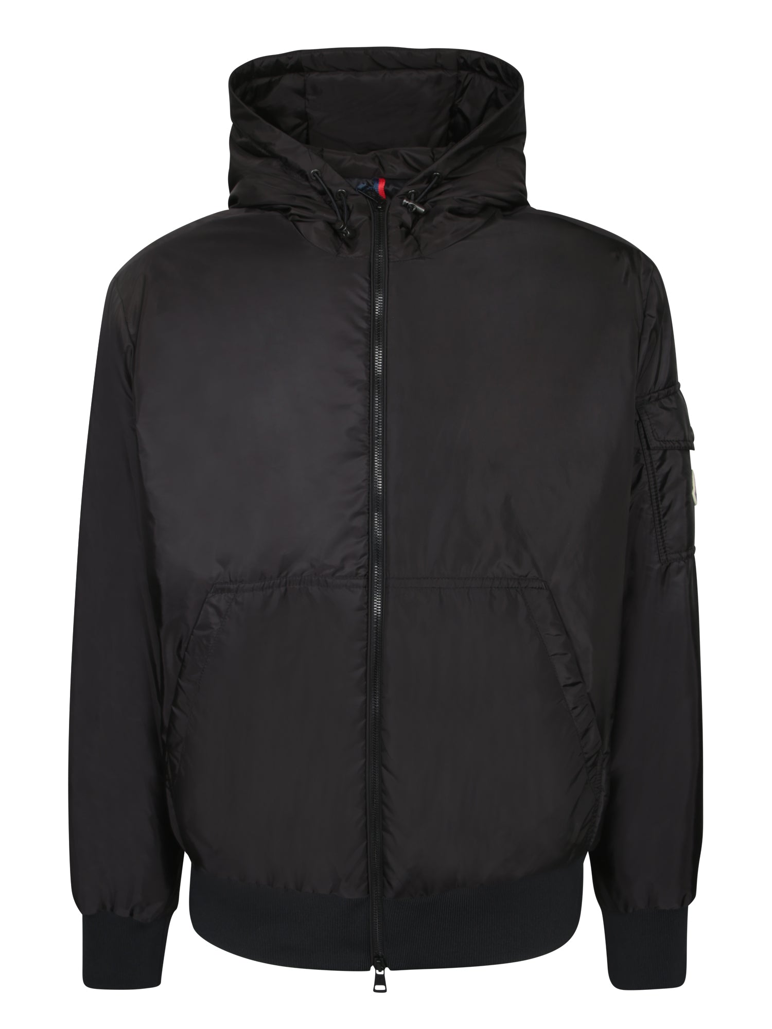 Hooded jacket with front zip closure, side zip pockets, long sleeves with a small pocket on the left arm.