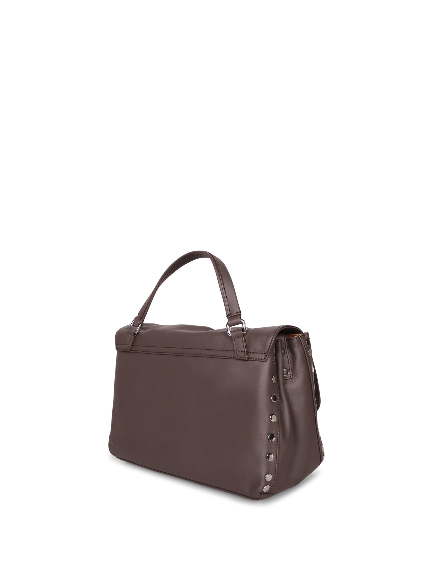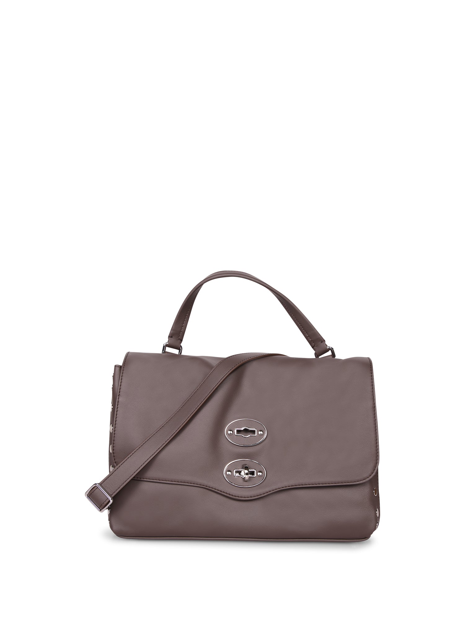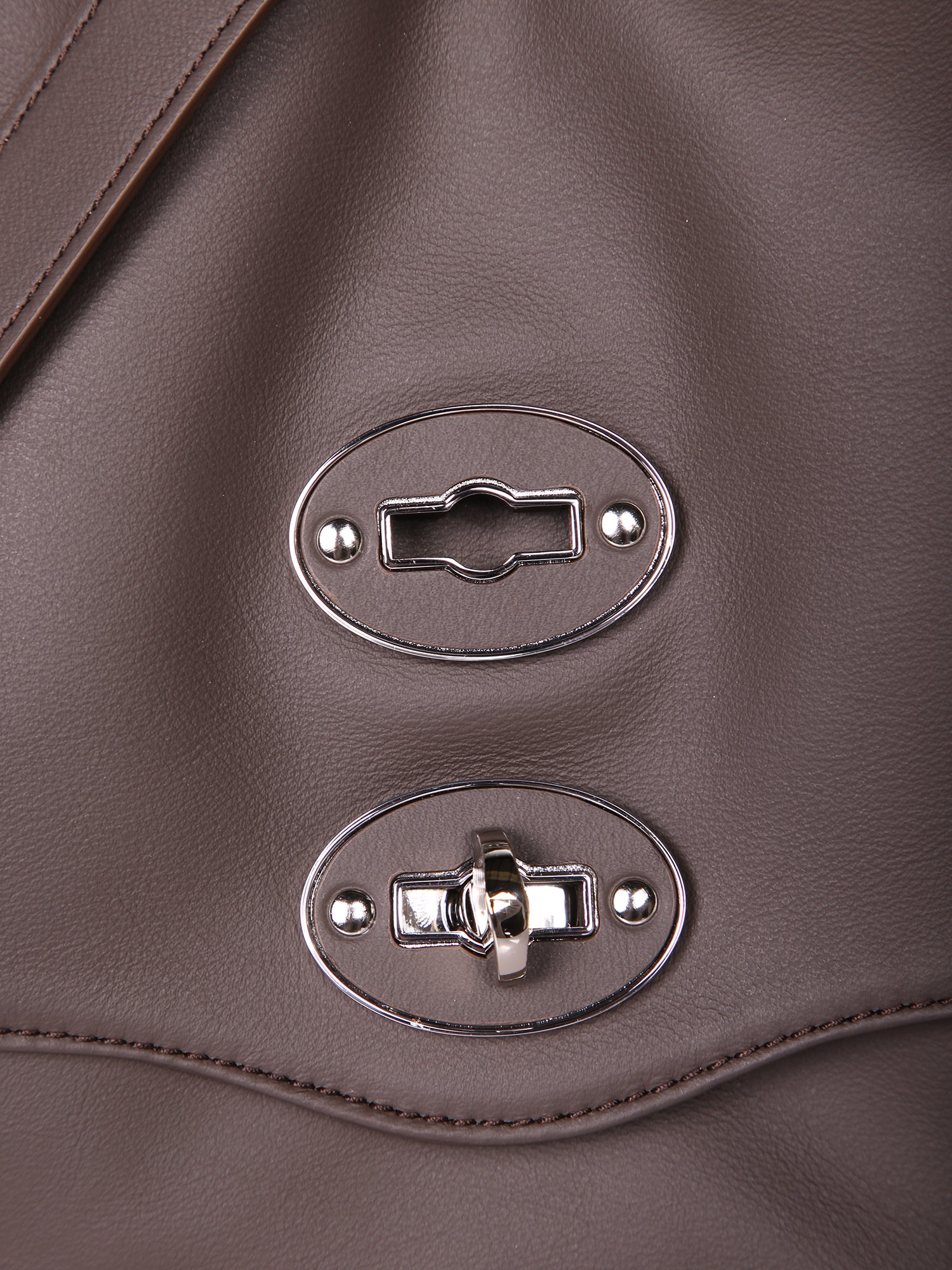 Brown leather bag. Lever lock closure. Adjustable and removable shoulder strap.