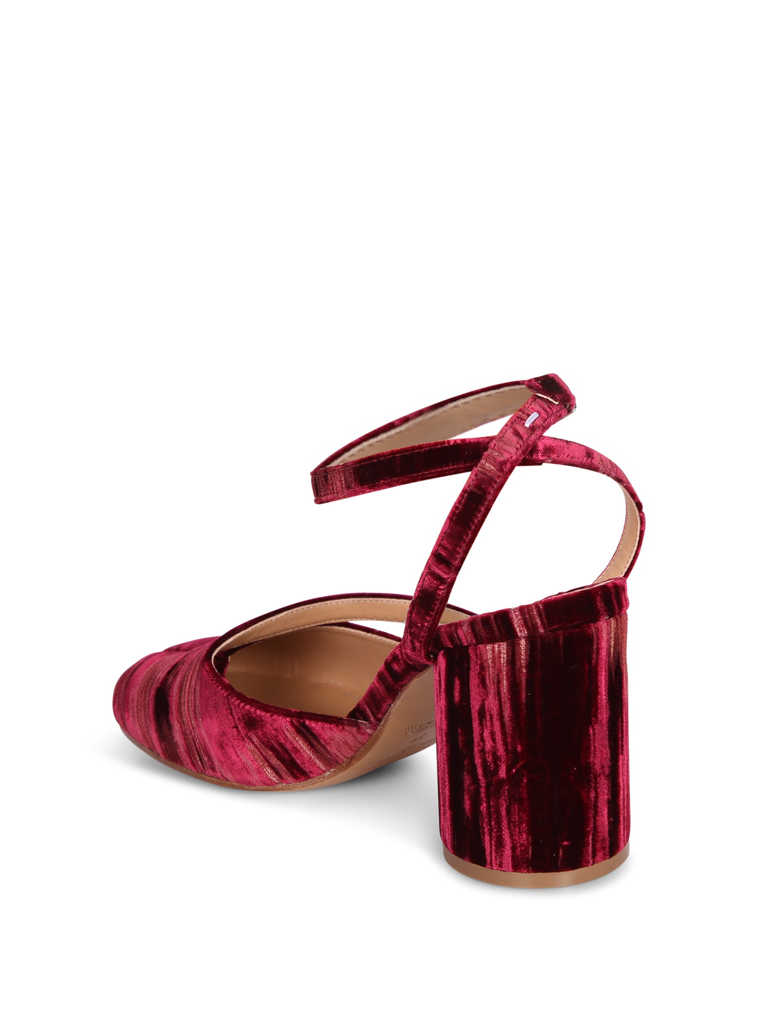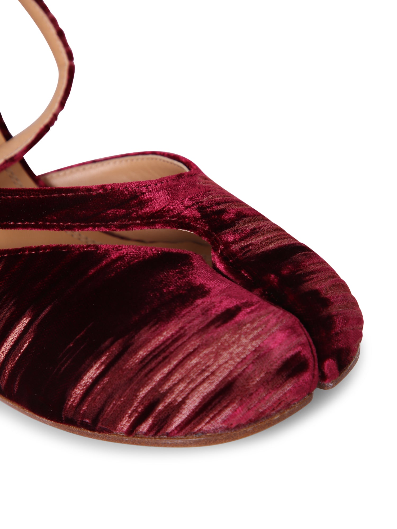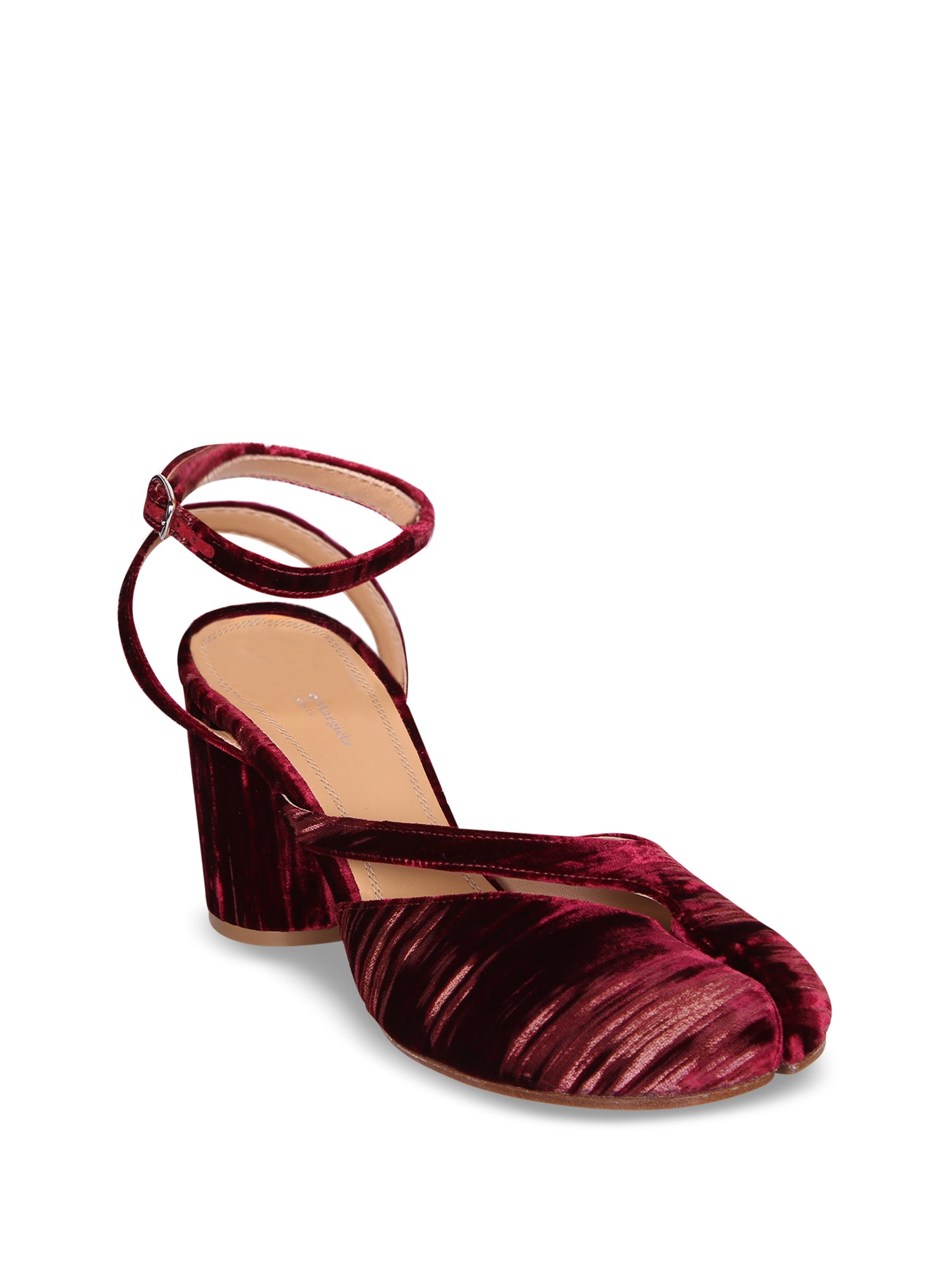 High cylindrical heel, ankle strap with buckle, distinctive split toe.
