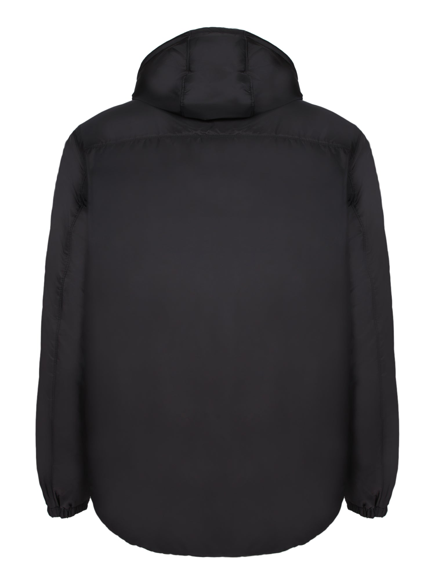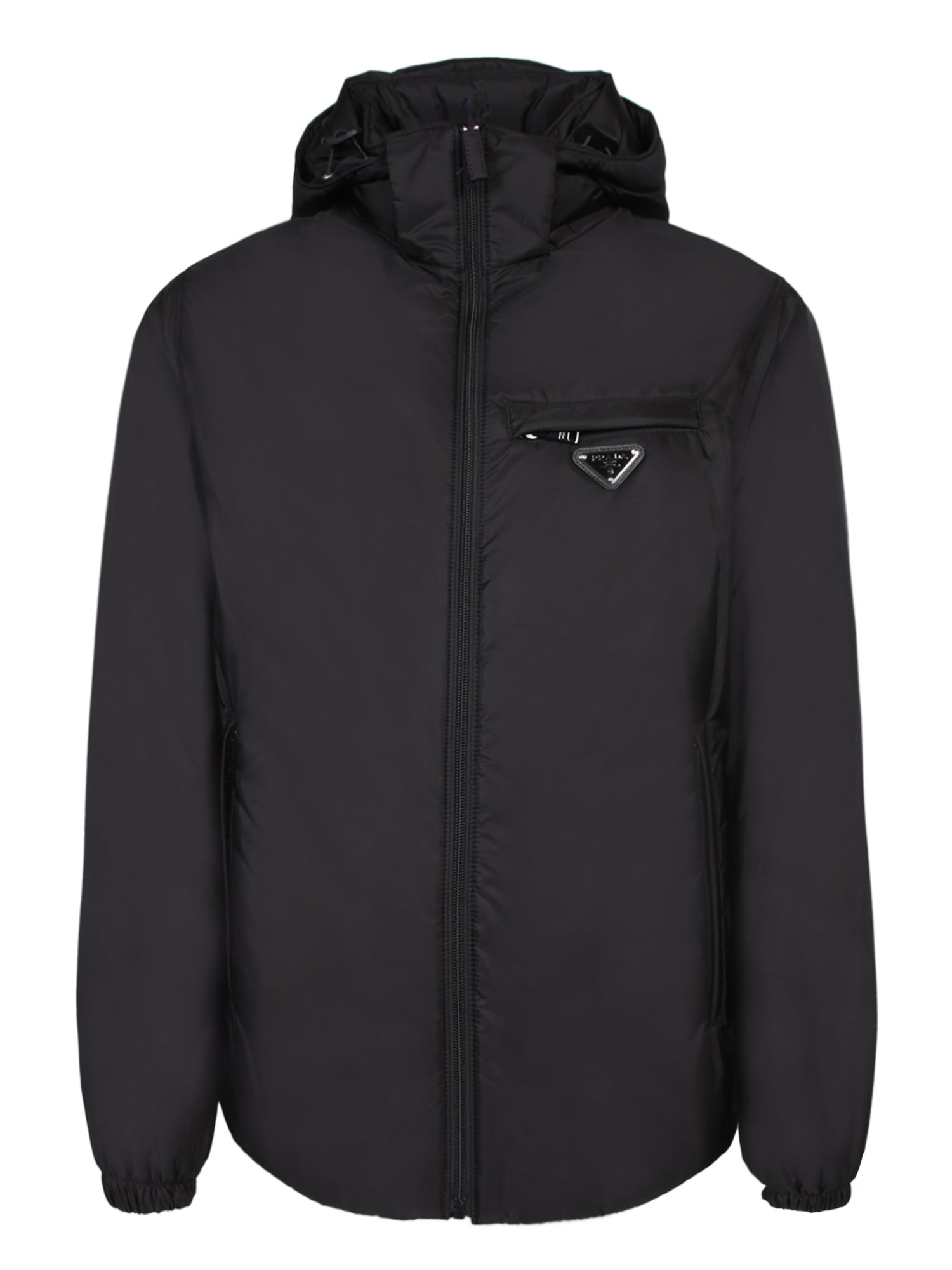 Down jacket with adjustable hood. Triangle Prada logo pocket on the chest. Elasticated cuffs.