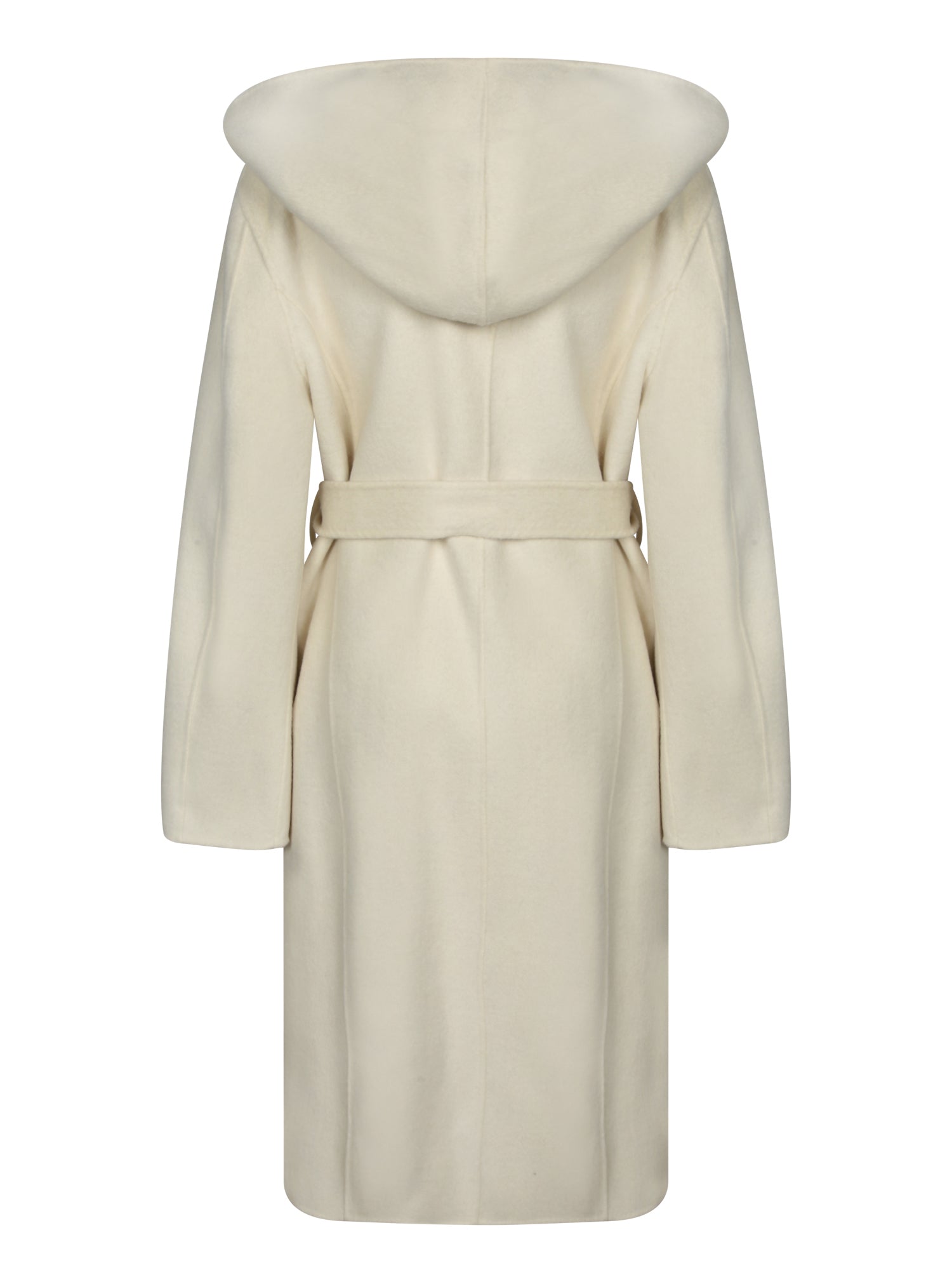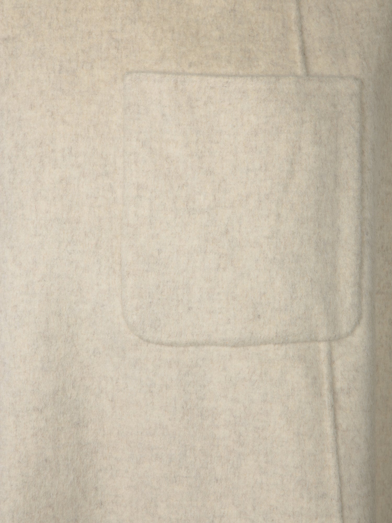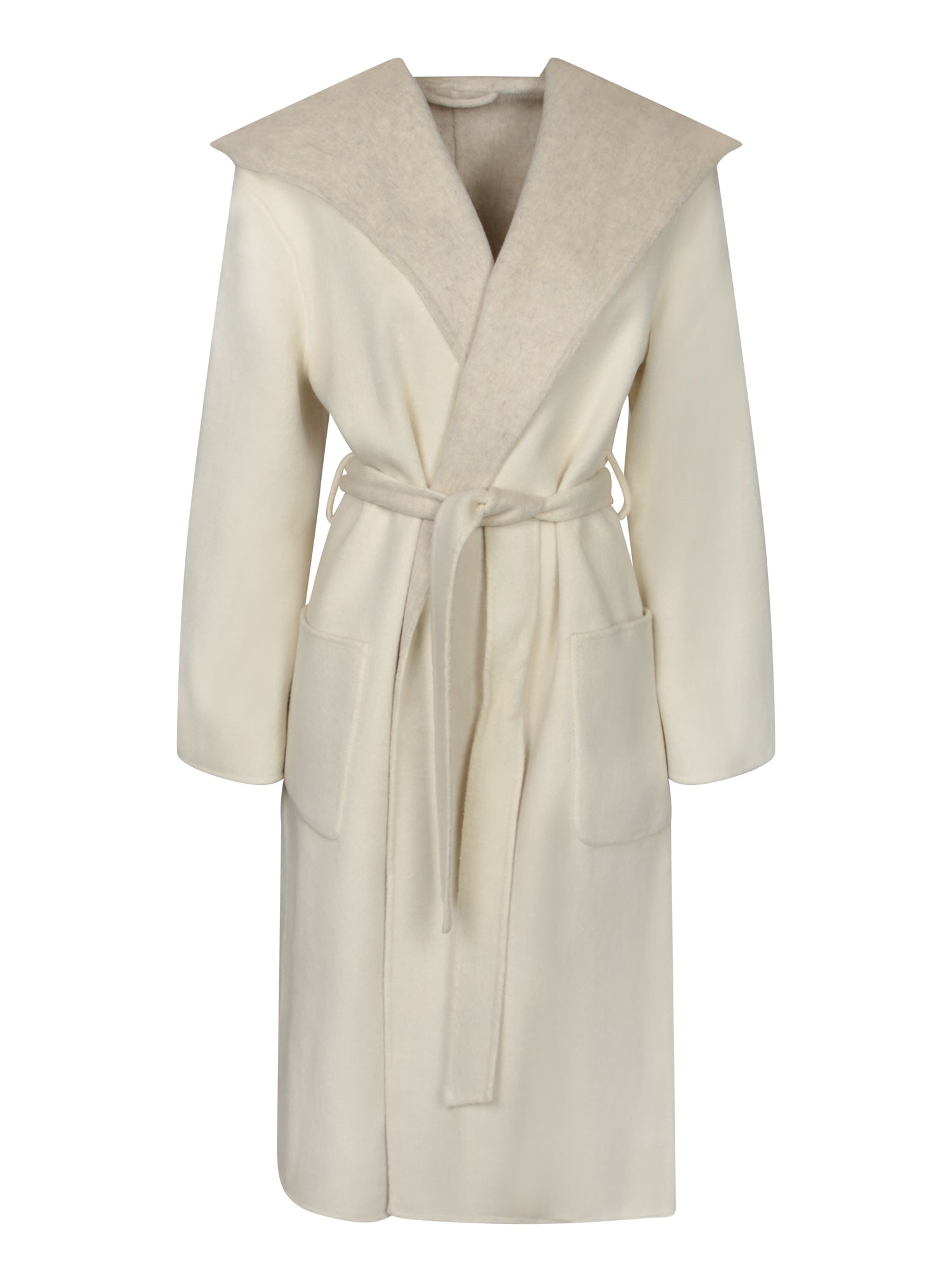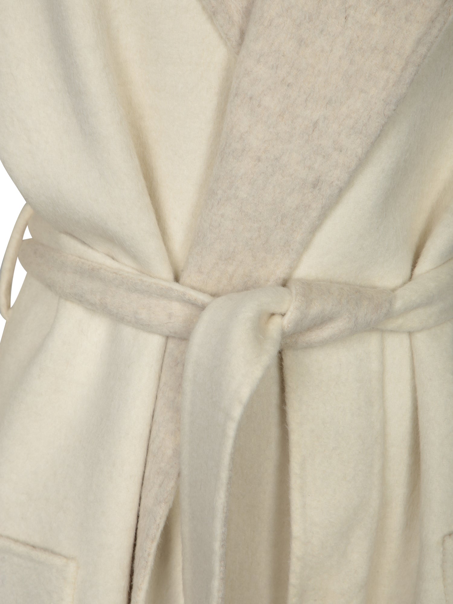 Soft fabric coat in cream beige, coordinated belt, front patch pockets.