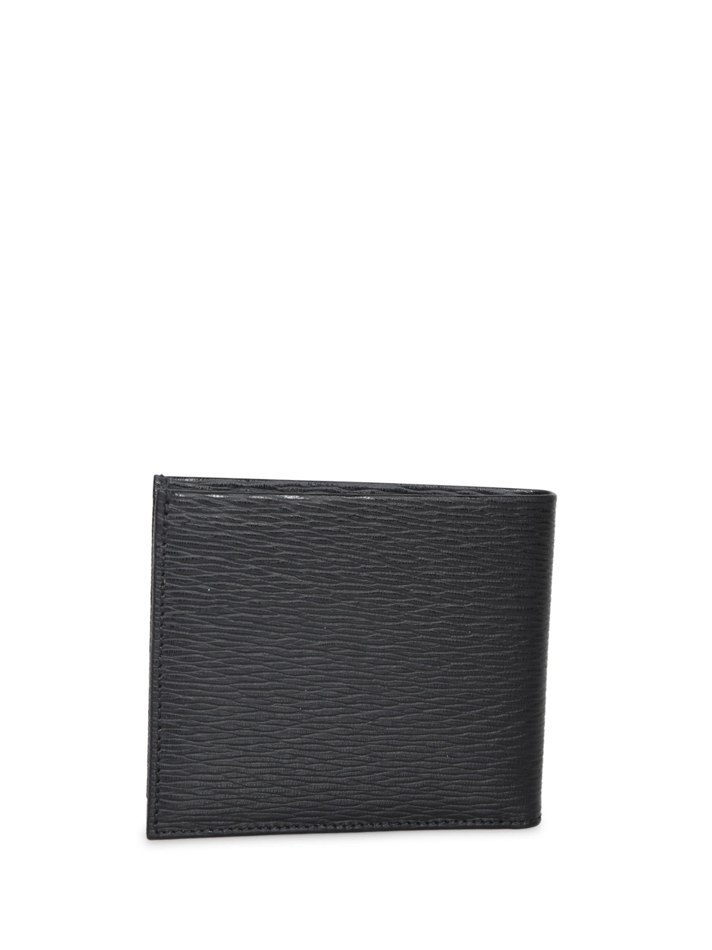 Calfskin leather wallet with texture. Frontal Ferragamo golden metal logo.