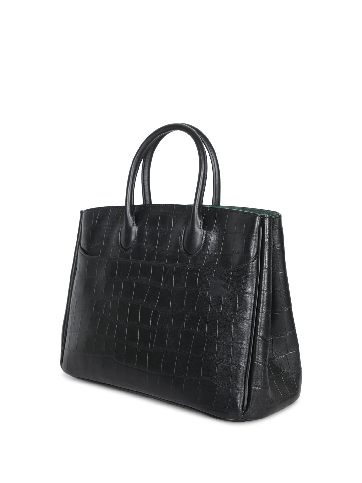 Crafted from high-quality leather with a crocodile effect finish. Features a top handle, removable shoulder strap, and a golden buckle closure.